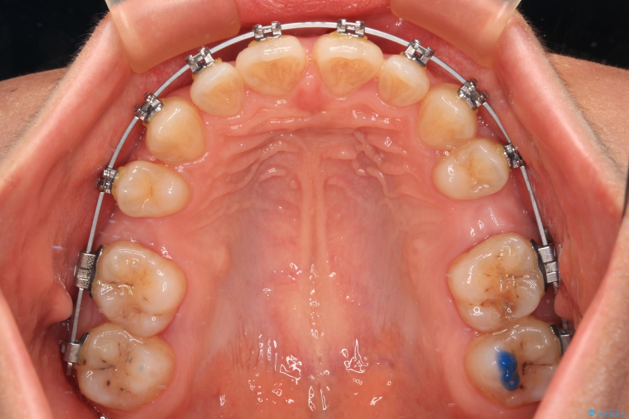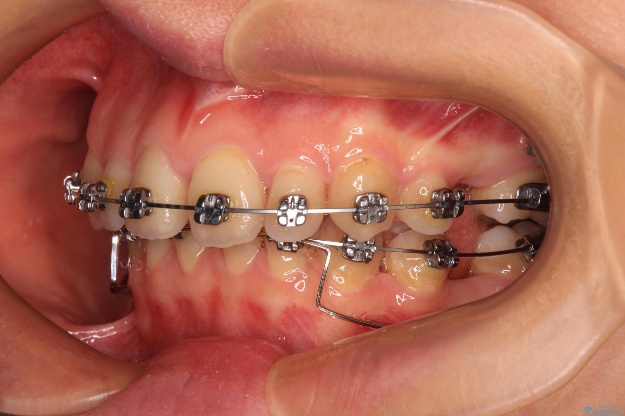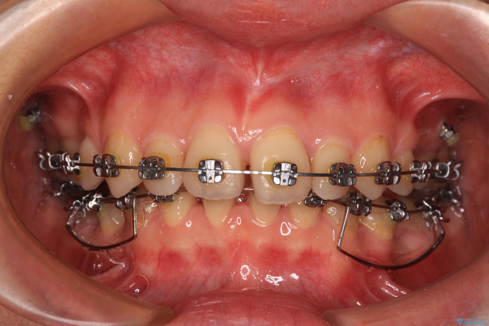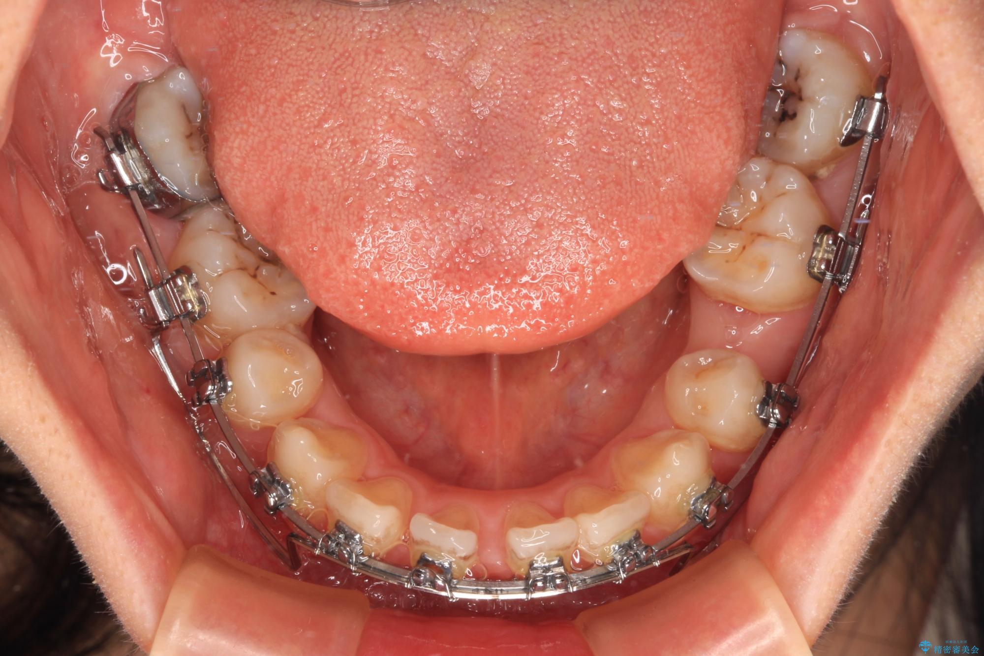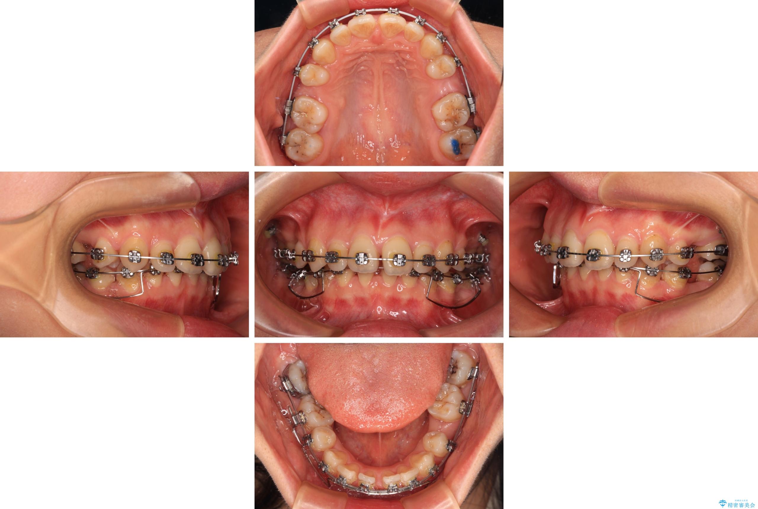 上下臼歯の咬み合わせ改善には補助装置を、深い咬み合わせ改善にはユーティリティーアーチを活用し、ワイヤー装置にて矯正治療を行うこととしました。