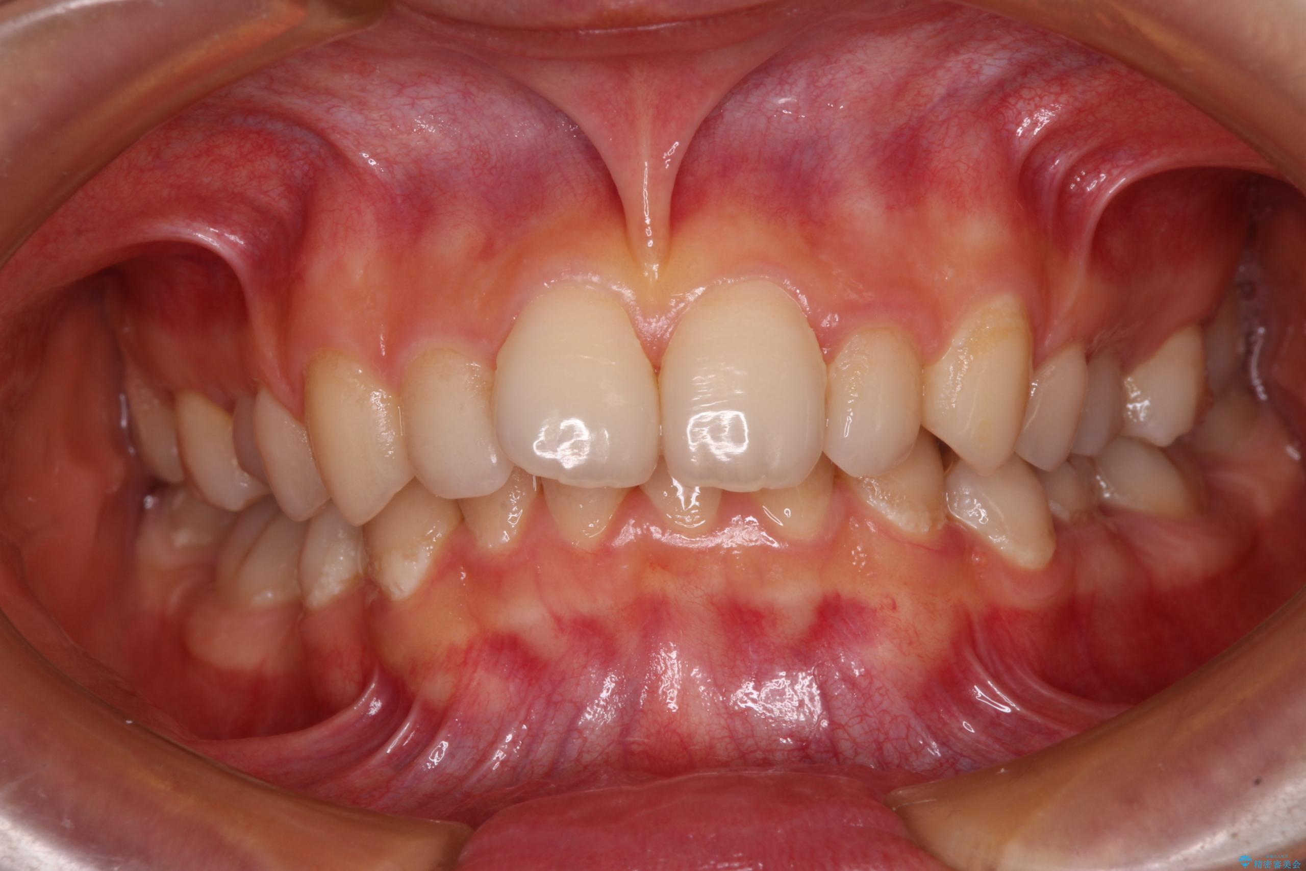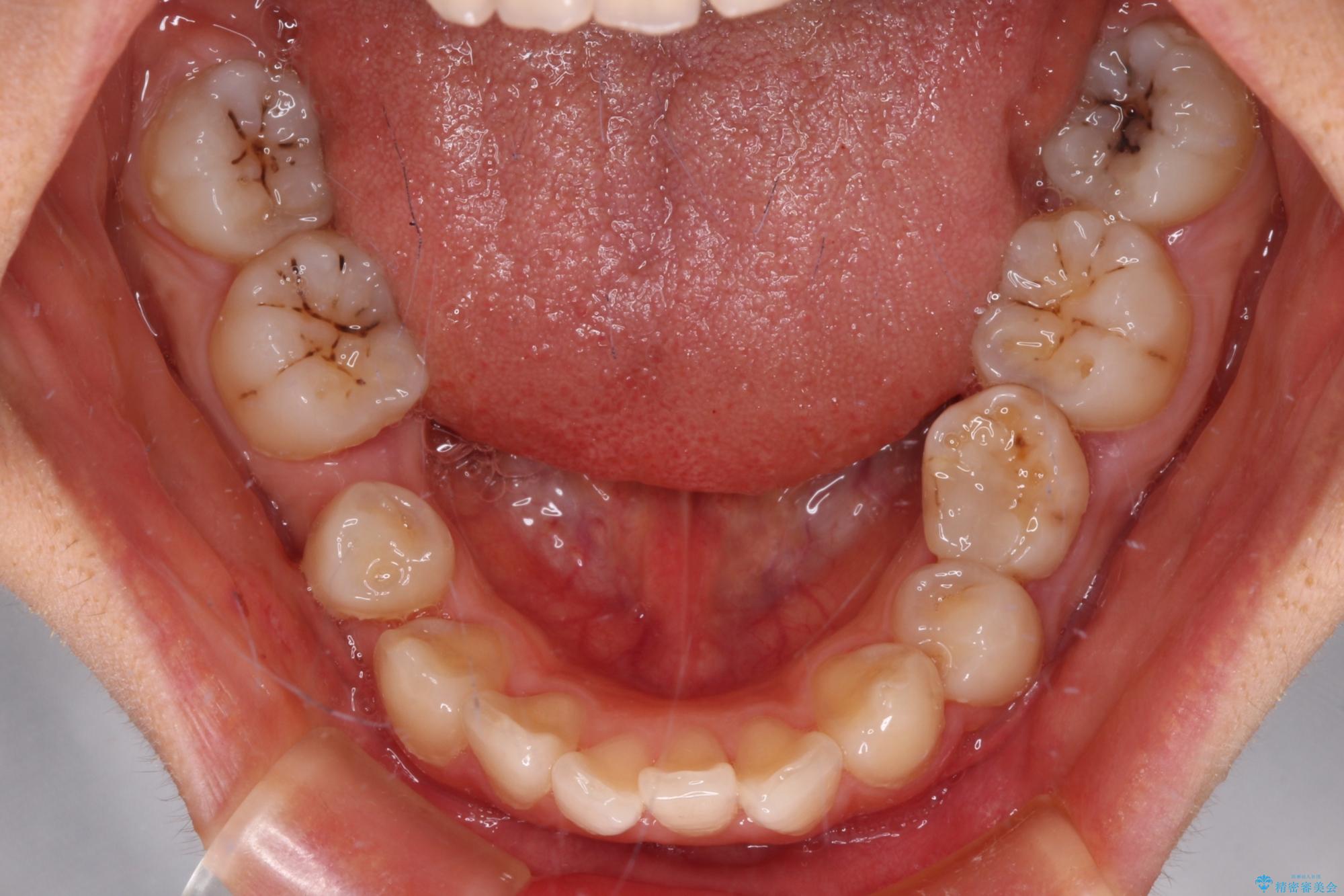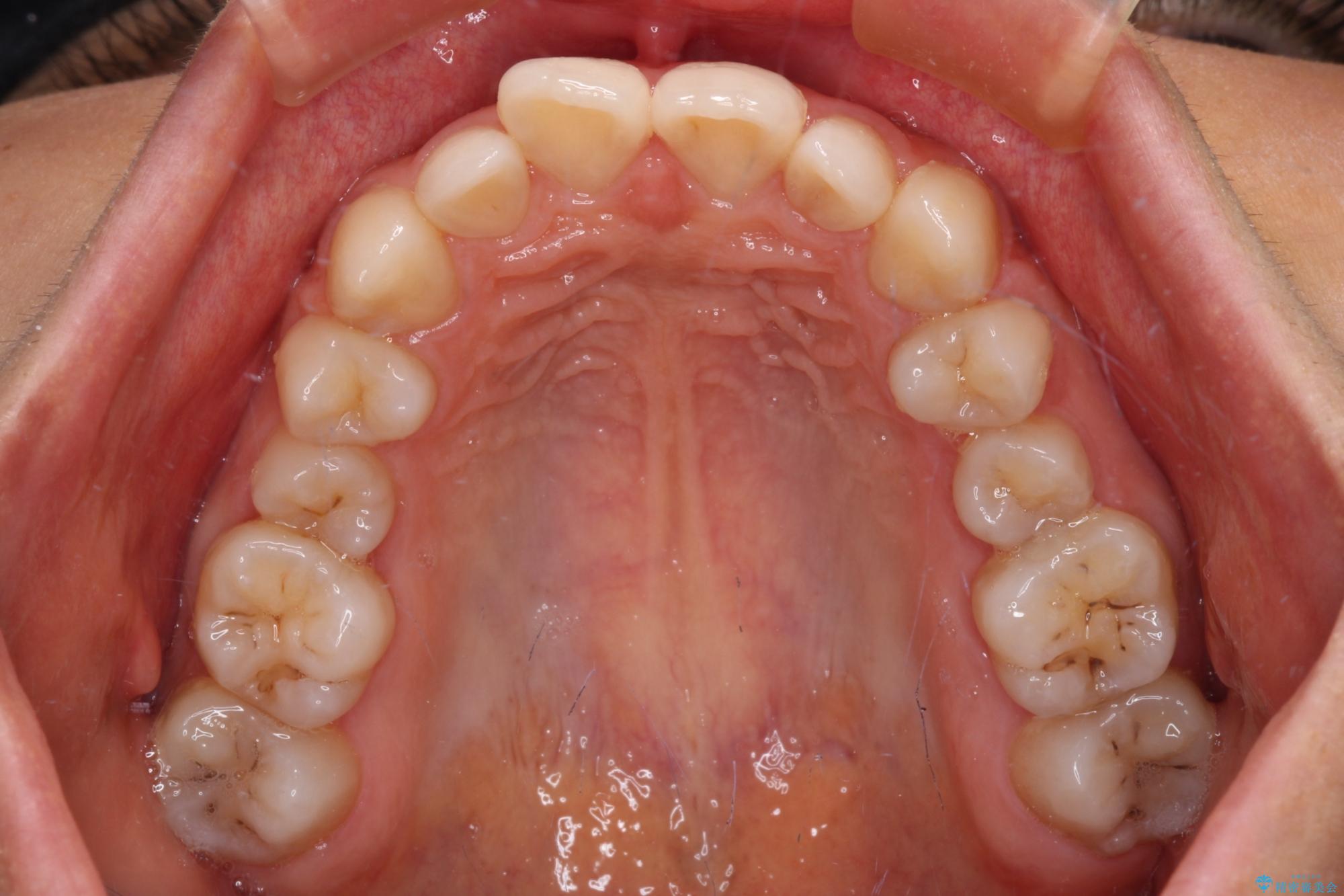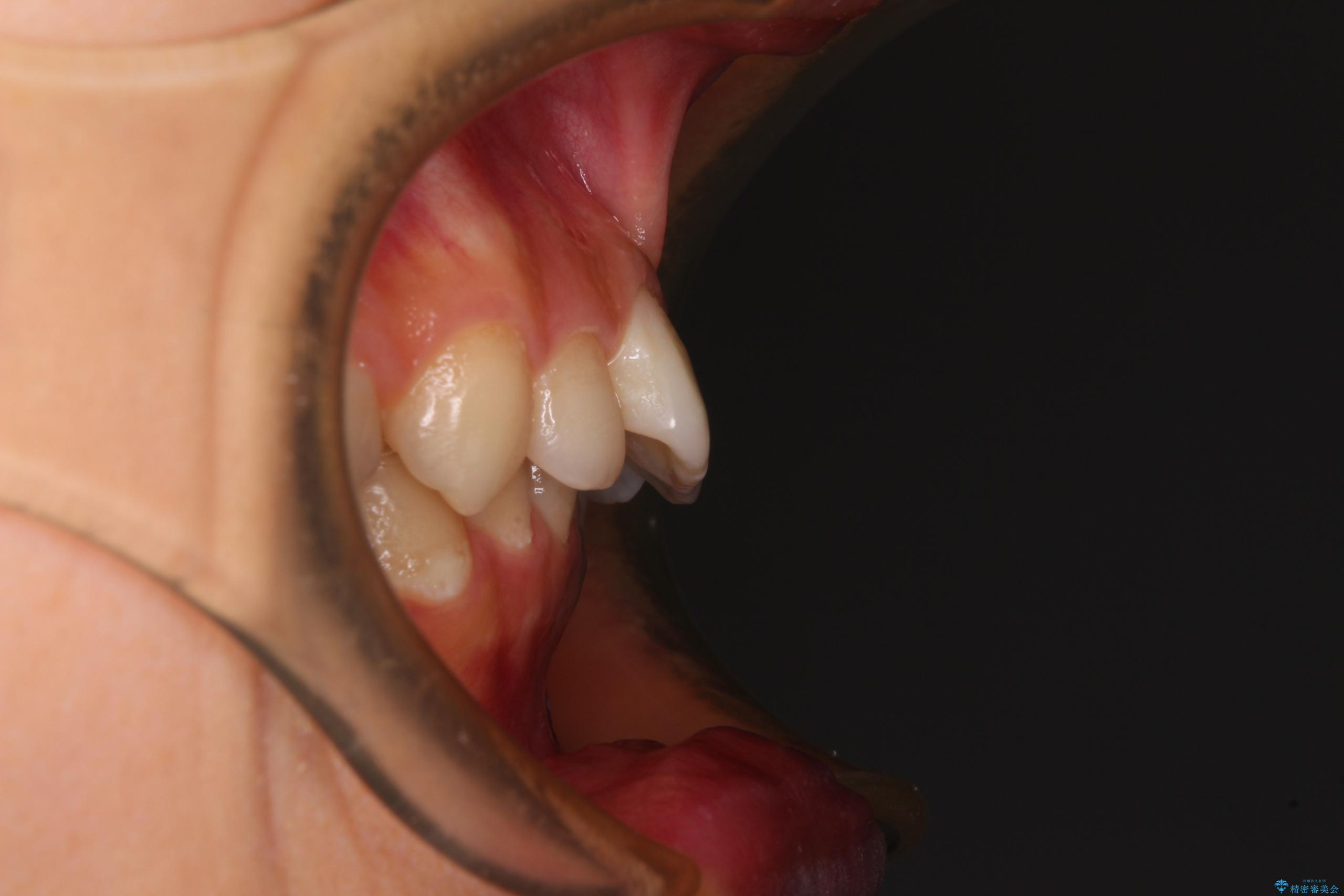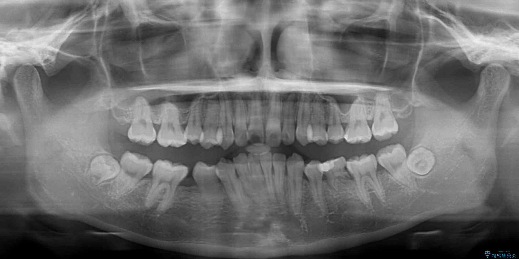 乳歯を残し、欠損部位のスペースを適正な幅に拡大し、インプラント補綴治療により歯列を整える治療も考えられましたが、ご本人から飛び出している前歯をどうしても引っ込めたいとの要望があったため、残存乳歯ならびに上顎左右第二小臼歯を抜歯して、歯列を整えることとしました。