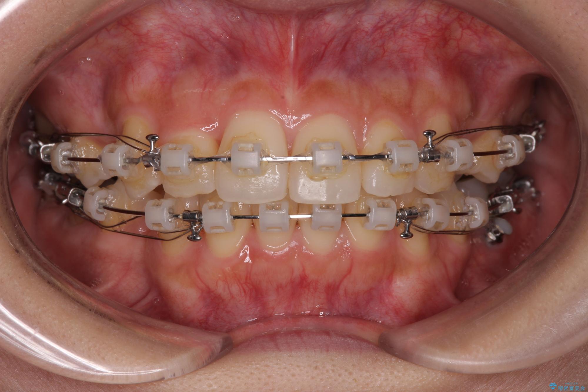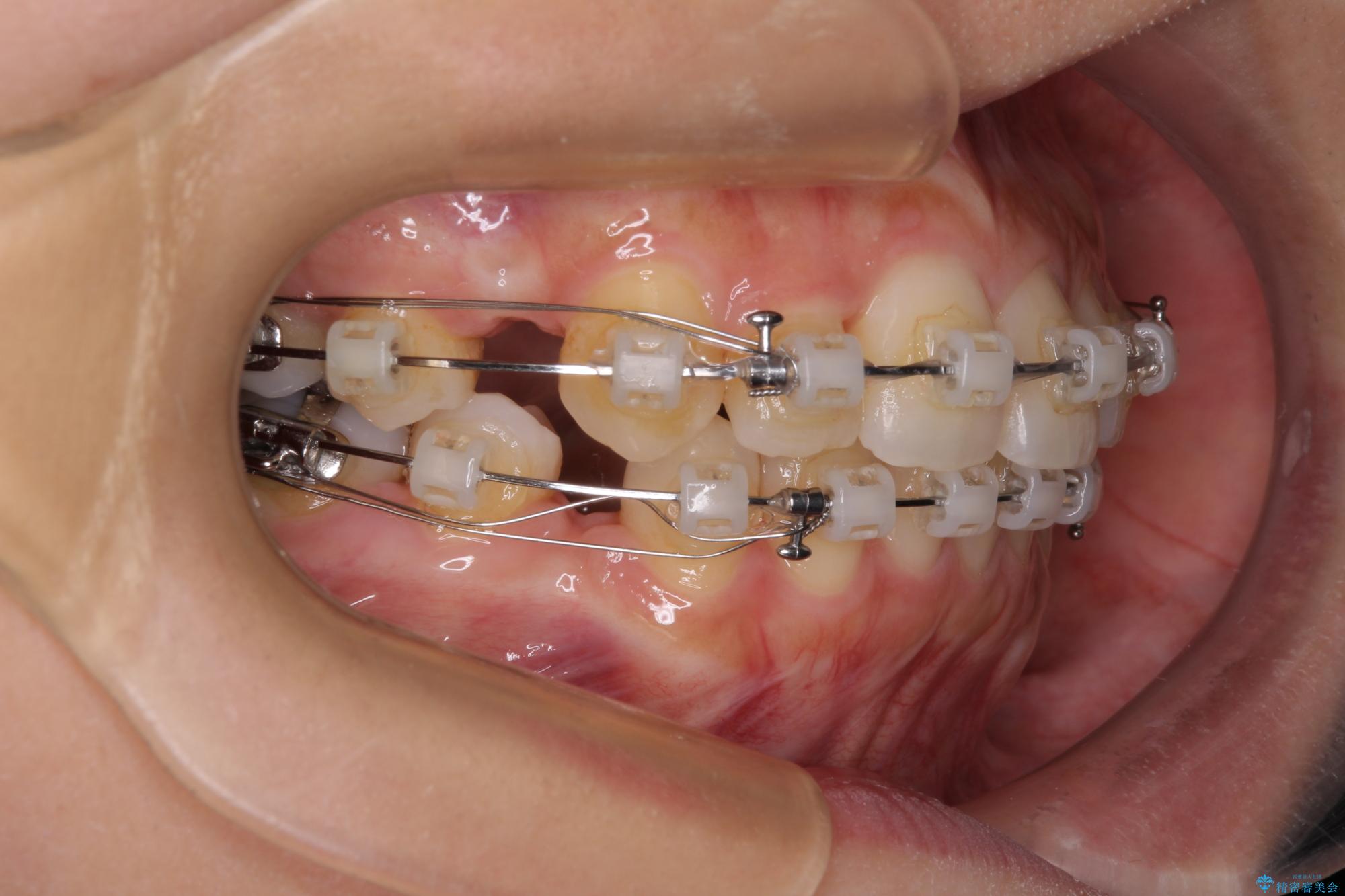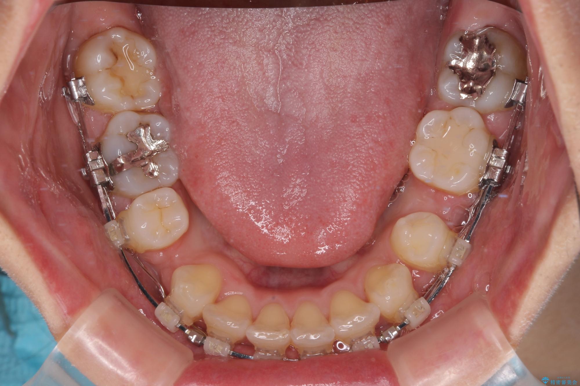 しかしながら。そのまま叢生を解消すると横顔が突出した印象になる可能性が高かったため、上下左右の小臼歯4本を抜歯して、ワイヤー装置にて矯正治療を行うこととしました。