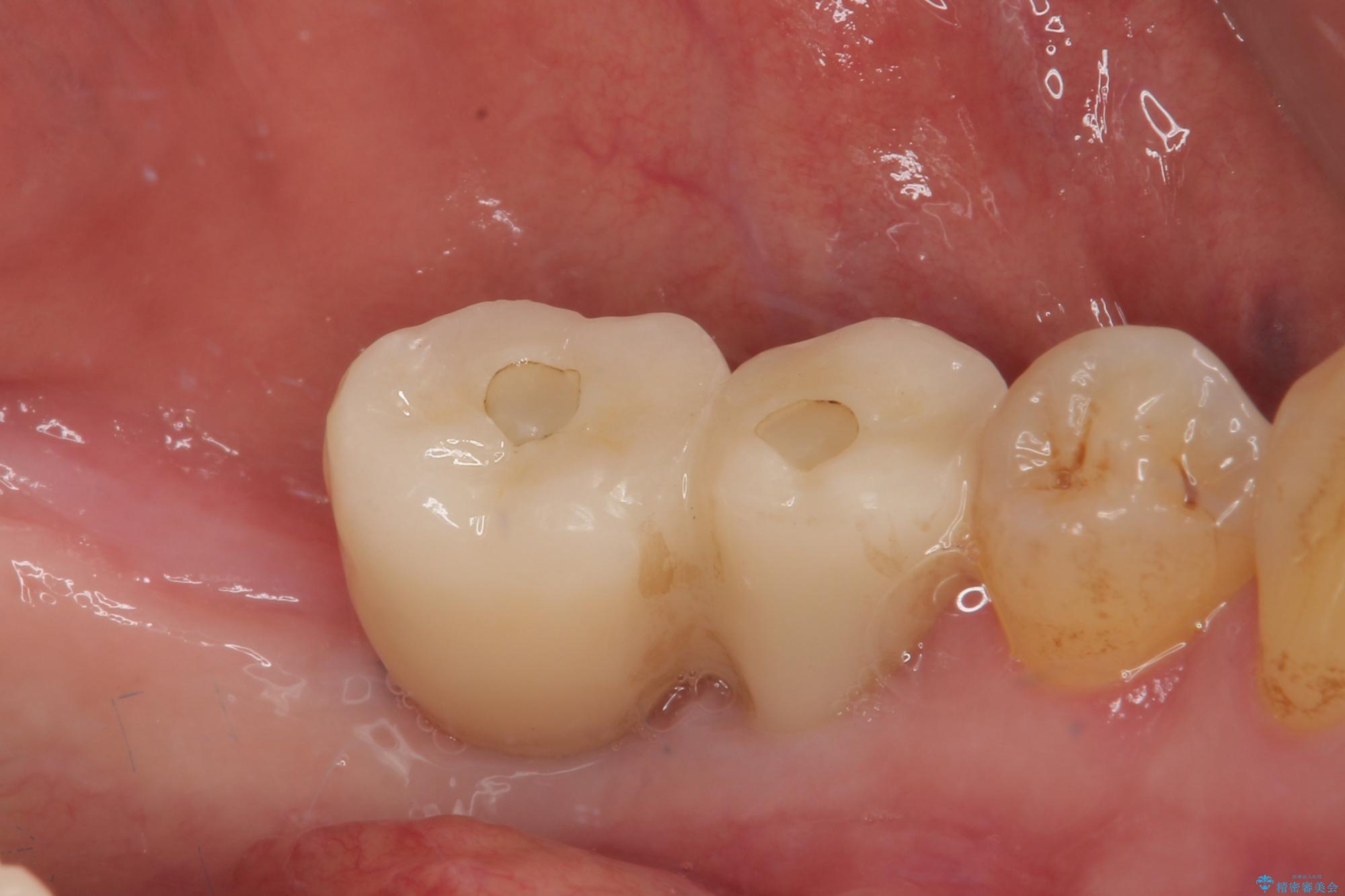 連結の手前の歯は歯根が破折して、クラウンが歯から外れており、奥の歯は動揺により歯根周辺の骨が吸収している状態でした。