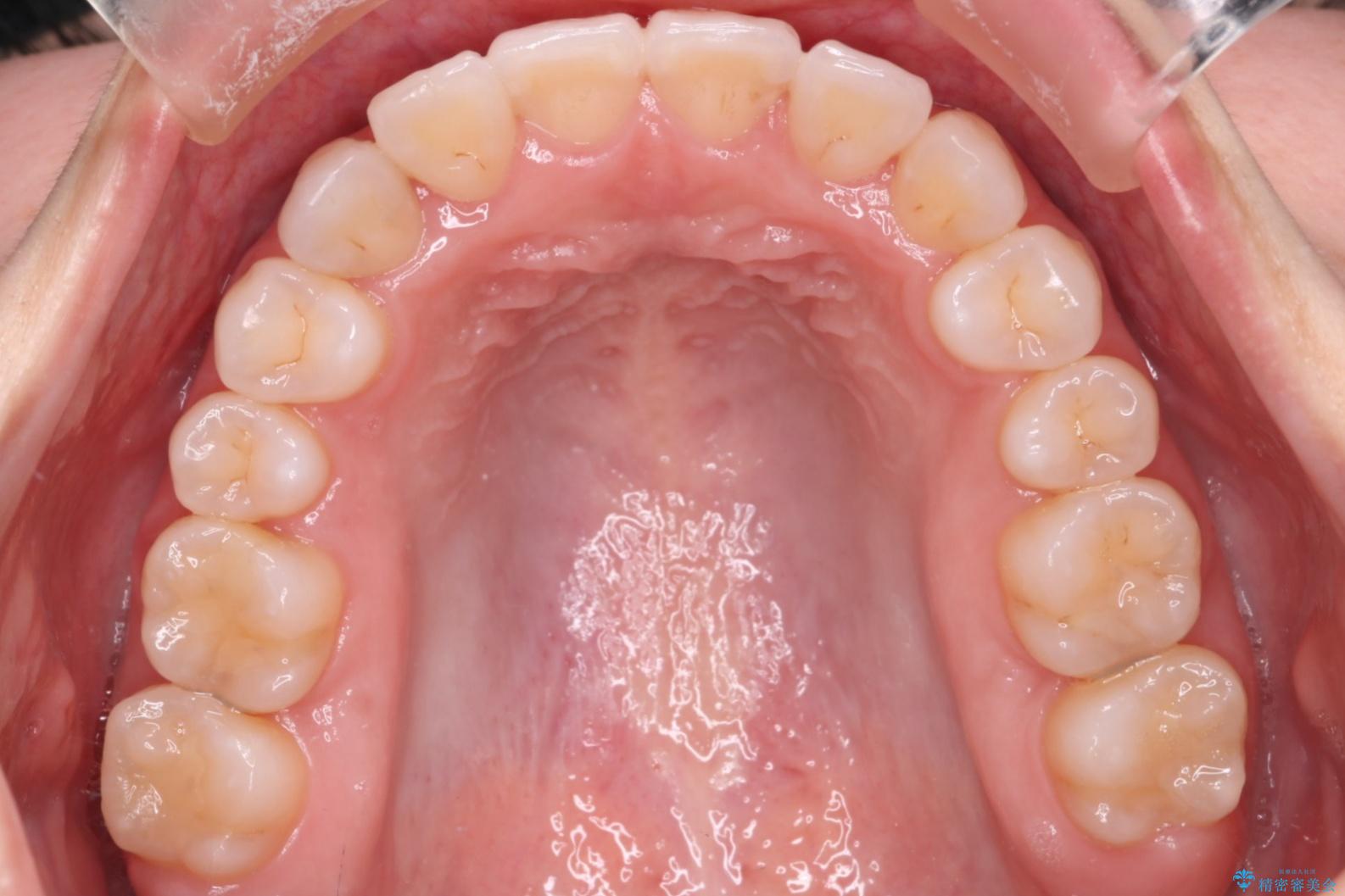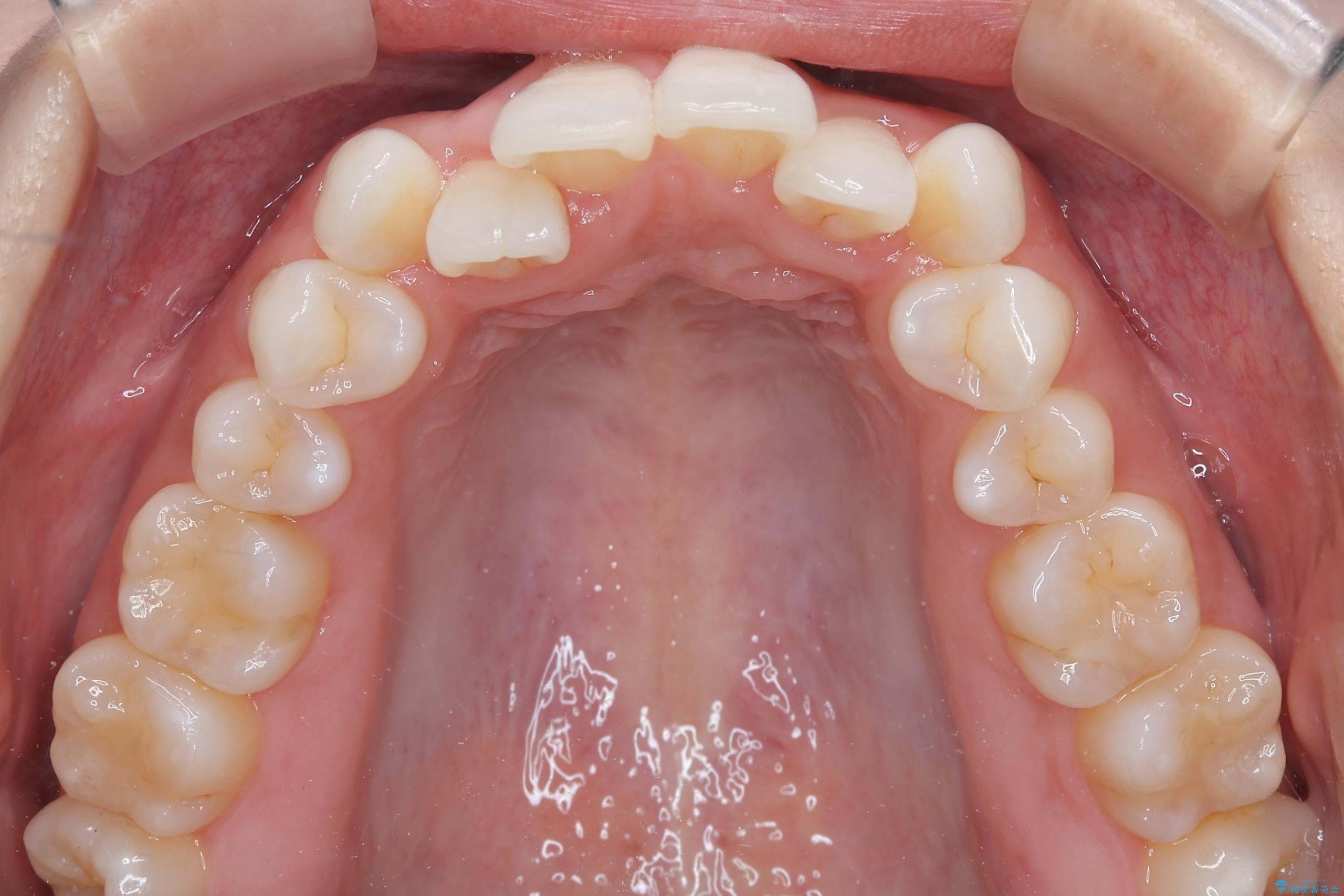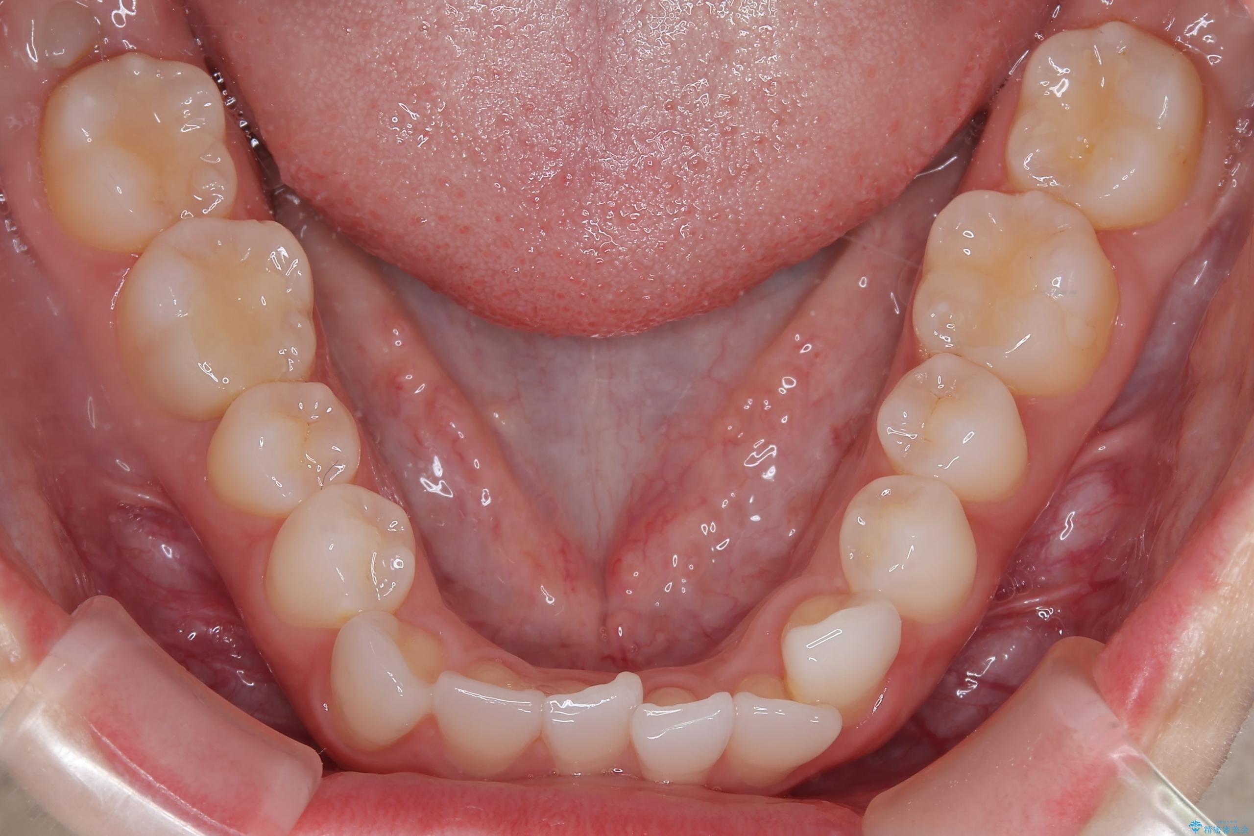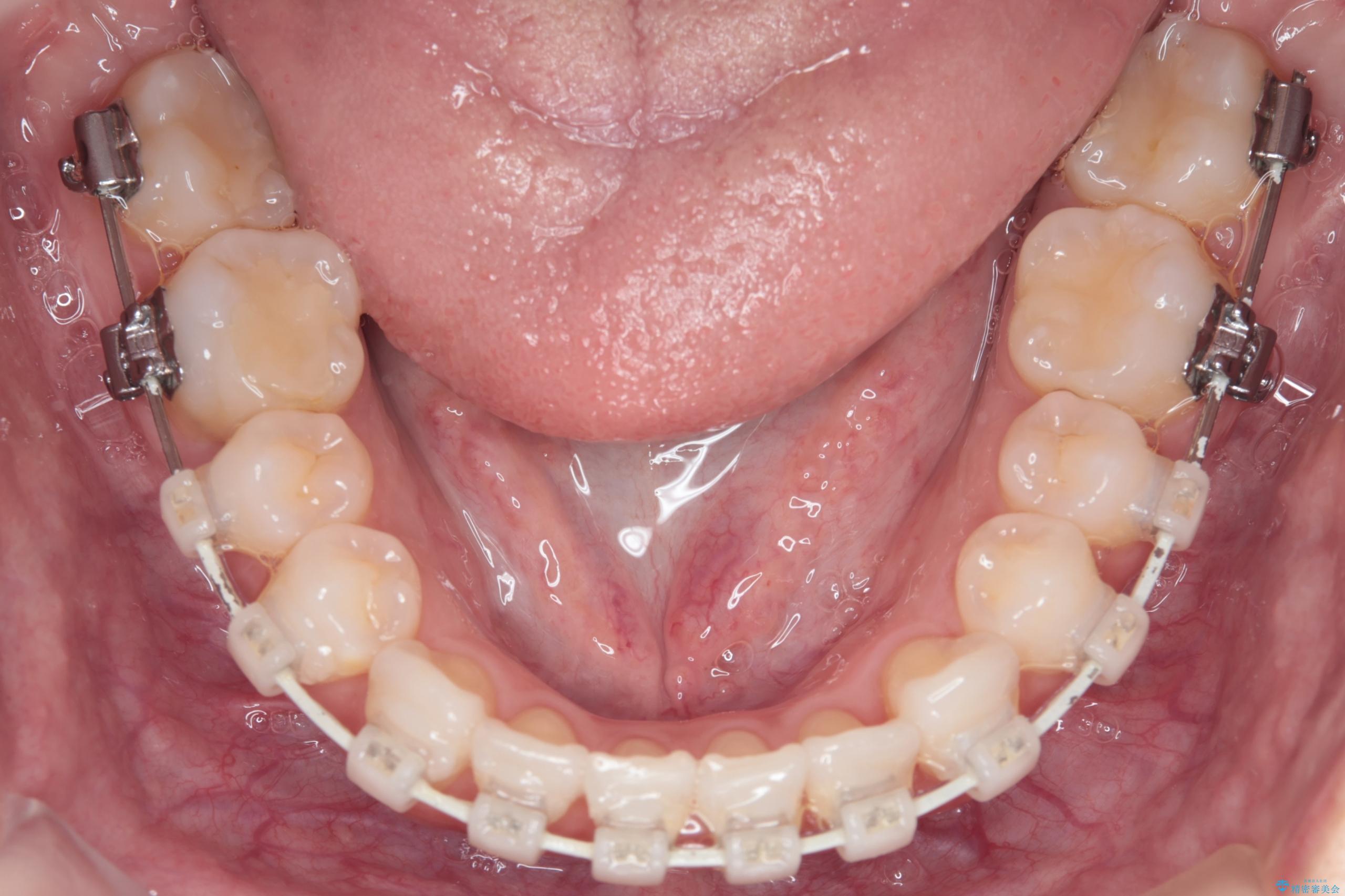 上の親知らずを抜歯し、リンガルアーチを用いて臼歯遠心移動しながらIPR(歯と歯を削る処置)を行いスペースを確保し