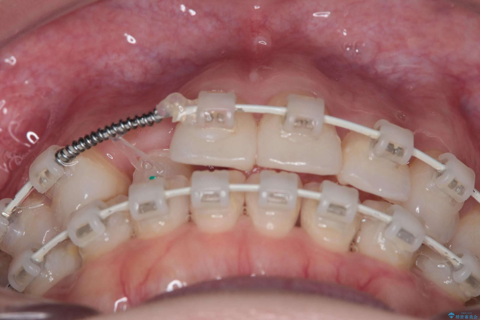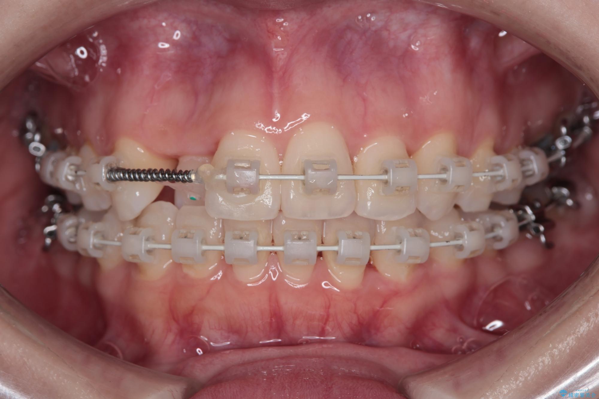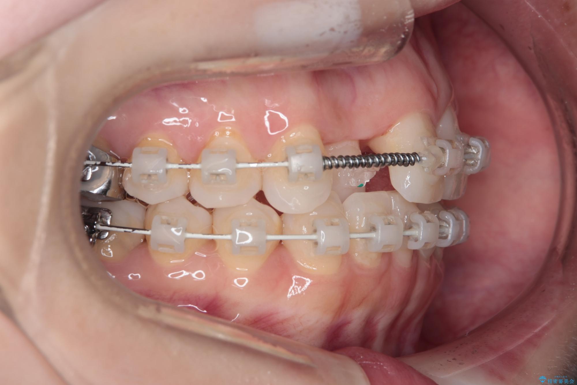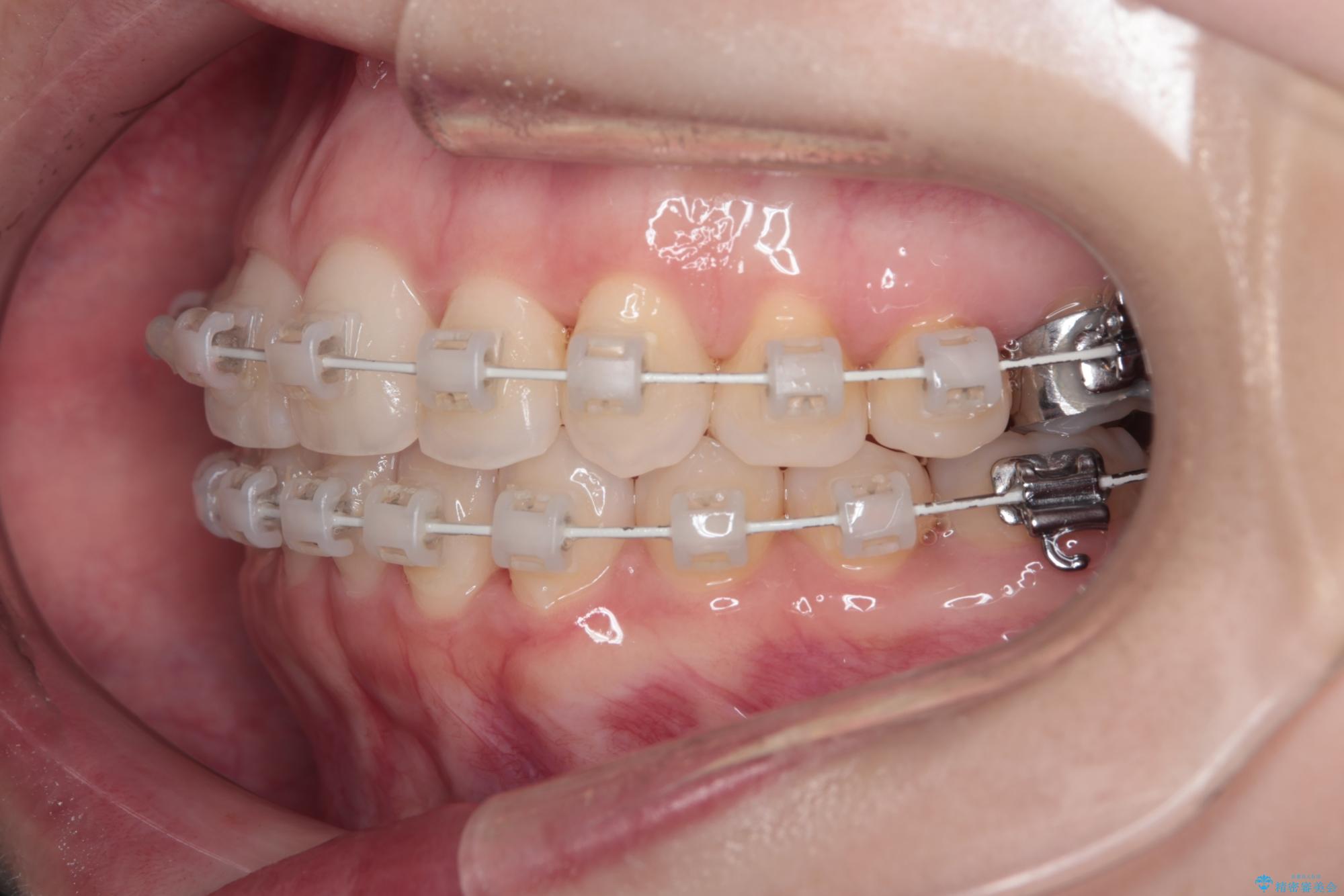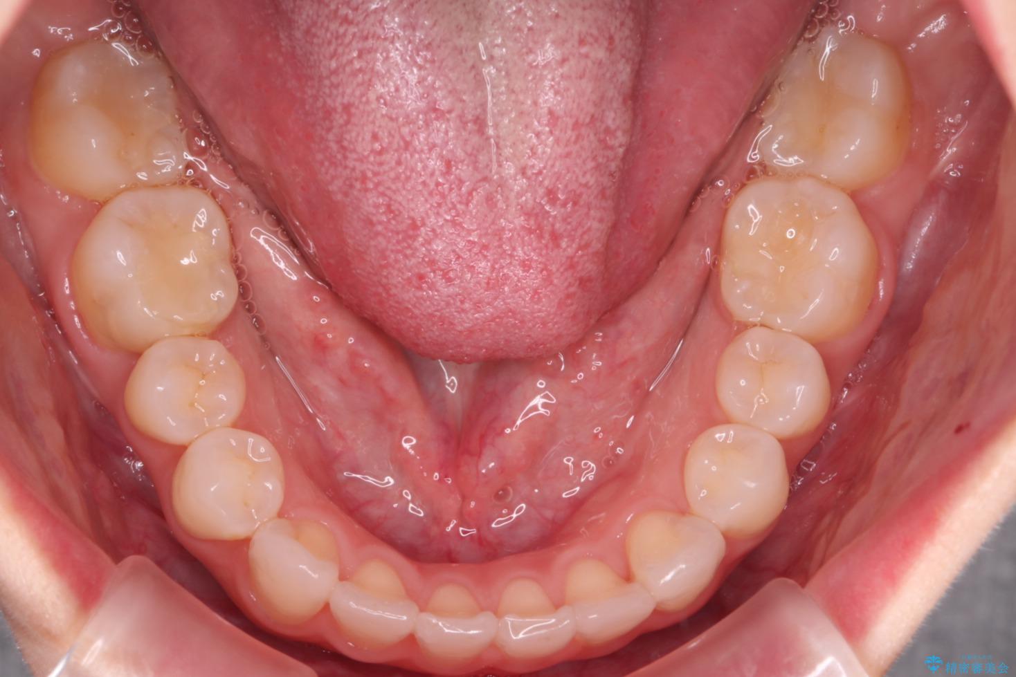 上の親知らずを抜歯し、リンガルアーチを用いて臼歯遠心移動しながらIPR(歯と歯を削る処置)を行いスペースを確保し