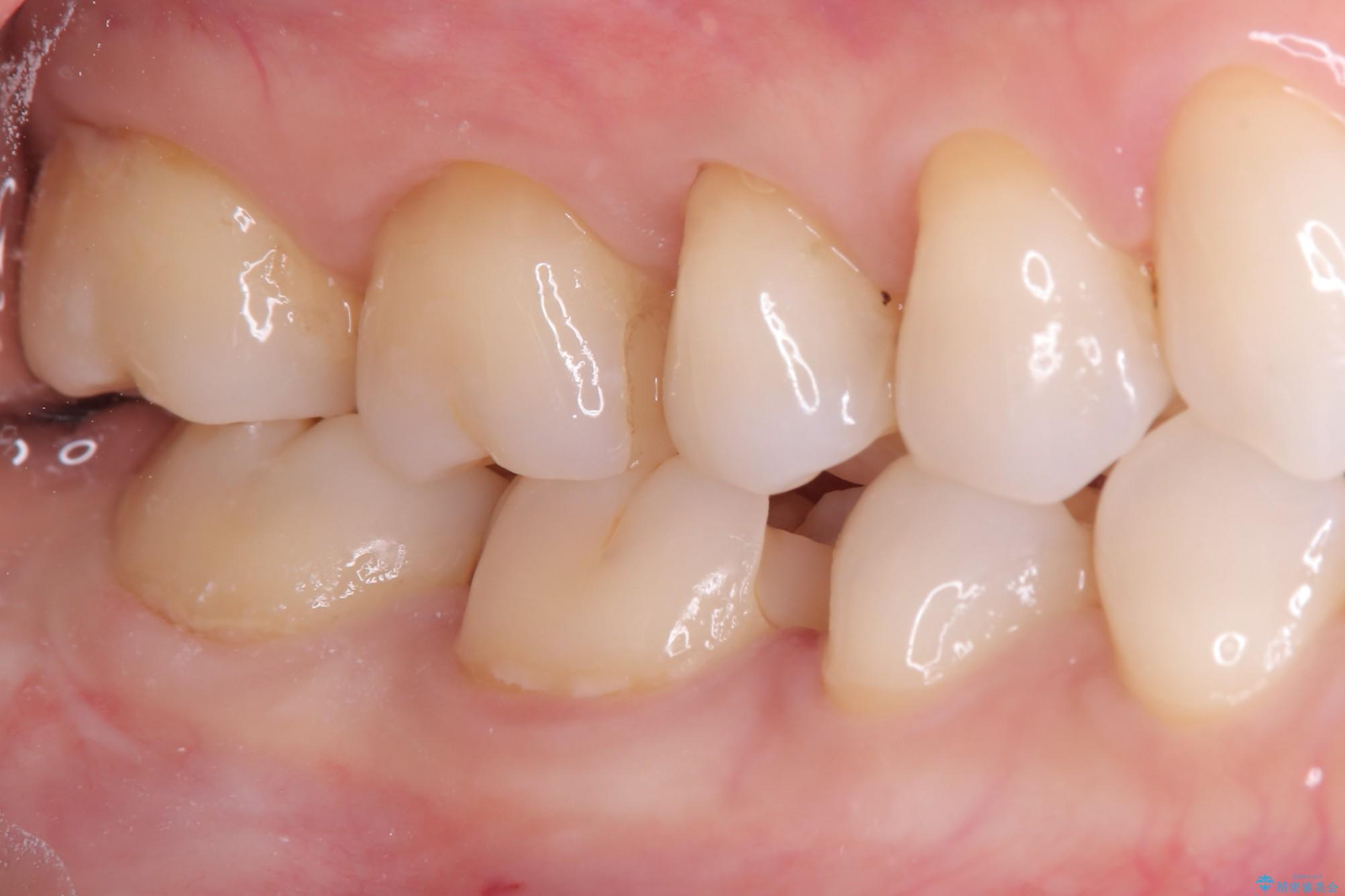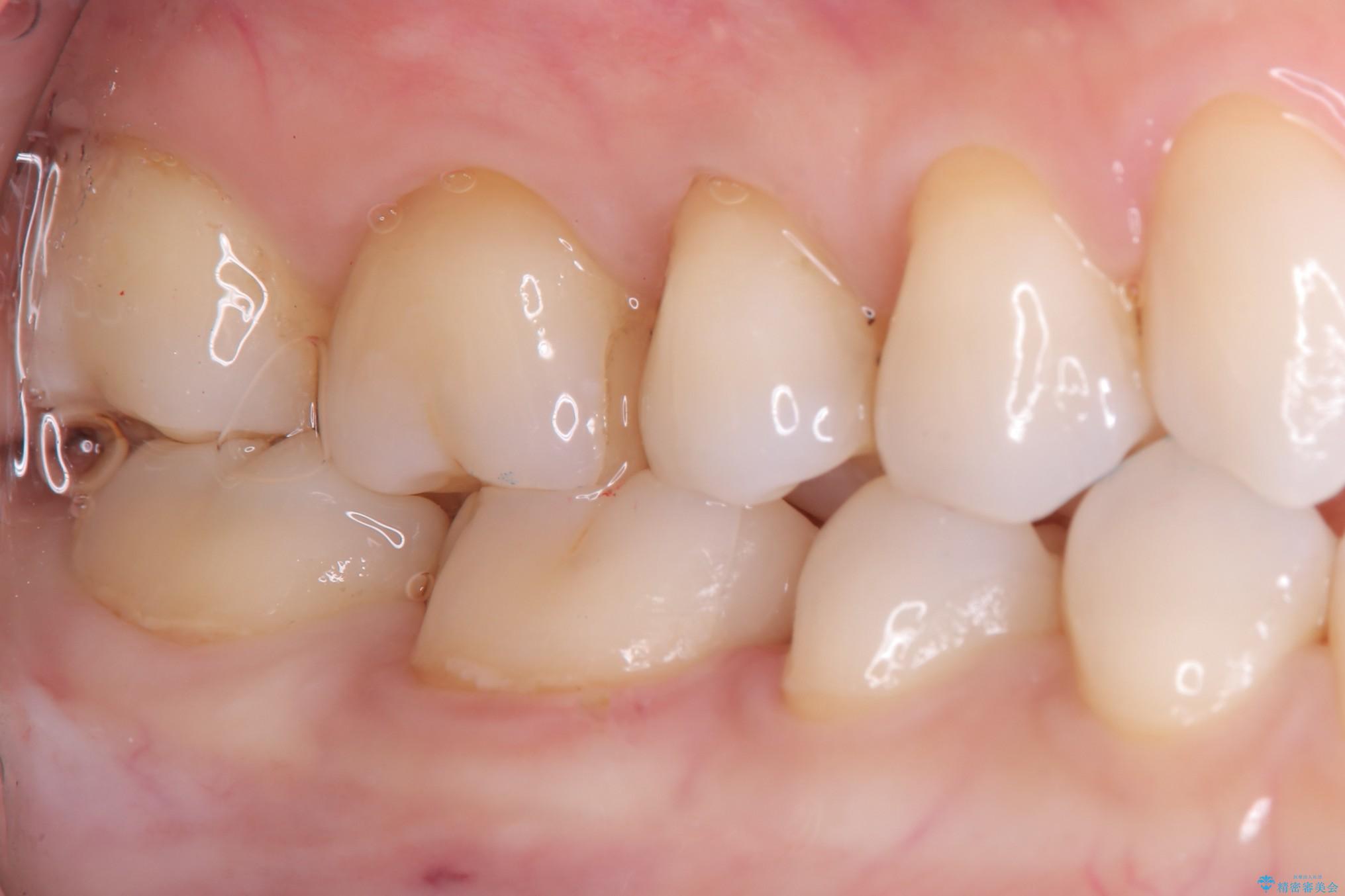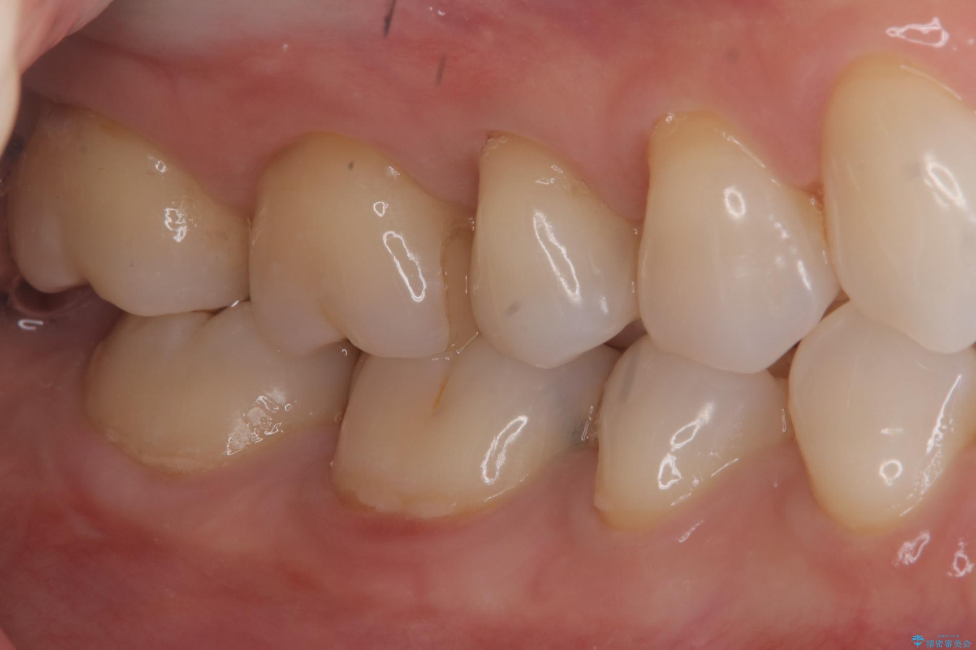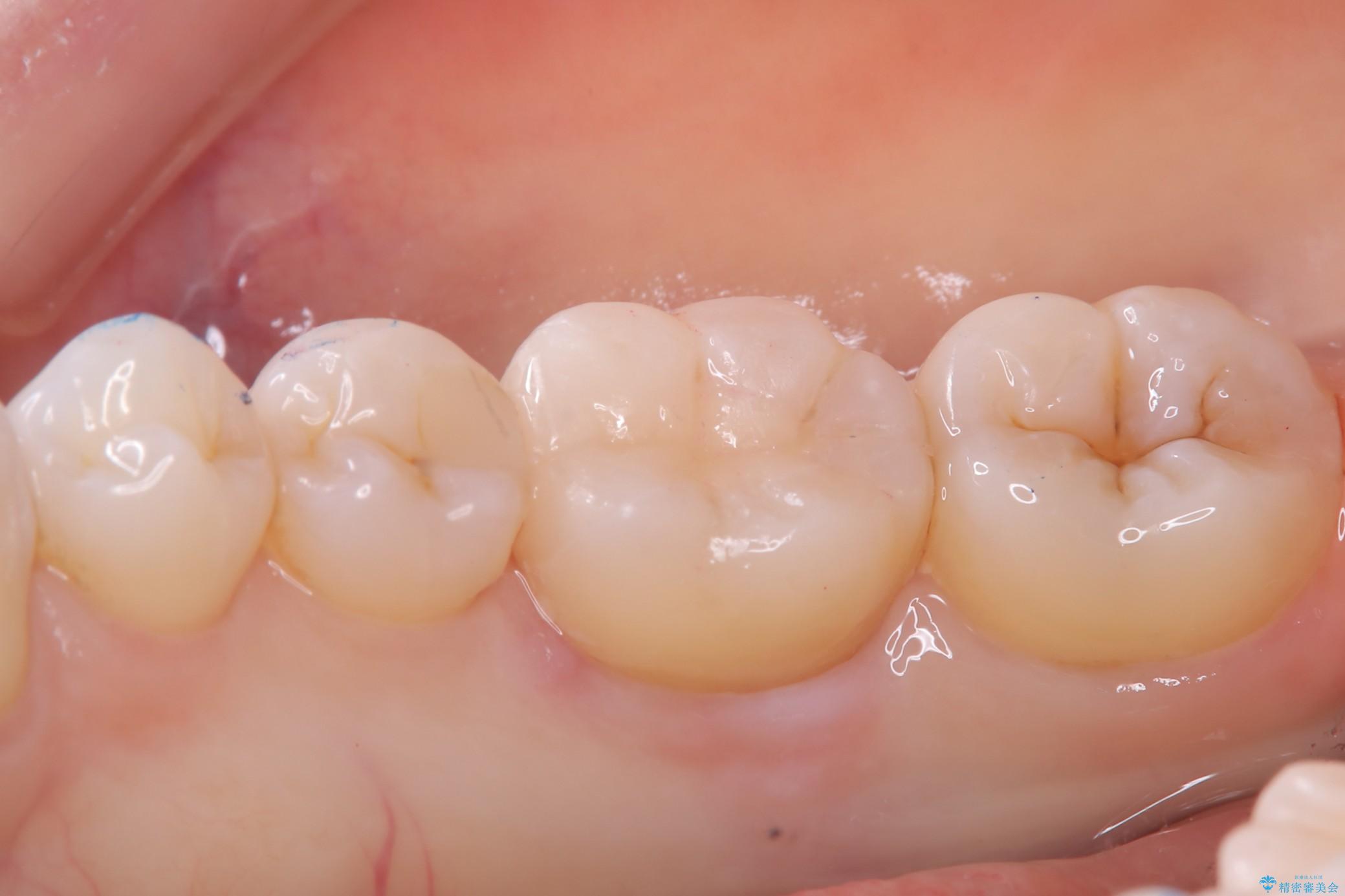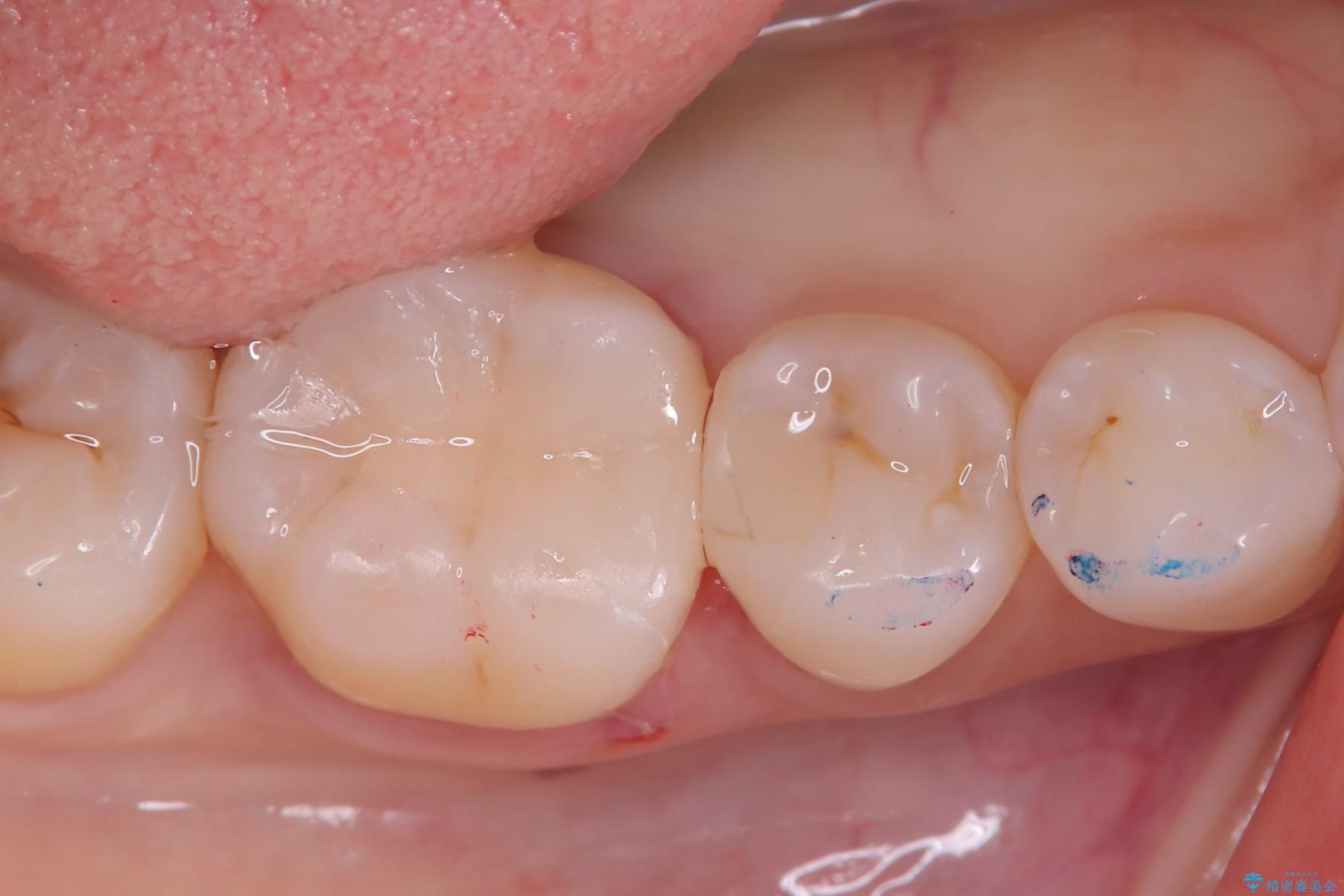 右下6の近心にう蝕が認められう蝕の範囲が大きかったため、歯冠形態の再現性の高いインレーでの修復とし、材質は審美性、清掃性に優れたセラミックを選択しました。