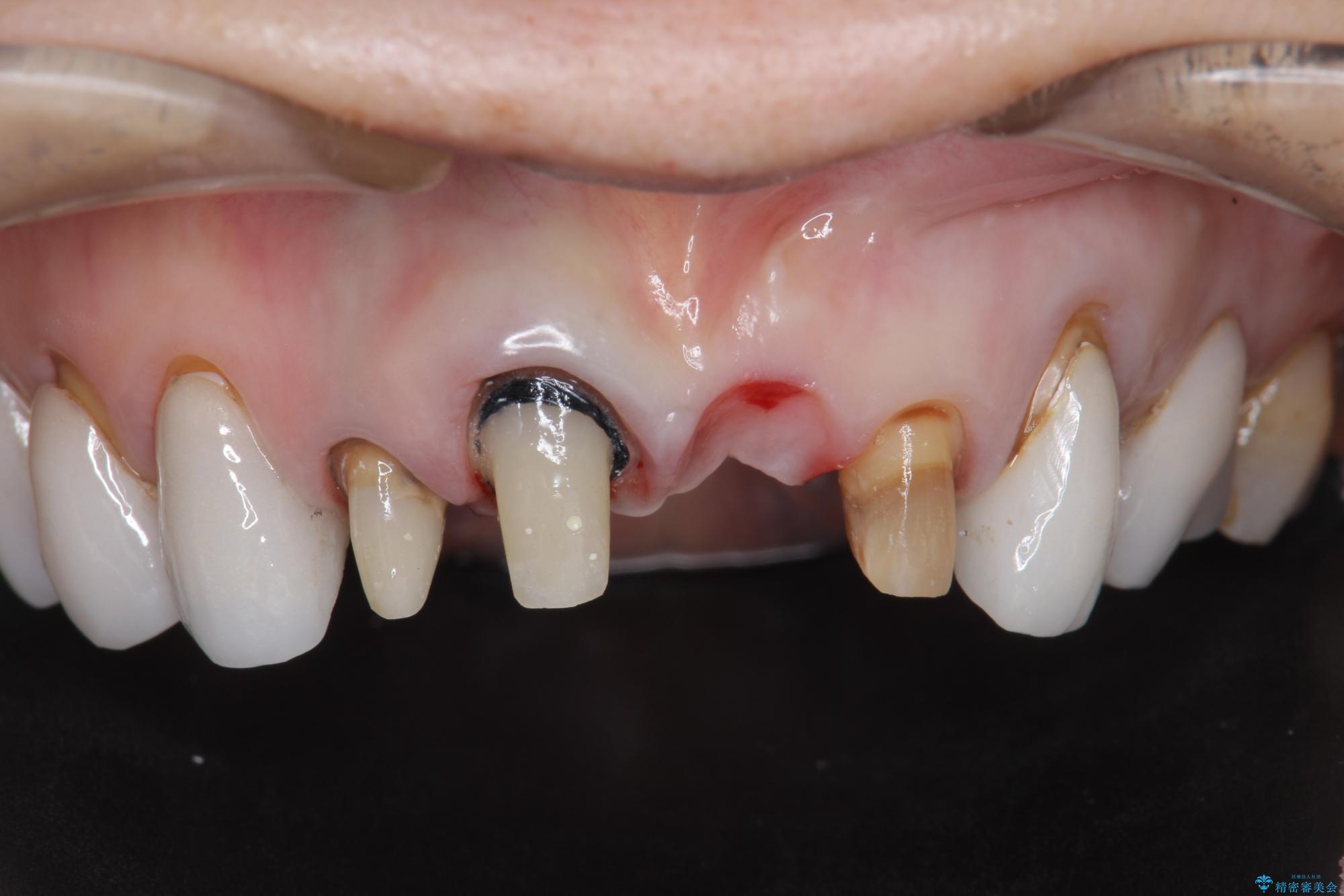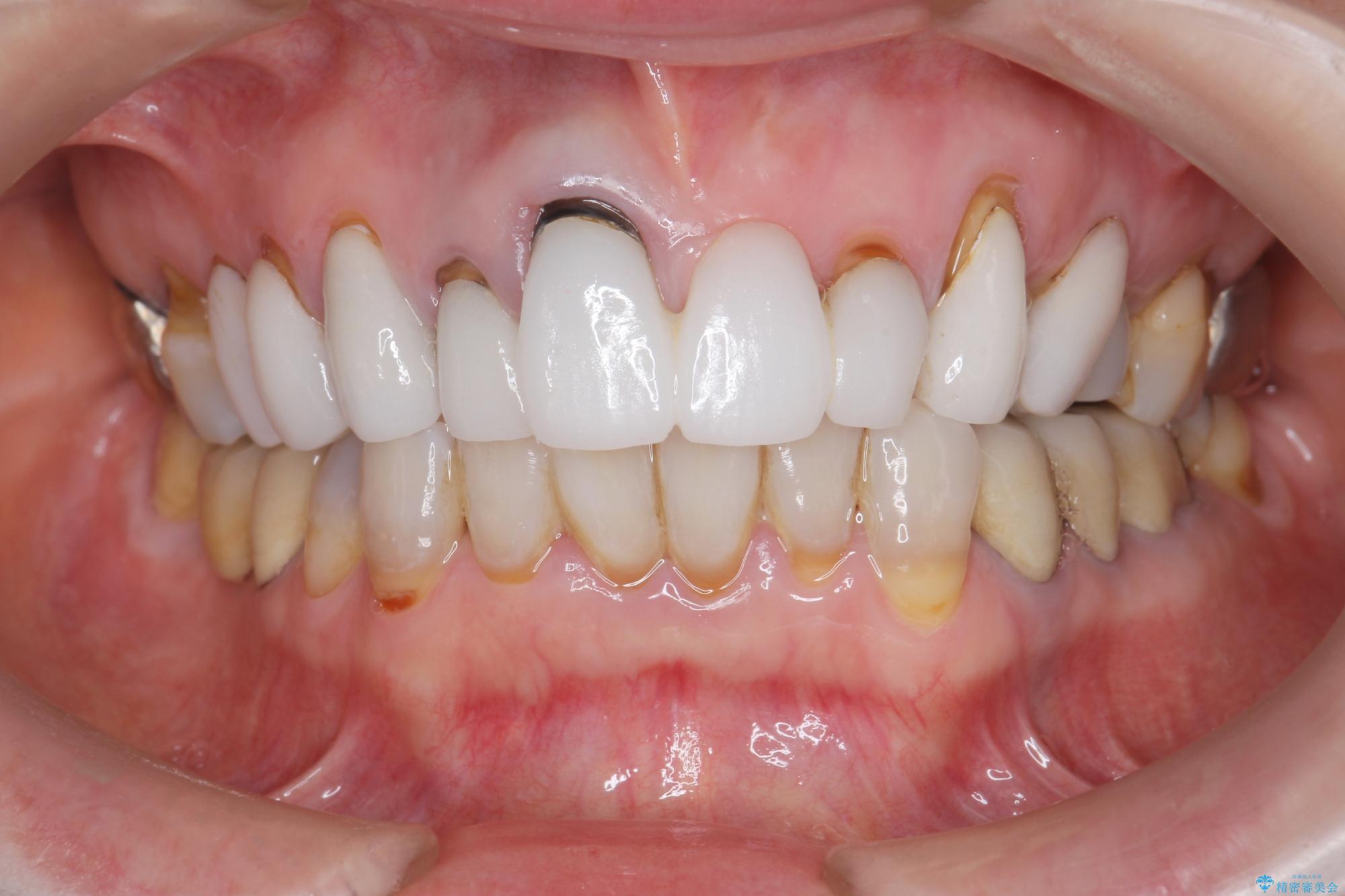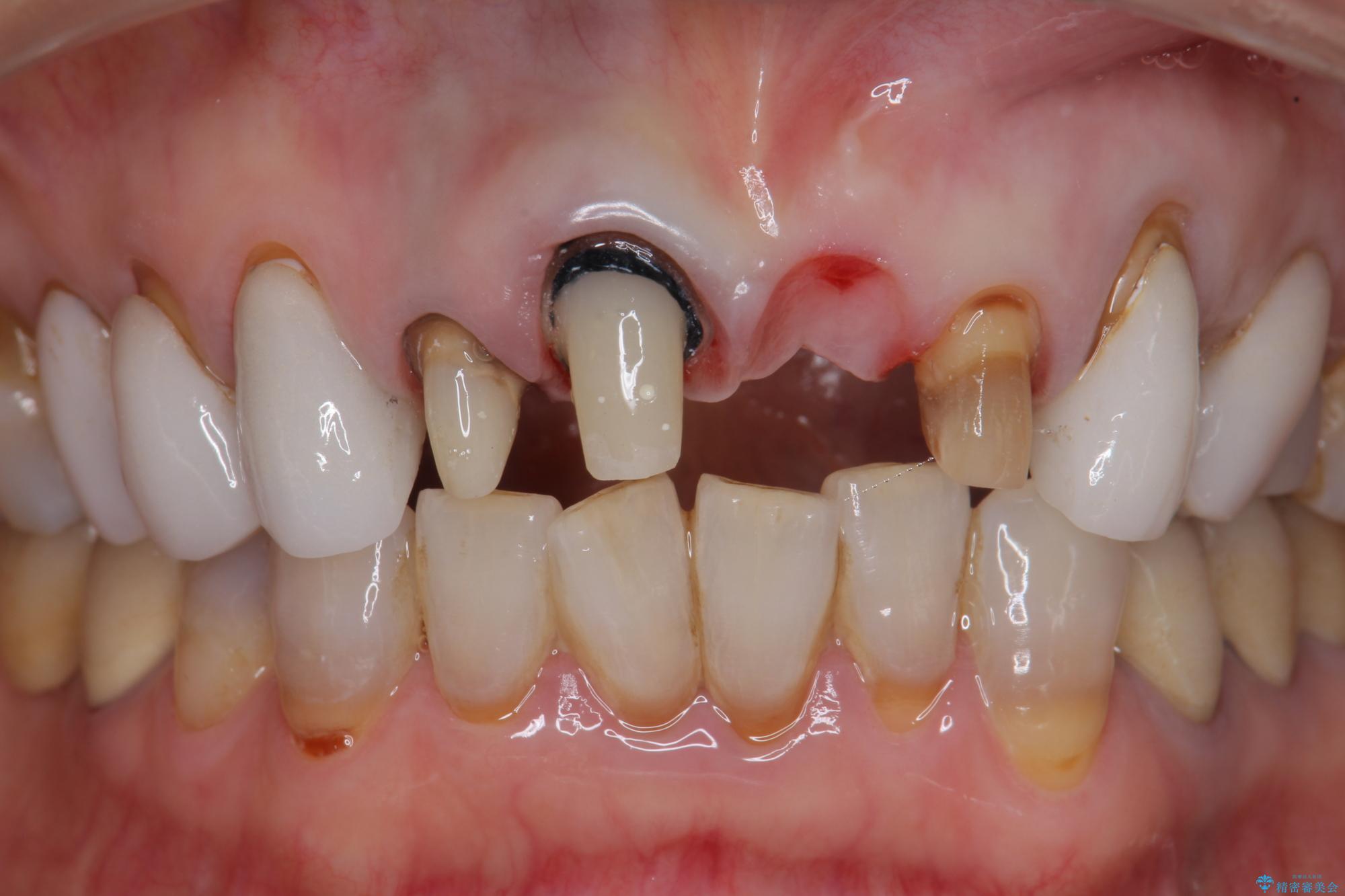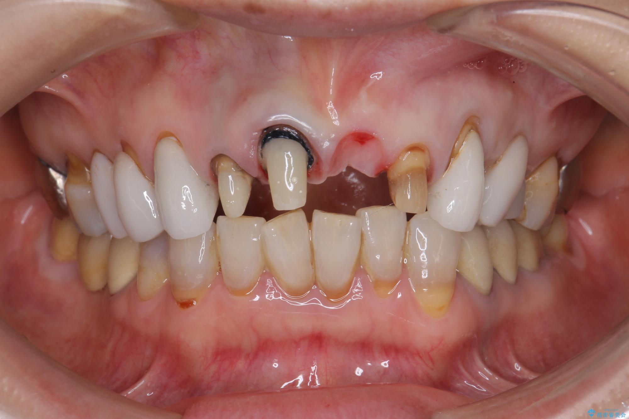 歯ぐきの位置が変化しクラウン下の歯が見えるようになってしまったことで、審美障害が生じている状態です。