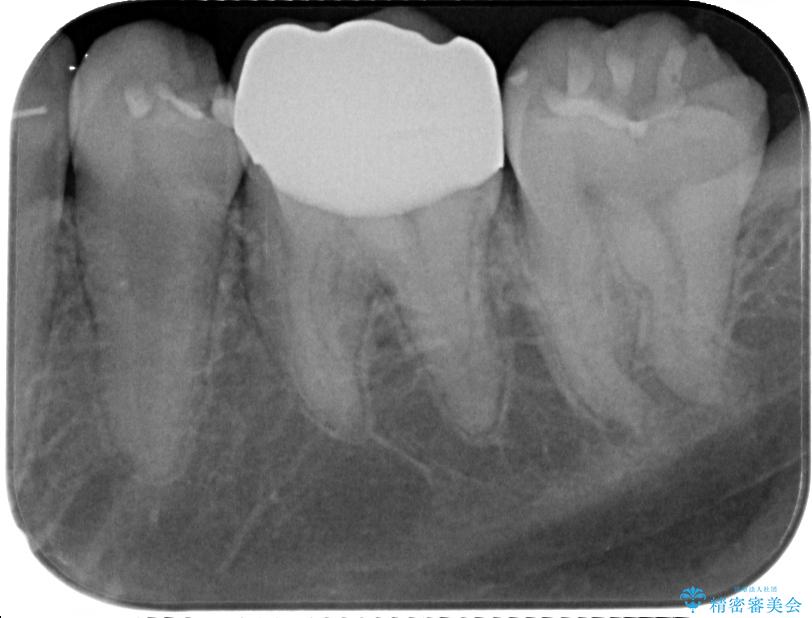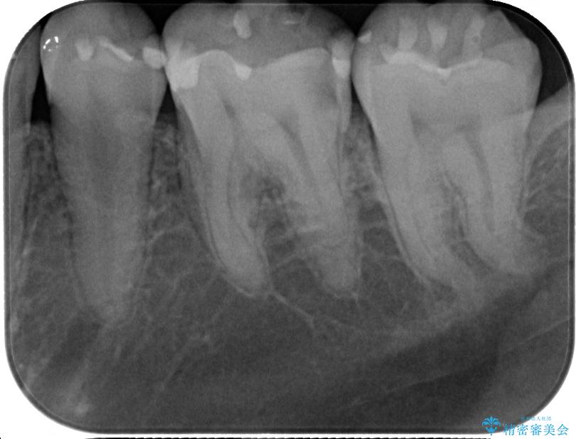 - 当院で矯正治療を終えて、左下が虫歯になっている気がするとのことで来院された患者様です。レントゲン検査の結果、コンポジットレジンによる修復箇所が複数行われており、詰め物の下に虫歯を認めました。