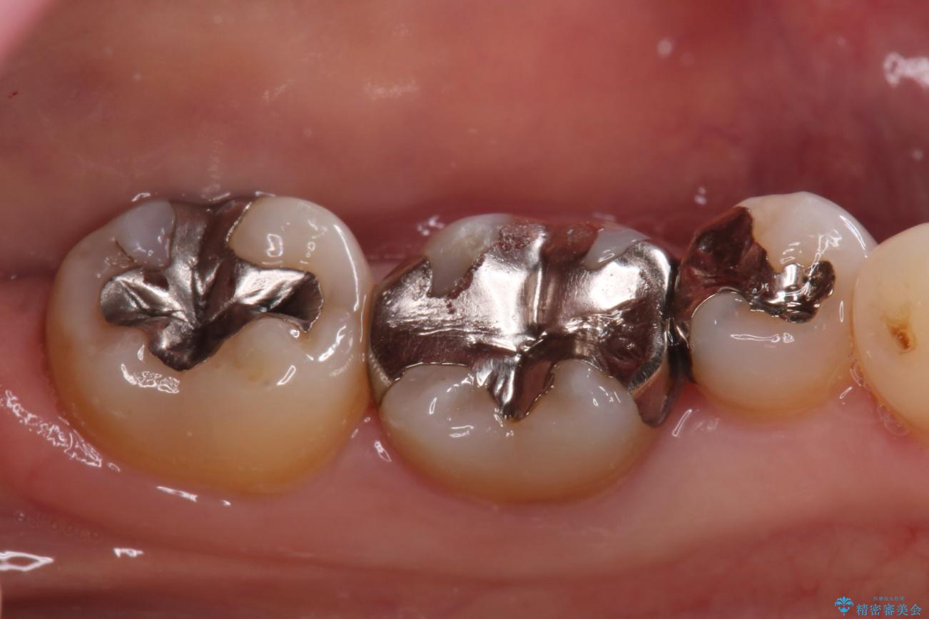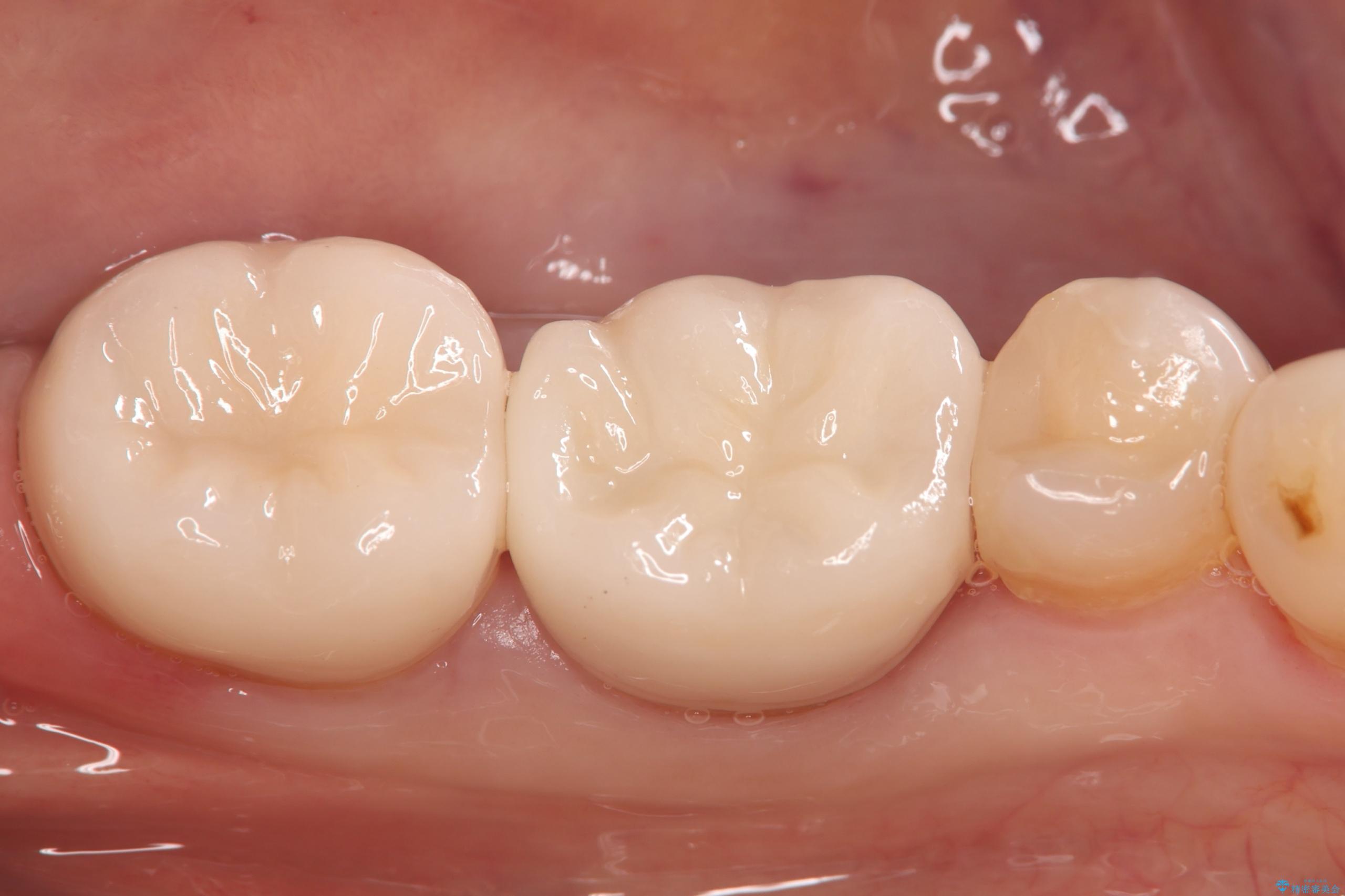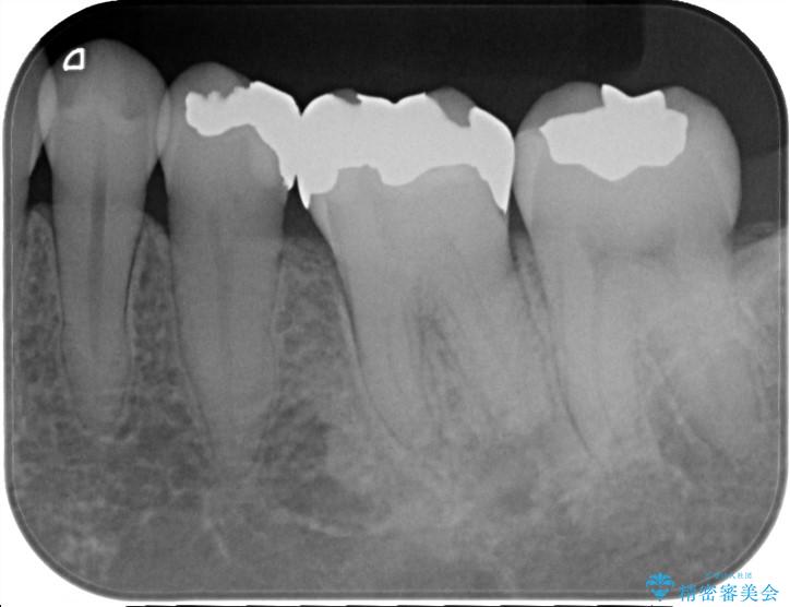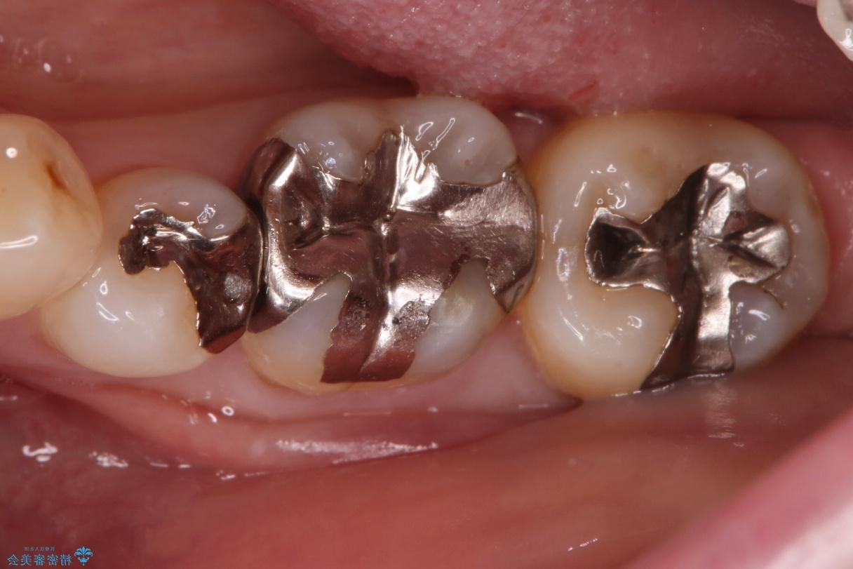 - ご友人との会話中などに、下の歯に入れてあるメタルインレーが見えてしまうのが気になり、やり変えを希望された患者様です。審美性、清掃性に優れたセラミックでの治療を希望されたため、セラミックインレー、クラウンで治療いたしました。
