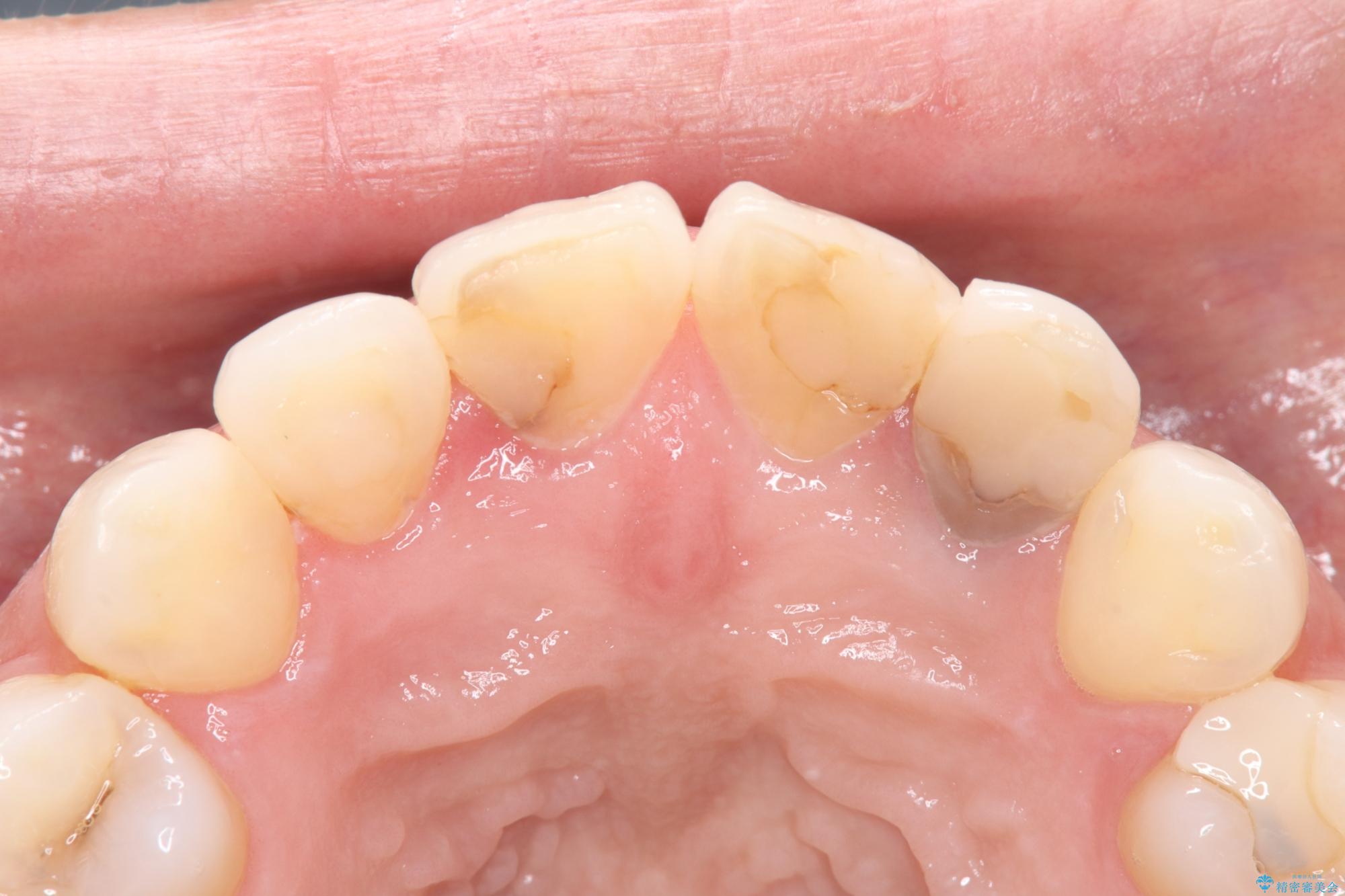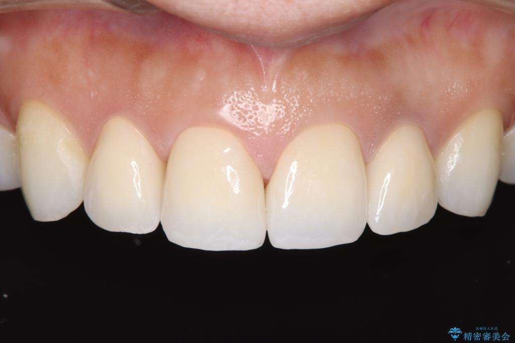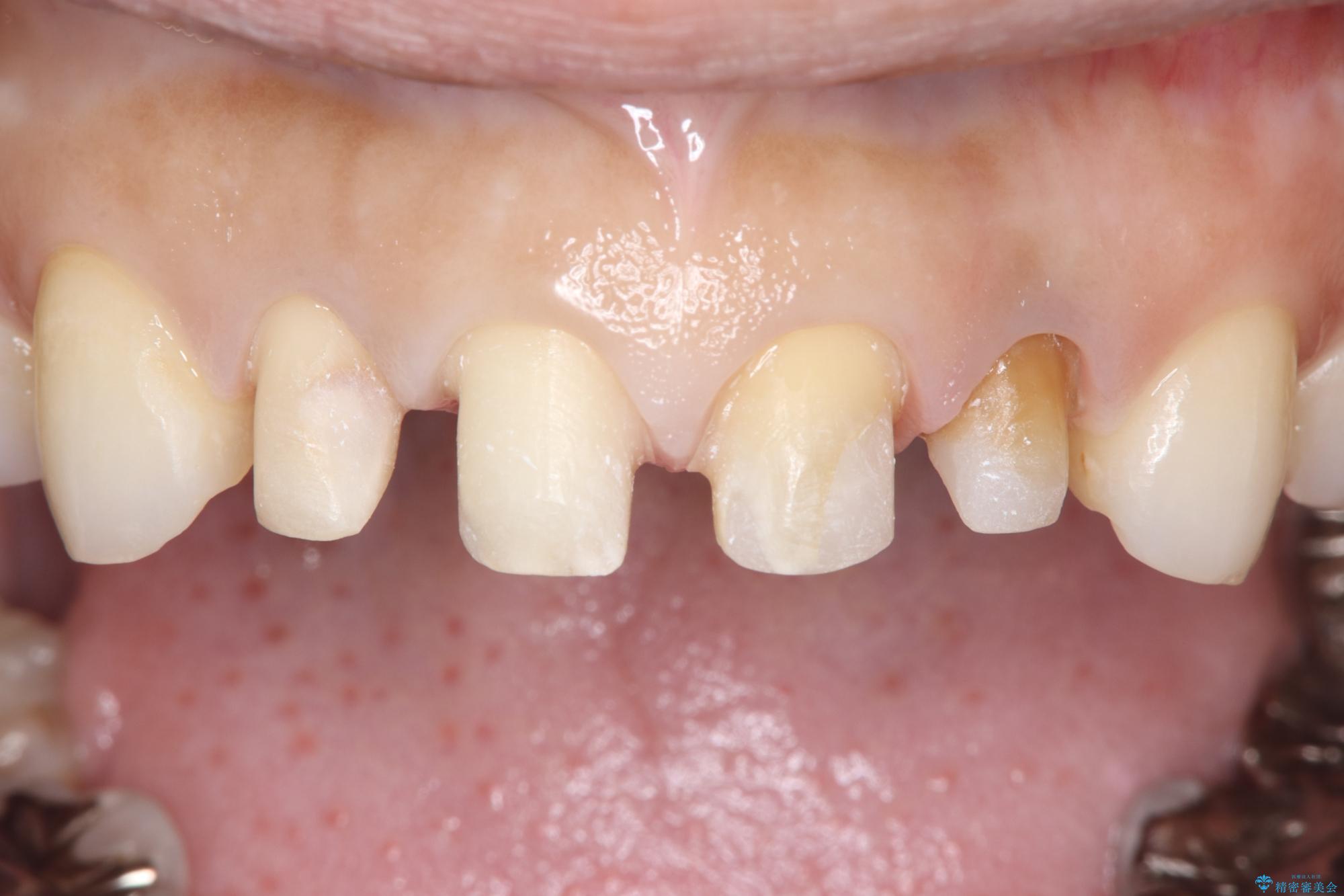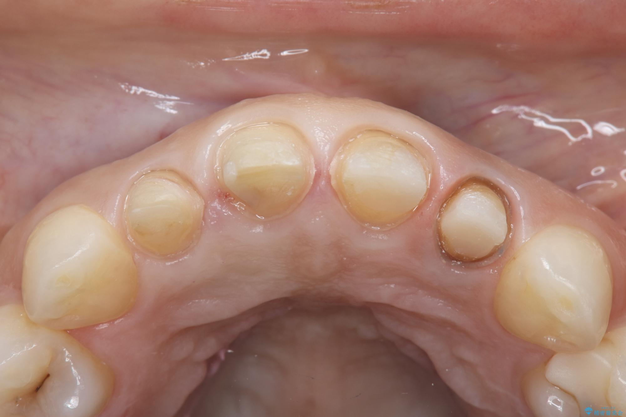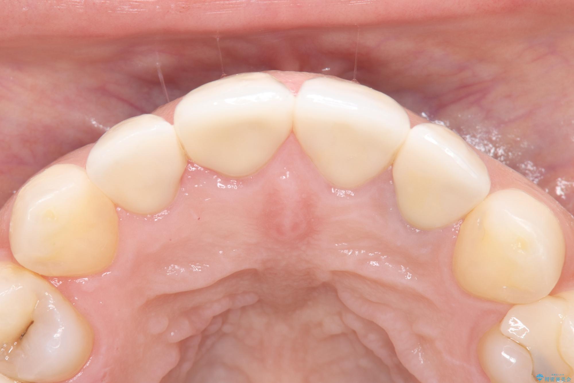 治療はまず、審美性を最大限に高めるために、歯肉のラインや前歯の形を整えることから始めました。その後、4本の歯を丁寧に形成し、金属を一切使用しないオールセラミッククラウンを作製しました。