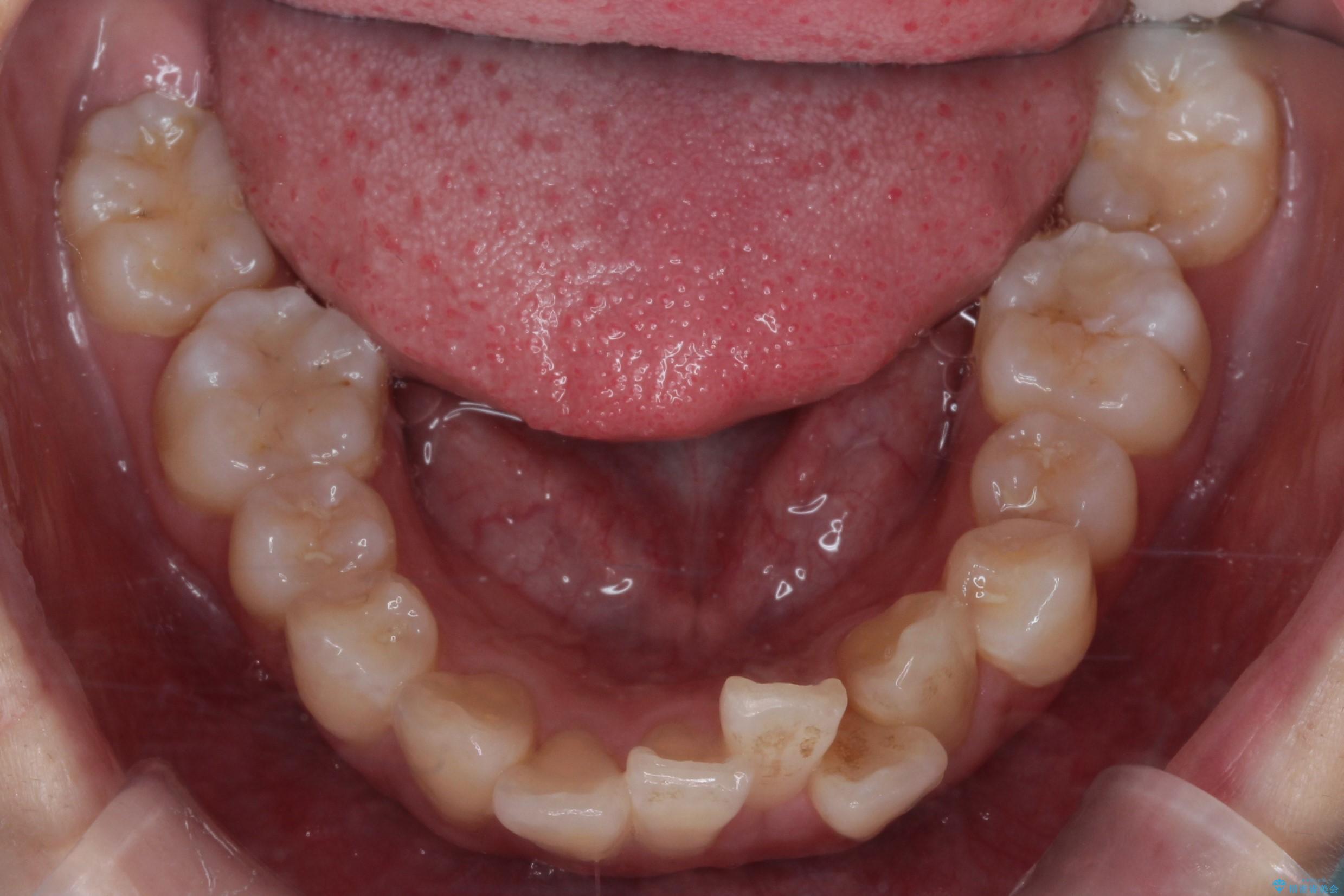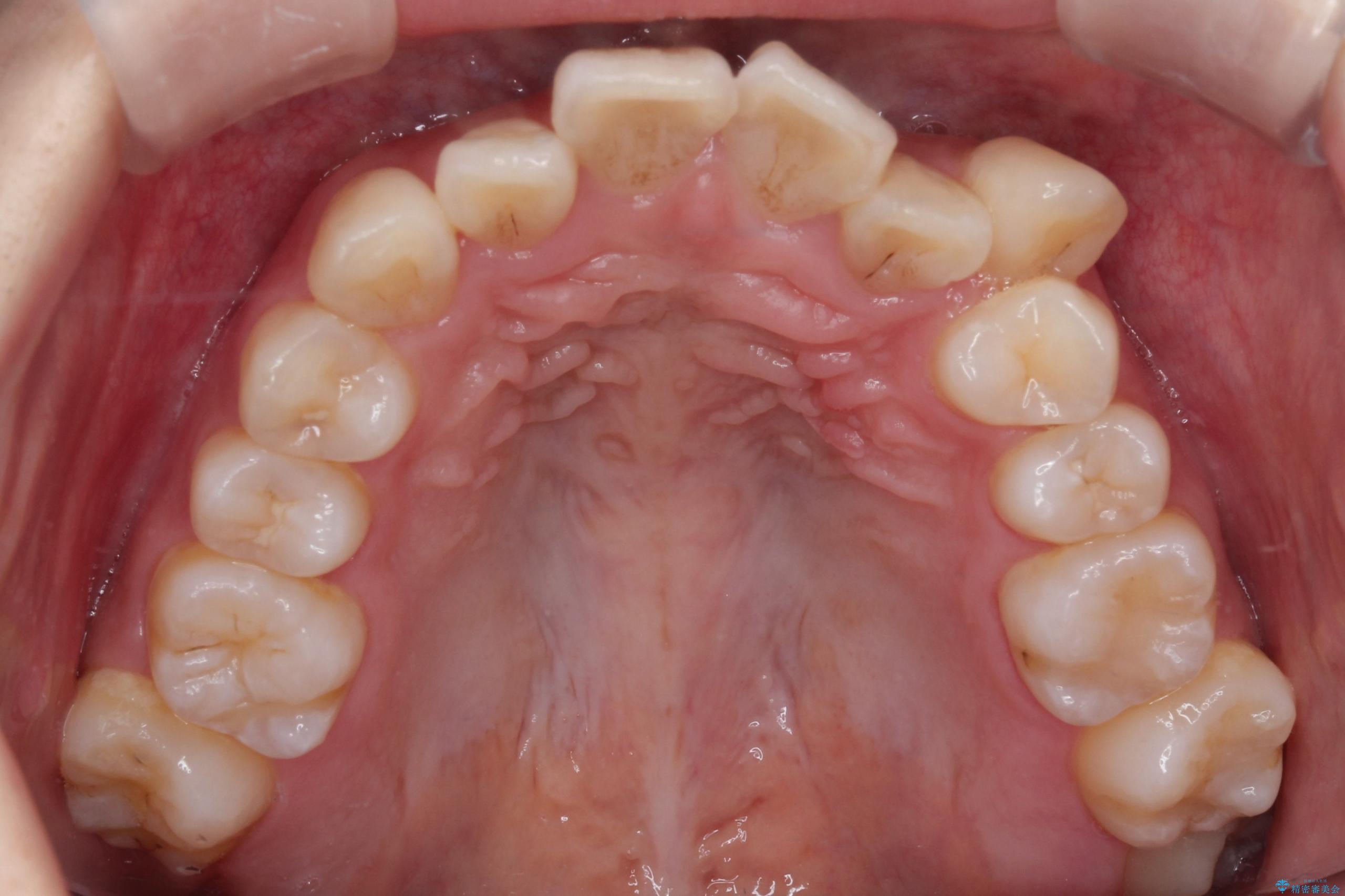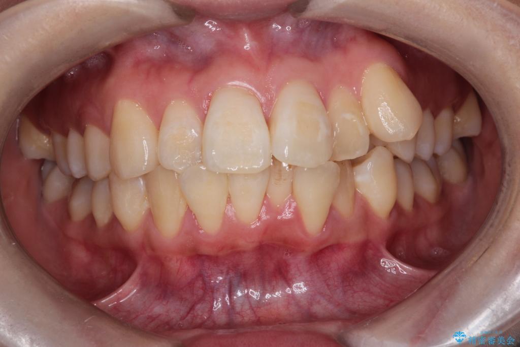 - 八重歯(叢生)と、上下の歯の中心線(正中)がずれていることを主訴にご来院されました。精密な検査の結果、歯列全体のスペースが大幅に不足しており、八重歯を正しい位置に配列し、正中のズレを改善するためには、上下左右の第一小臼歯を抜歯する必要があると診断。装置には、目立ちにくい審美ワイヤーを使用し、見た目を気にせず、機能性と審美性が完璧に整った咬み合わせを目指す治療計画を立案しました。