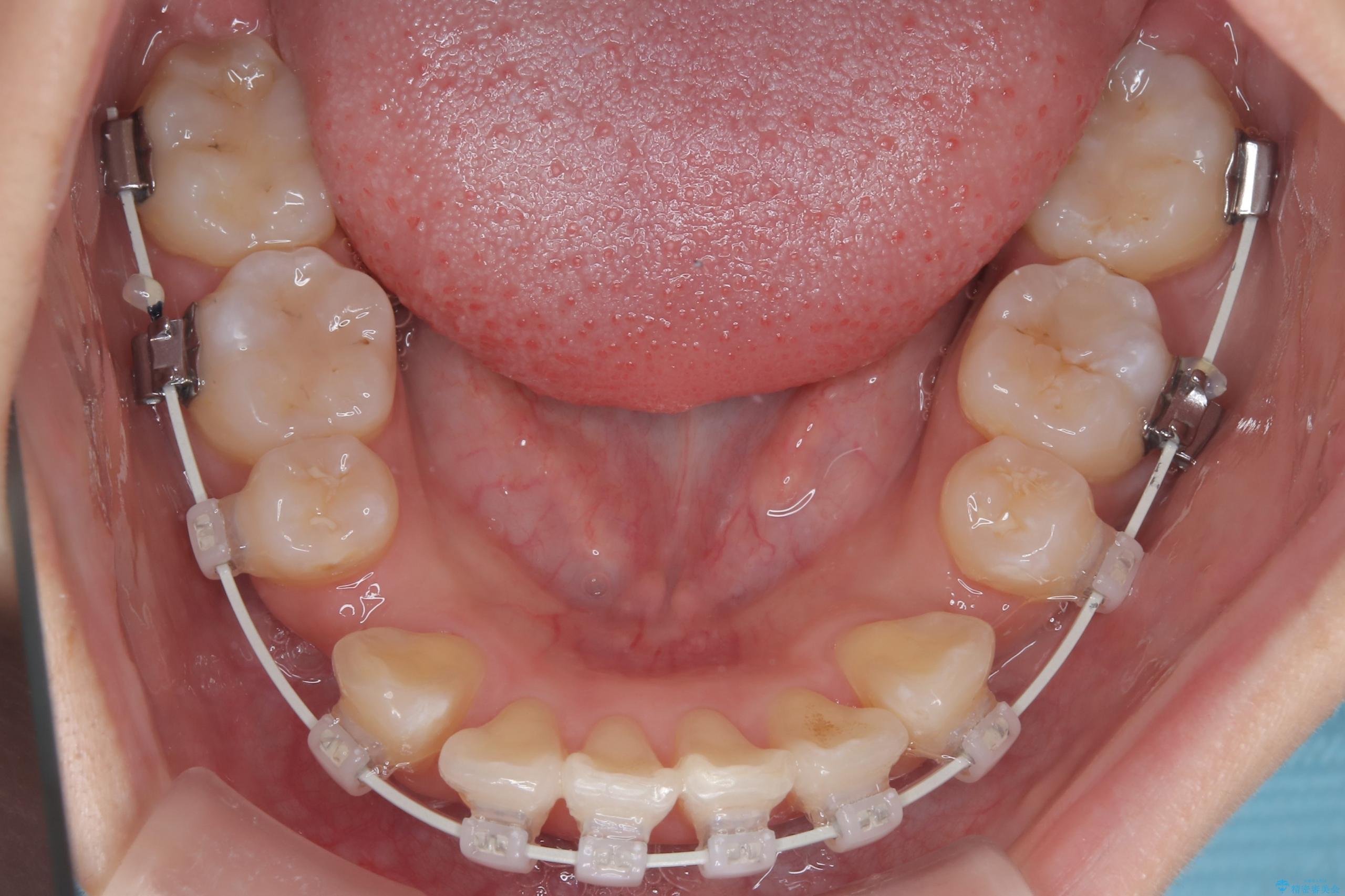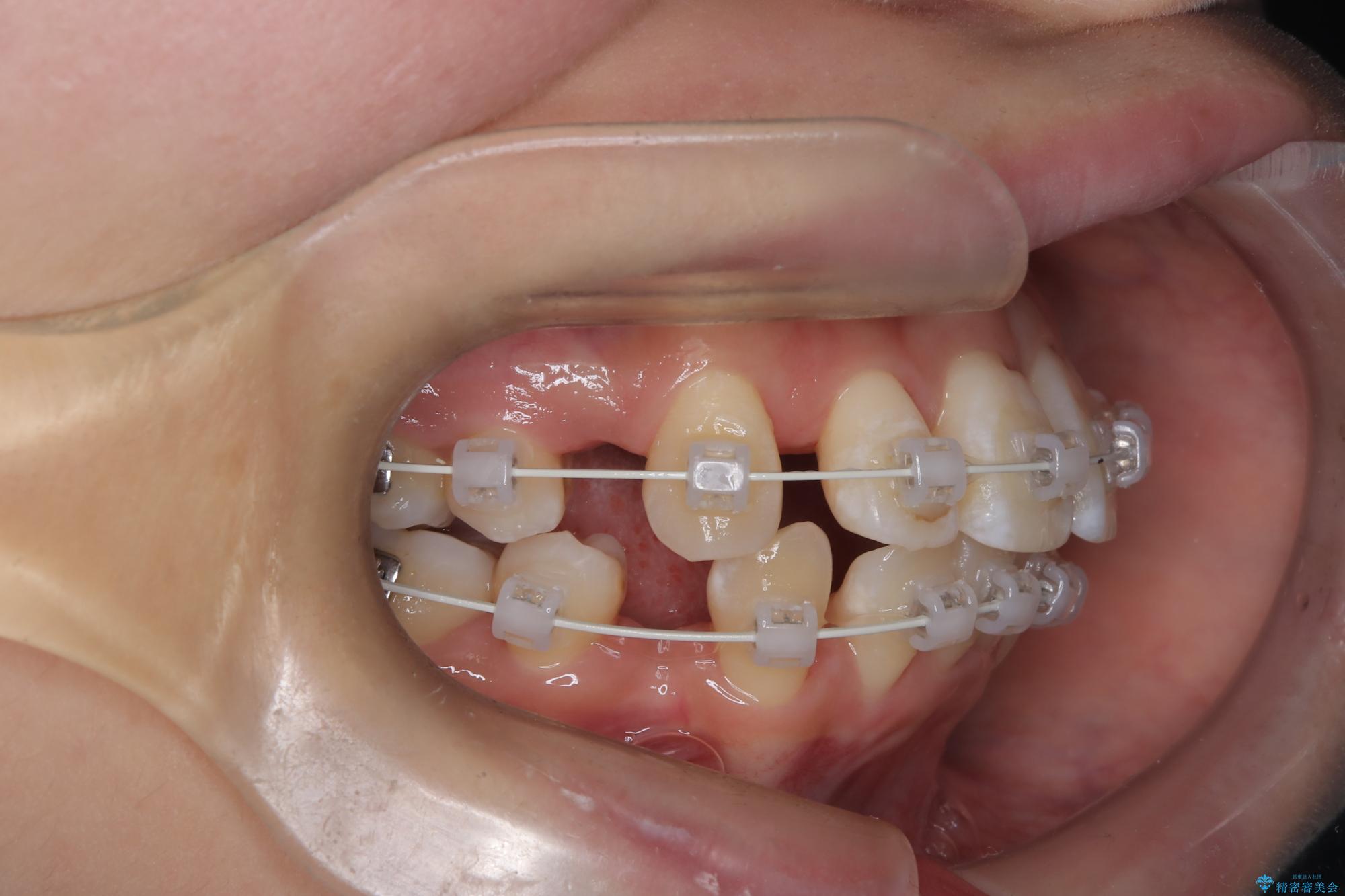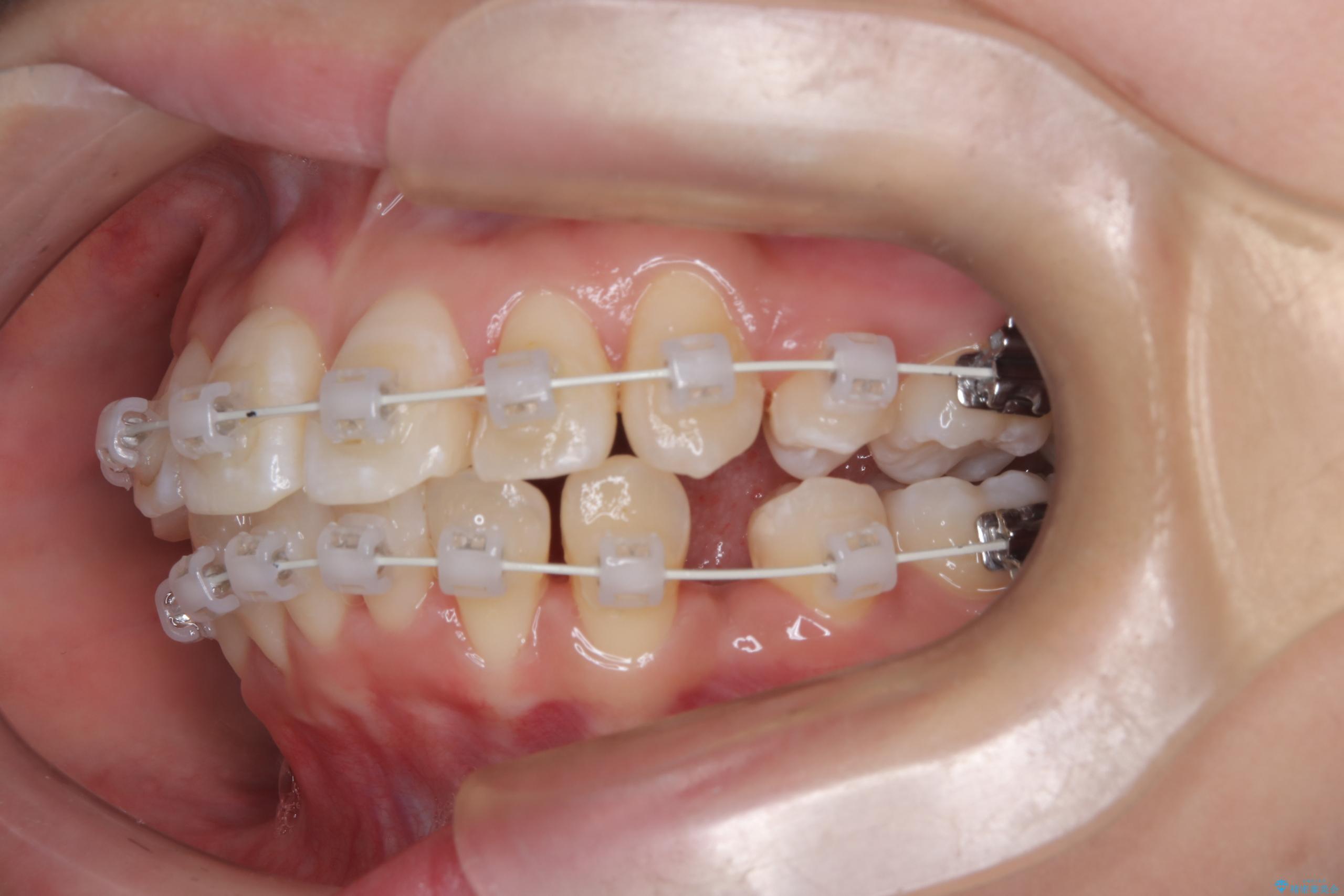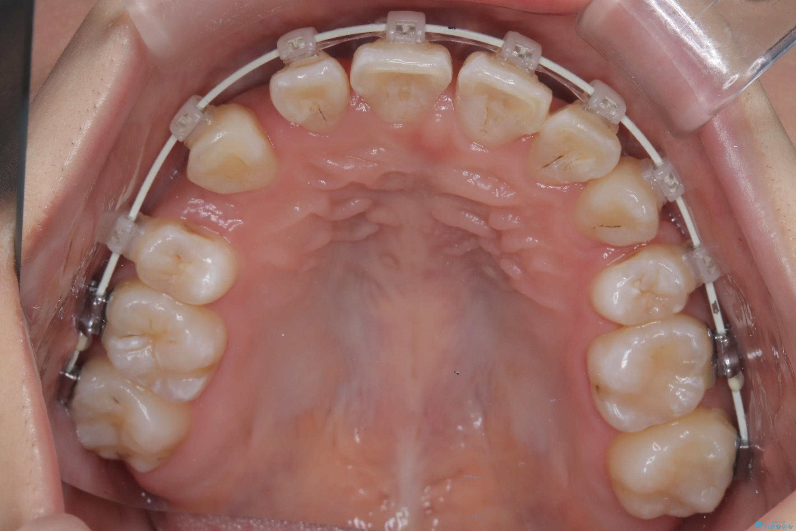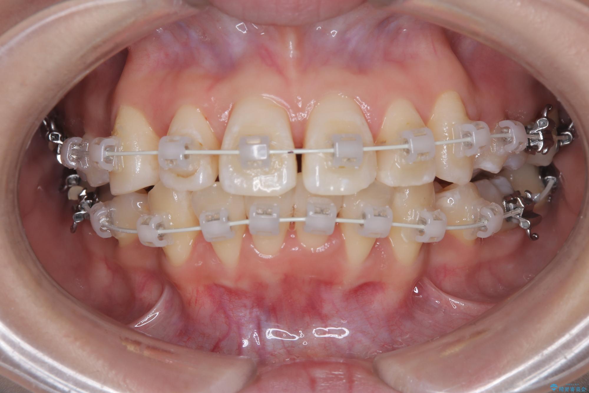 今回の矯正治療では、まず計画通り上下左右の小臼歯4本を抜歯し、八重歯や正中のズレを解消するための十分なスペースを確保しました。装置には、目立ちにくい白いブラケットとワイヤーを使用した審美ワイヤー矯正を採用。