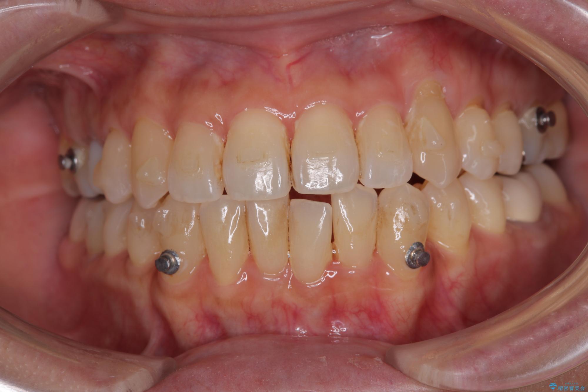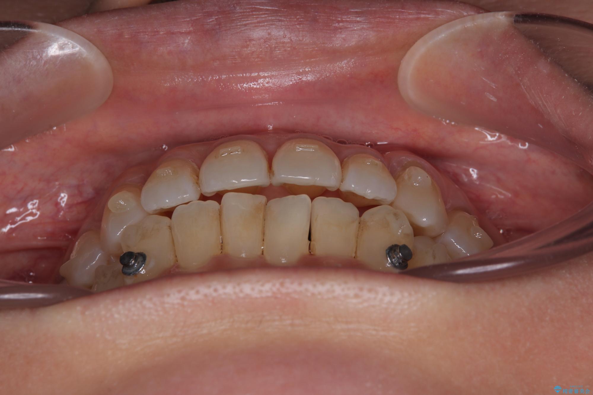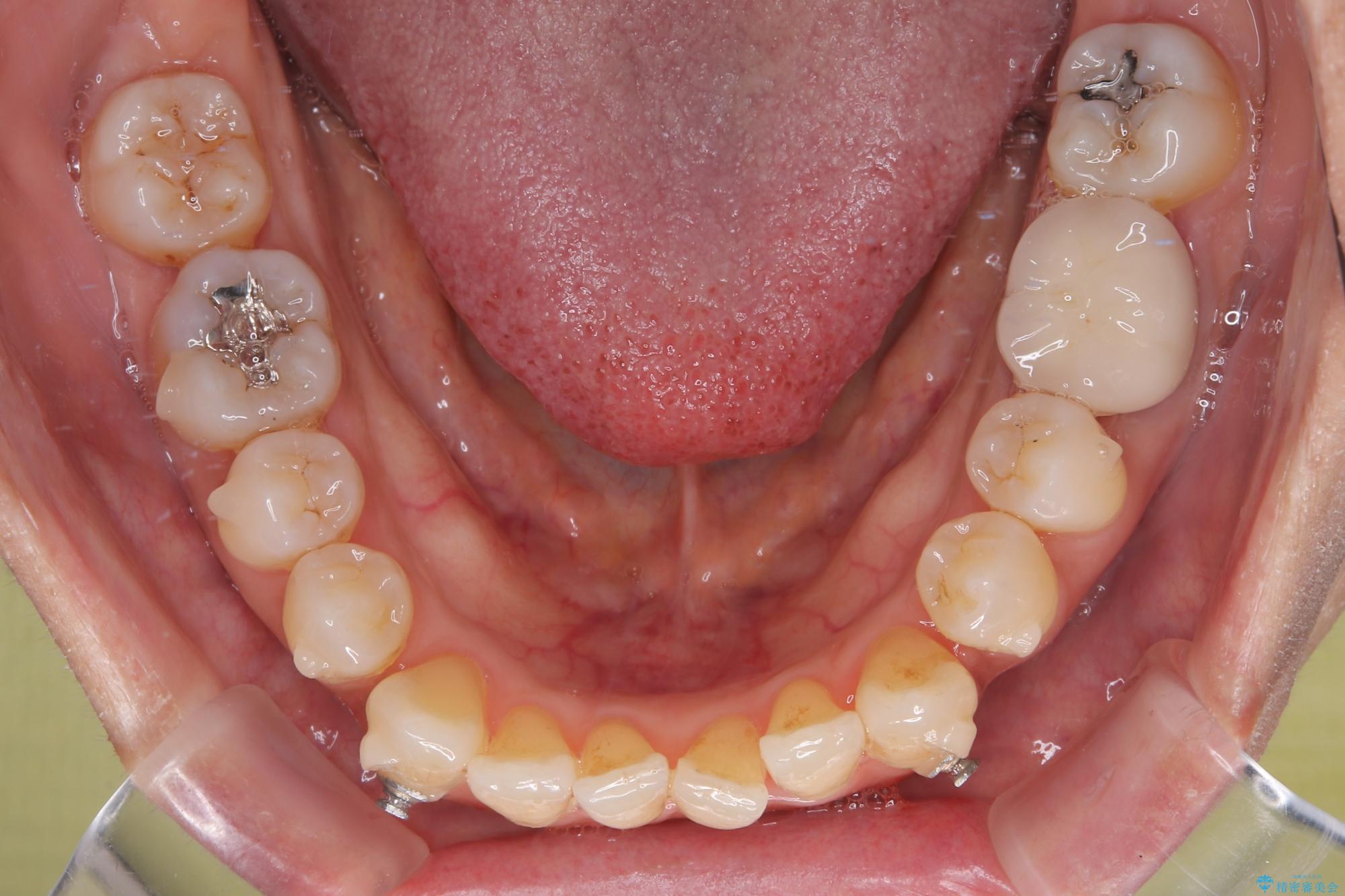 受け口傾向の骨格であり、前歯はクロスバイトまたは切端咬合となっており、下顎を中心に歯列全体の後方移動を行い、IPR(歯と歯の間を削る)によってデコボコが解消するように設計し、インビザラインにより治療を行うこととしました。