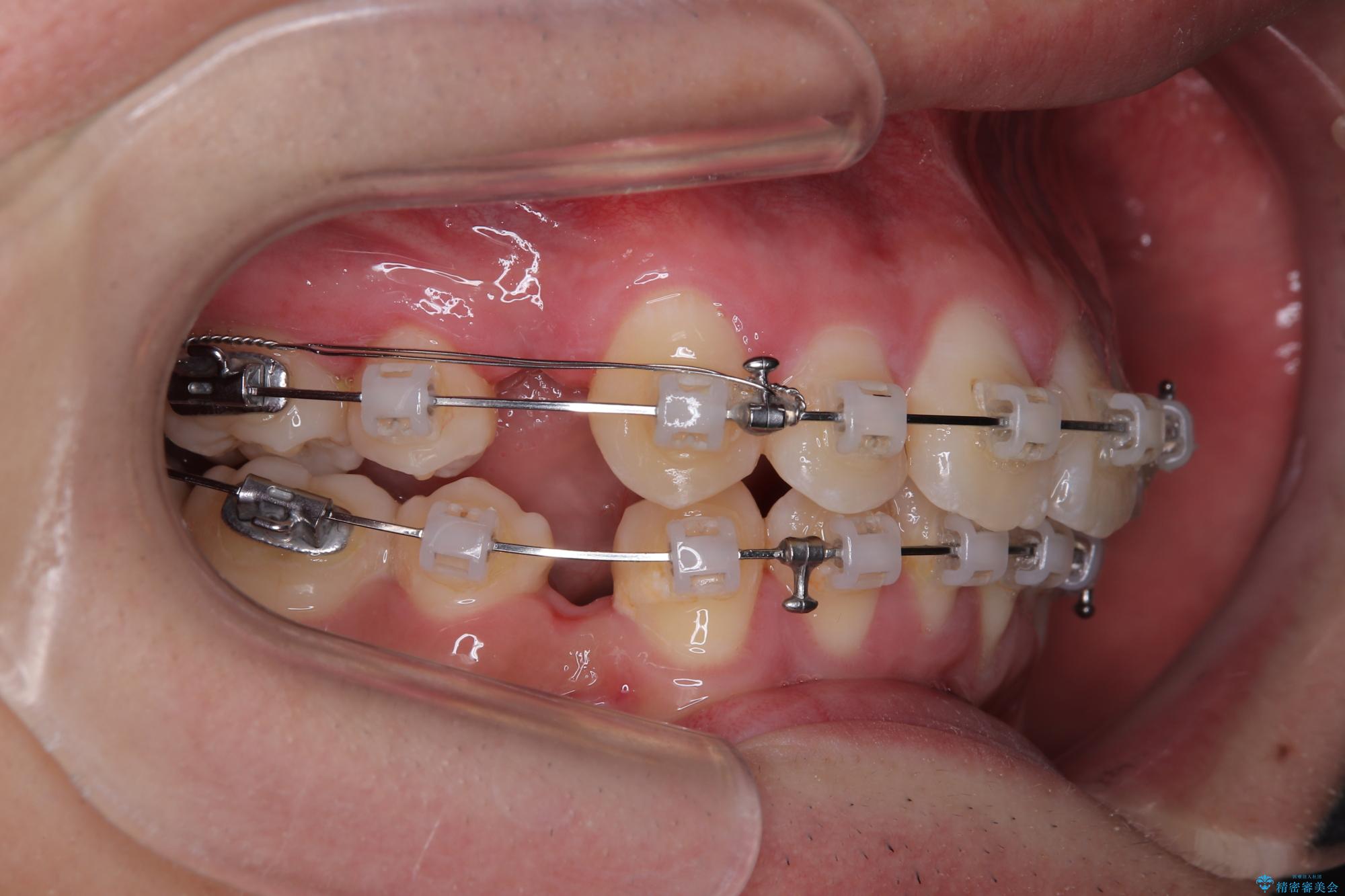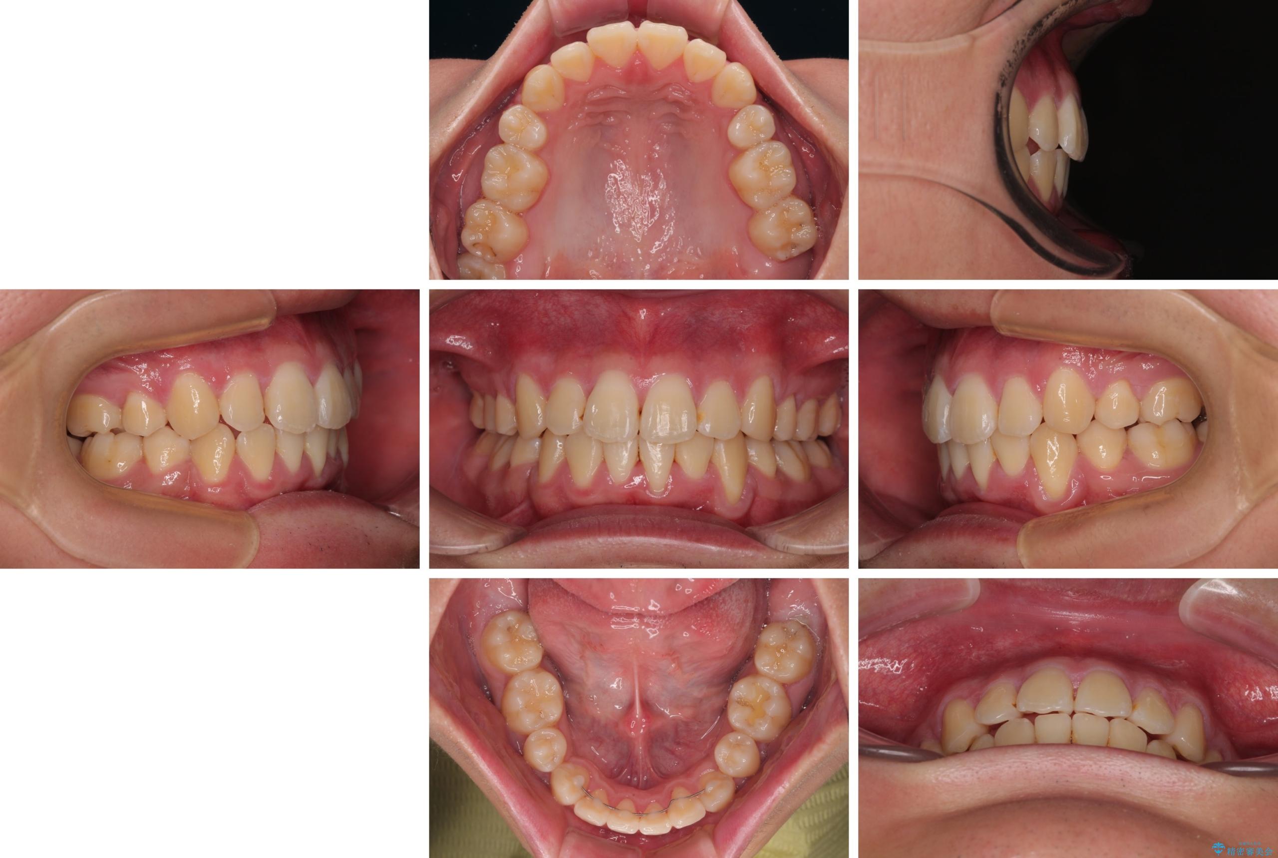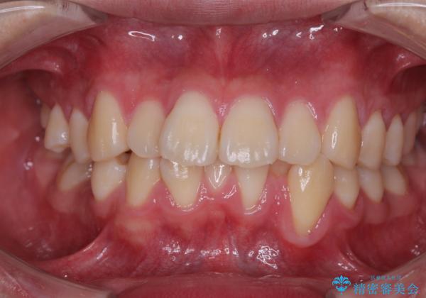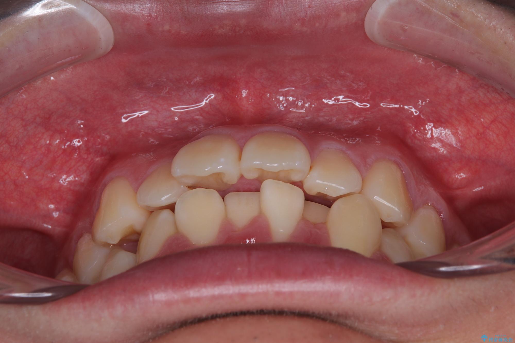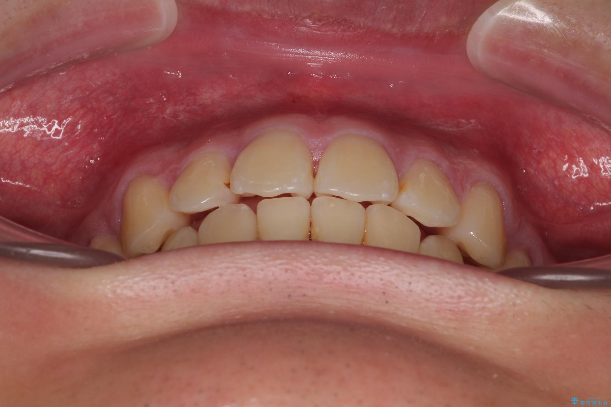 特に前歯のデコボコが顕著であり、上下左右第一小臼歯の4本を抜歯し、ワイヤー装置を使用して咬み合わせ高さを改善しながら、歯列を整えて行くこととしました。