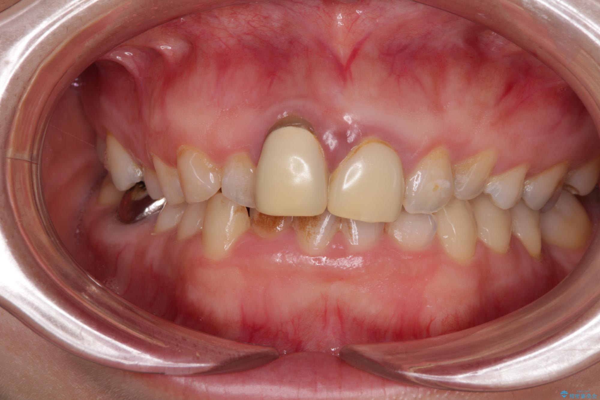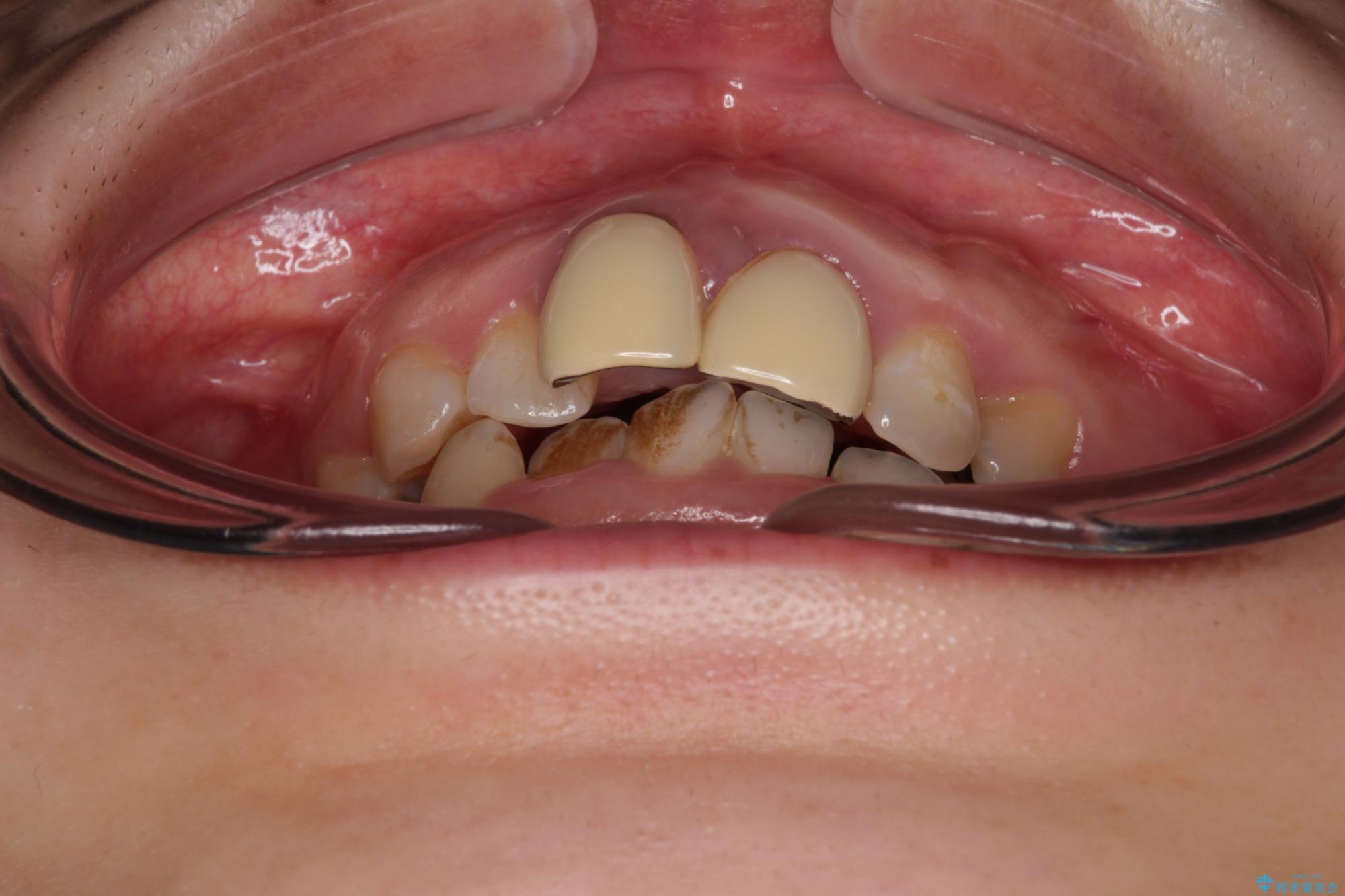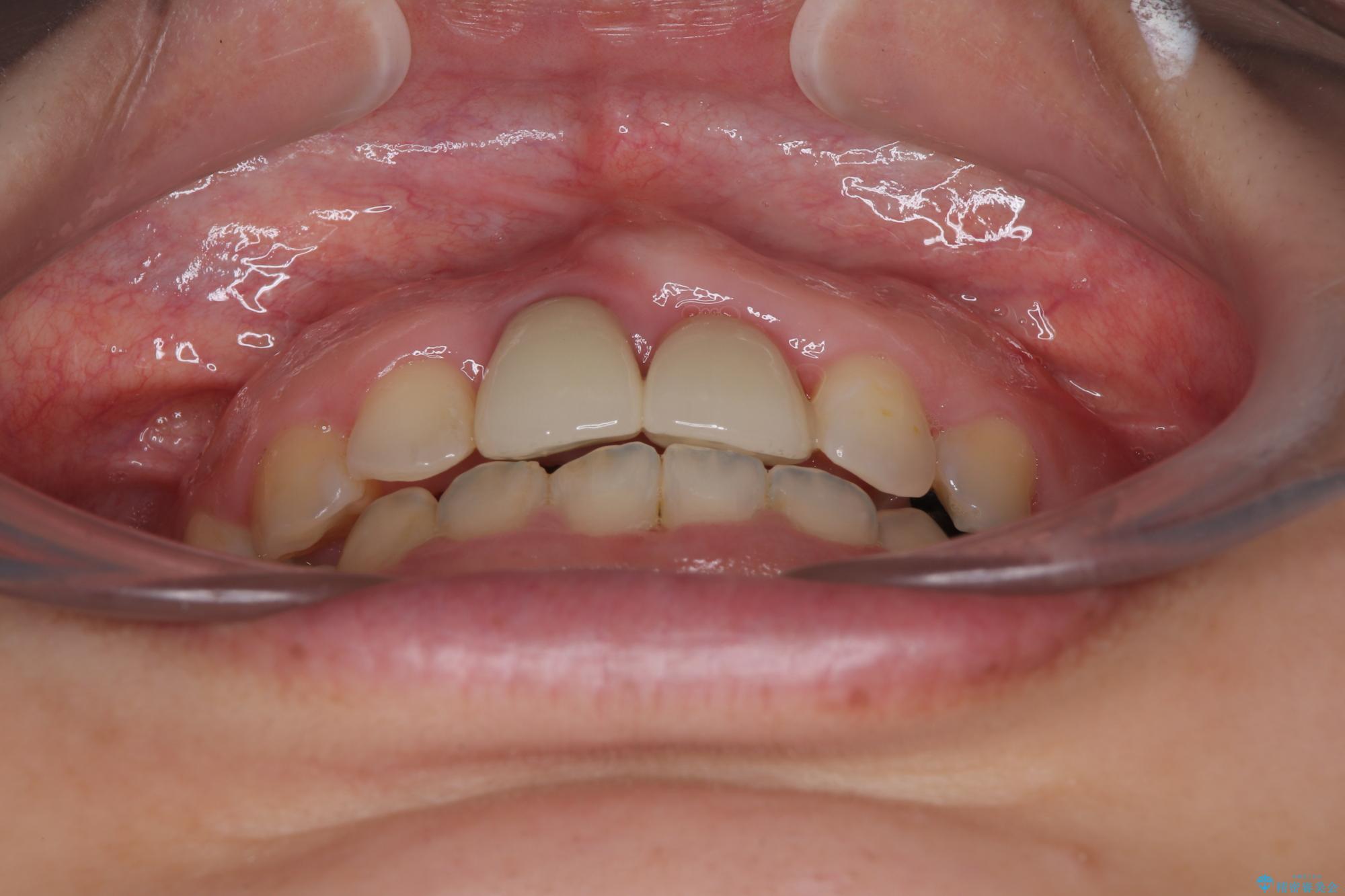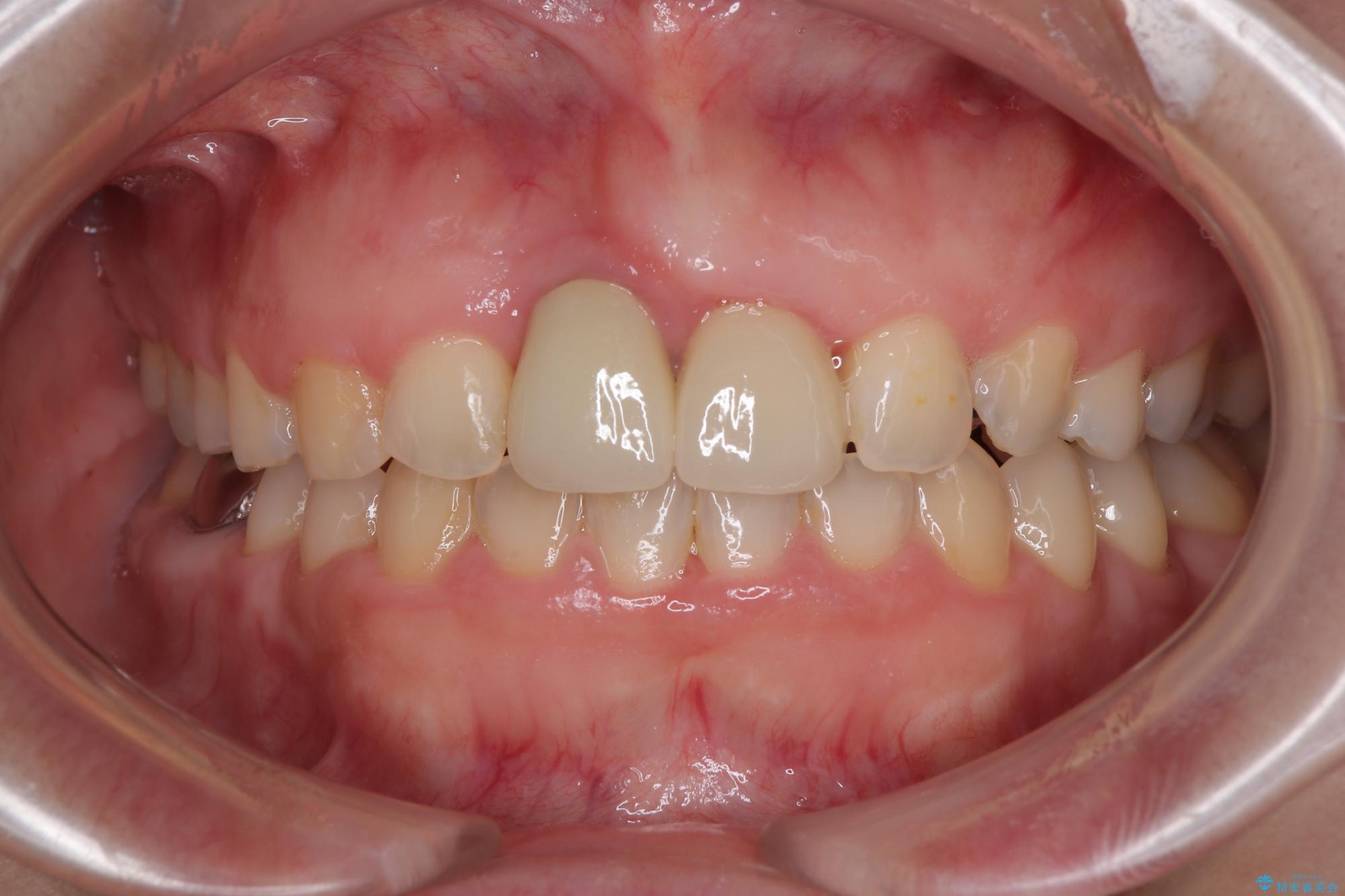 前歯のクラウンは、歯肉内深くに削り込まれており、歯肉の炎症が継続していたため、矯正治療後に歯周外科処置を行い、歯肉の腫れを改善させました。
