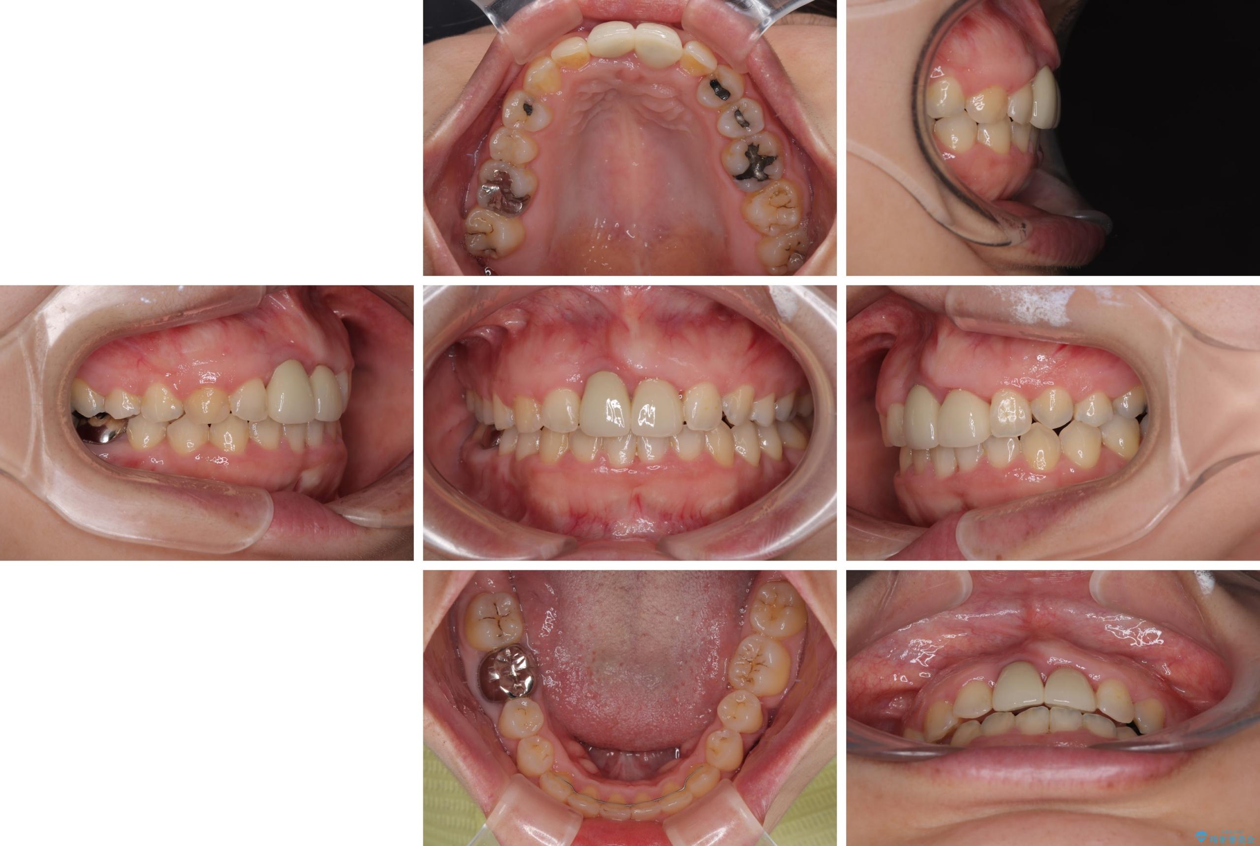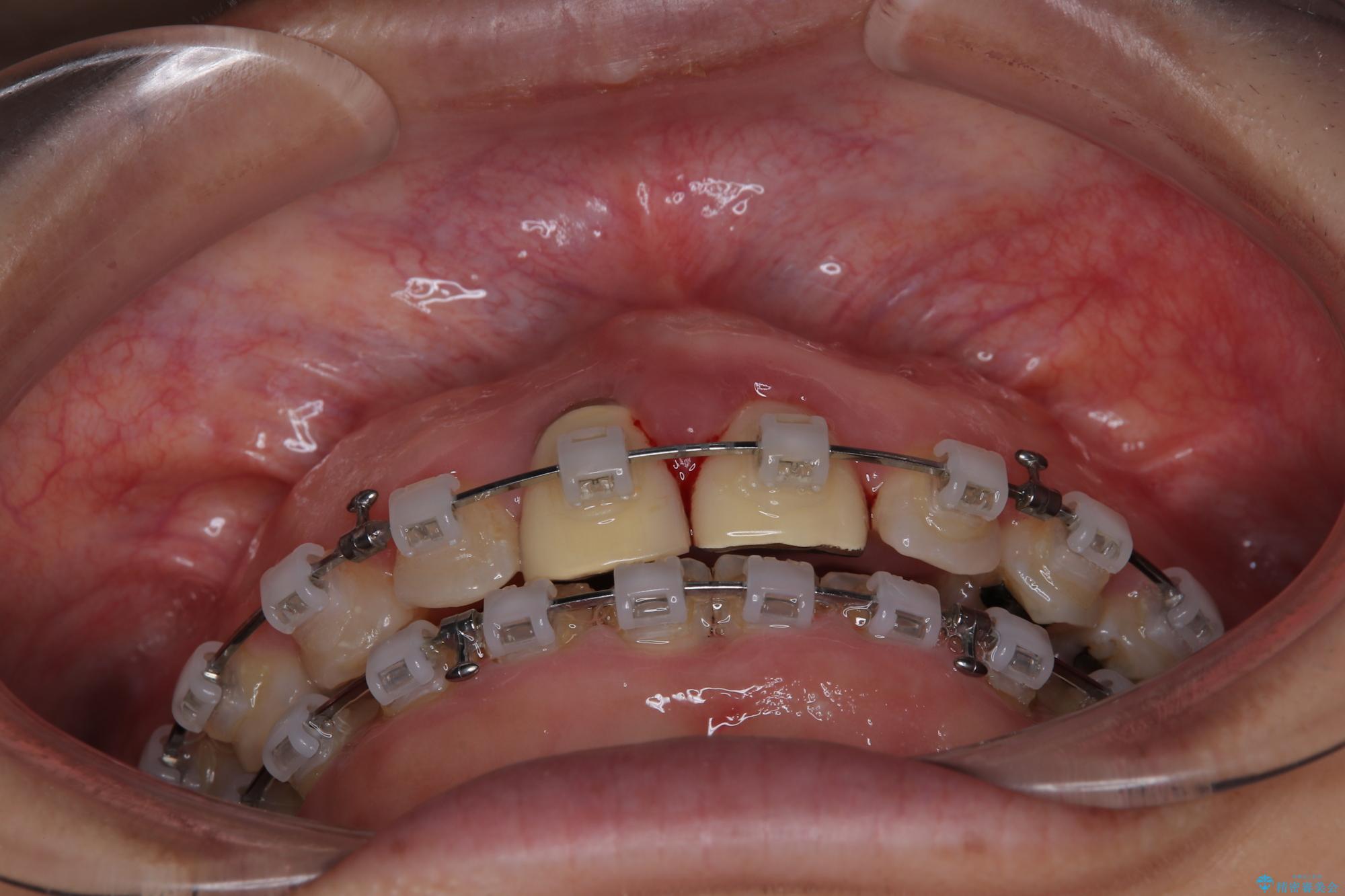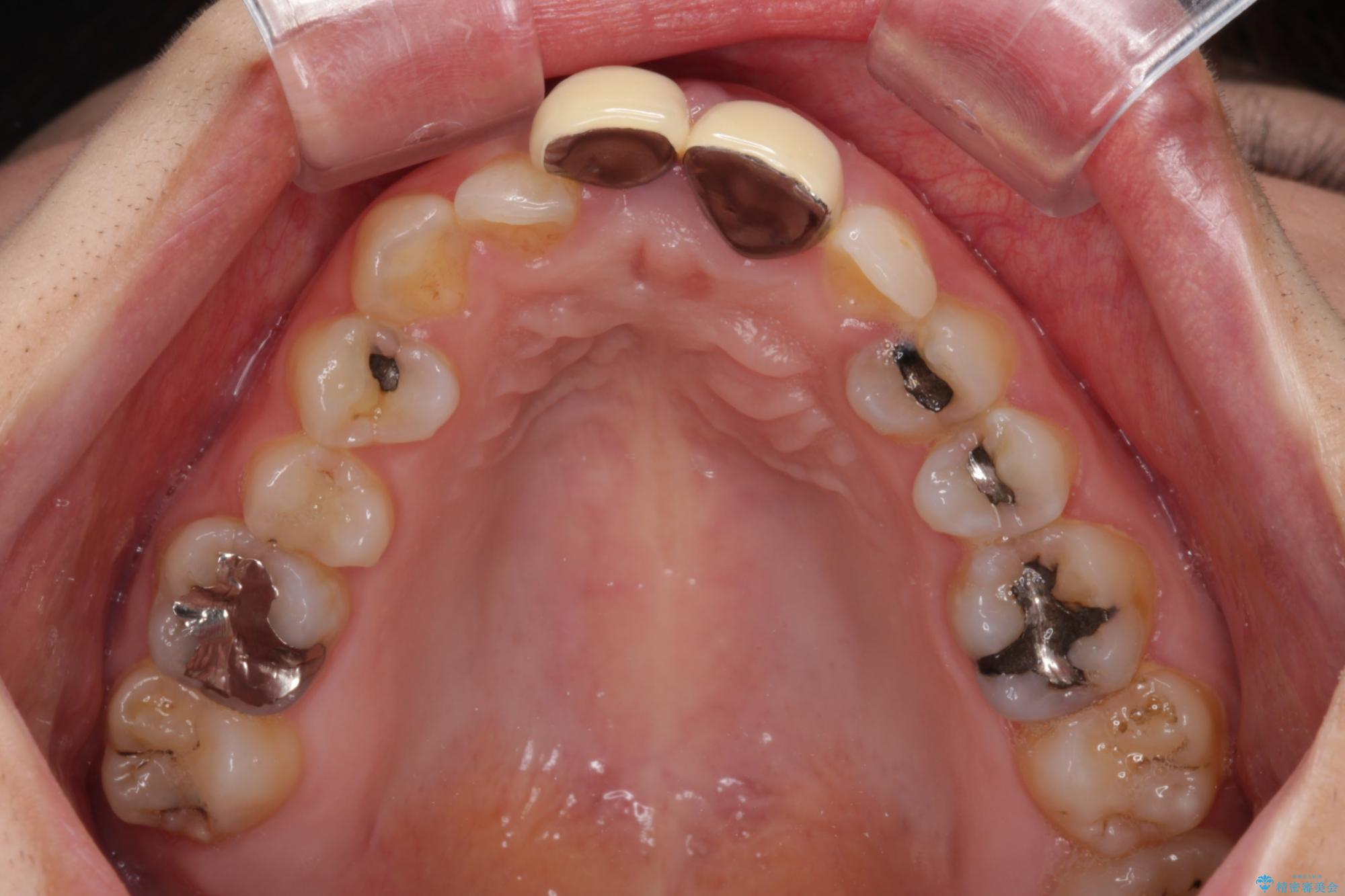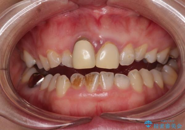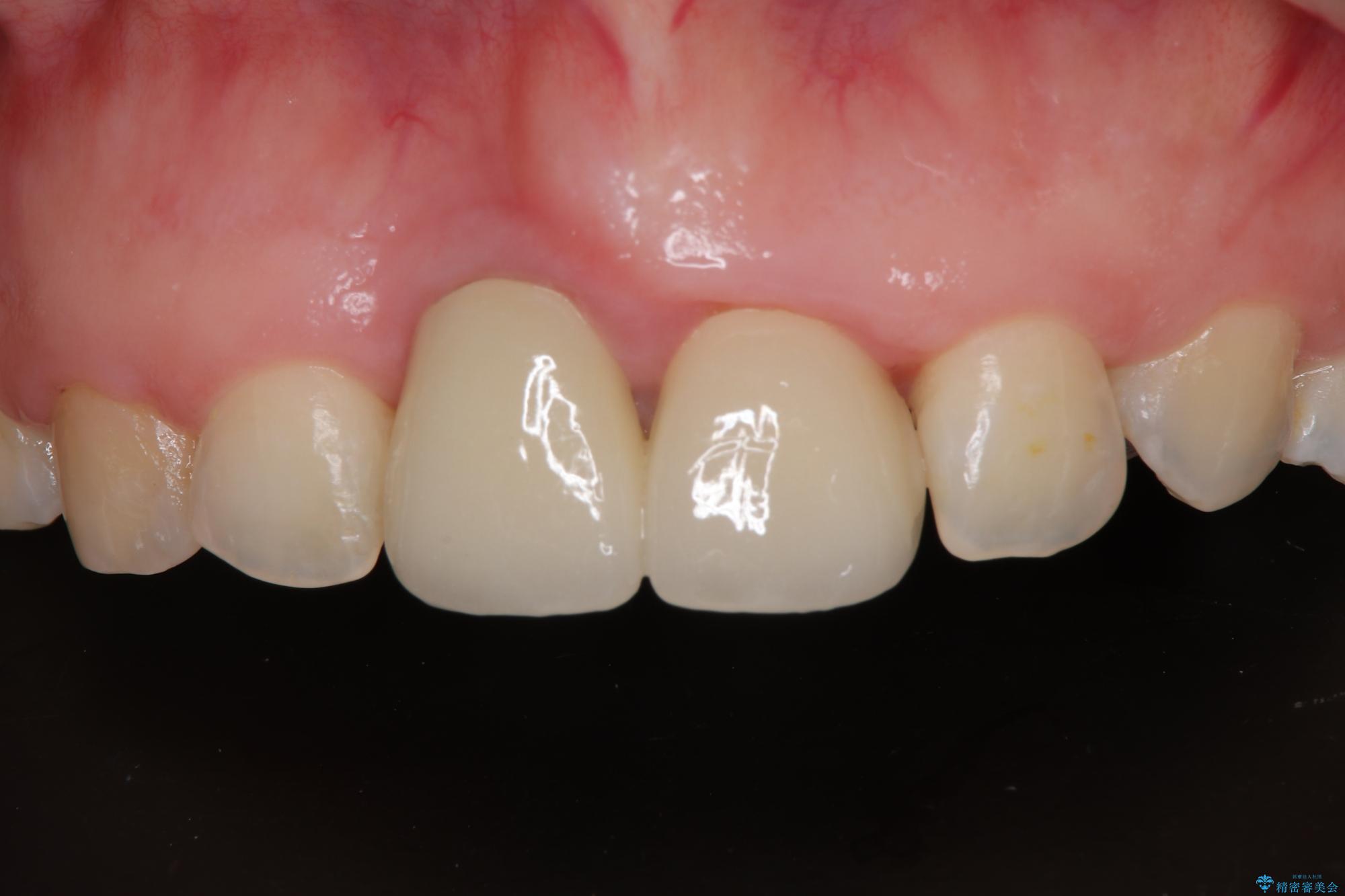 前歯のクラウンは、歯肉内深くに削り込まれており、歯肉の炎症が継続していたため、矯正治療後に歯周外科処置を行い、歯肉の腫れを改善させました。