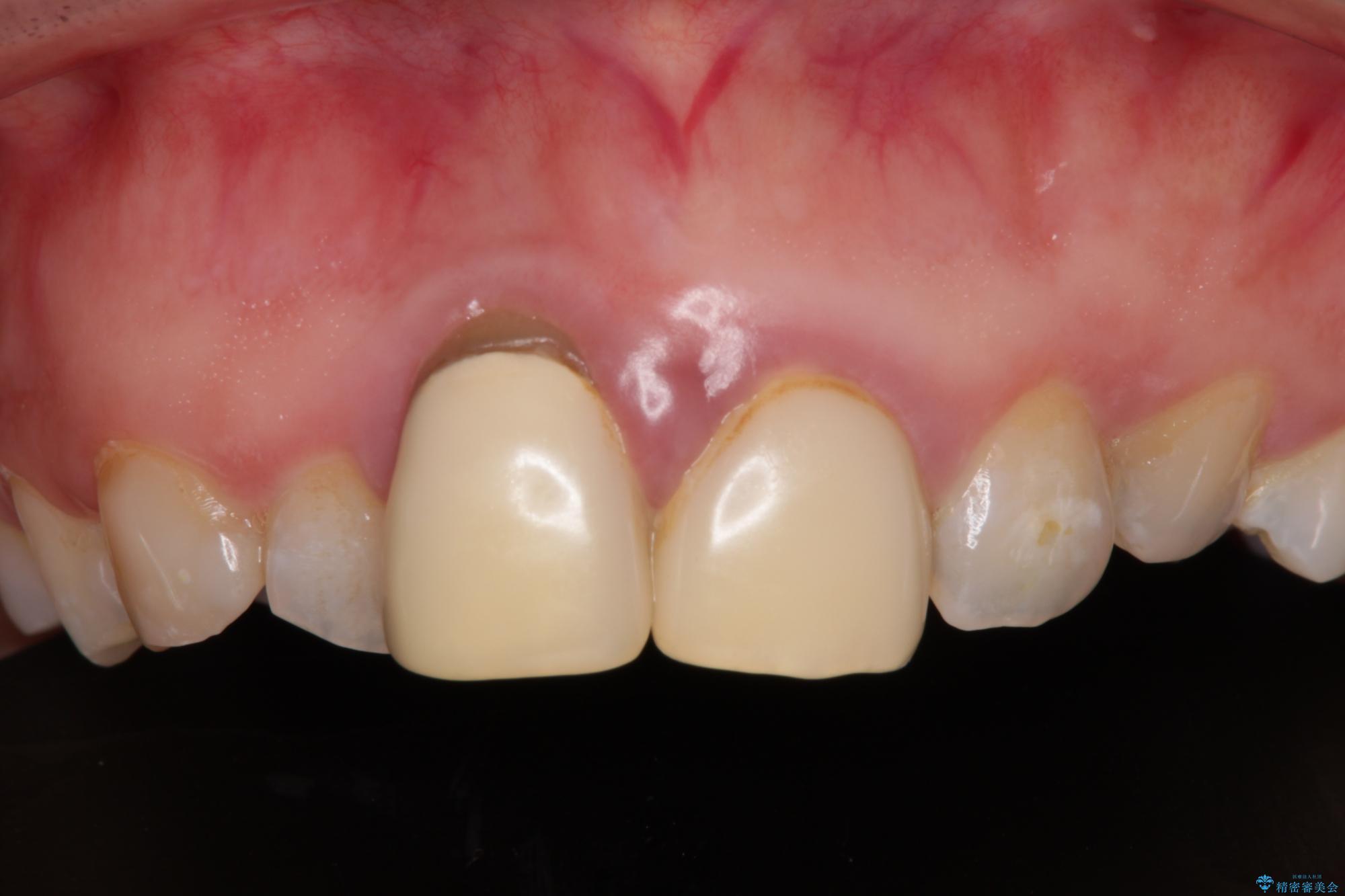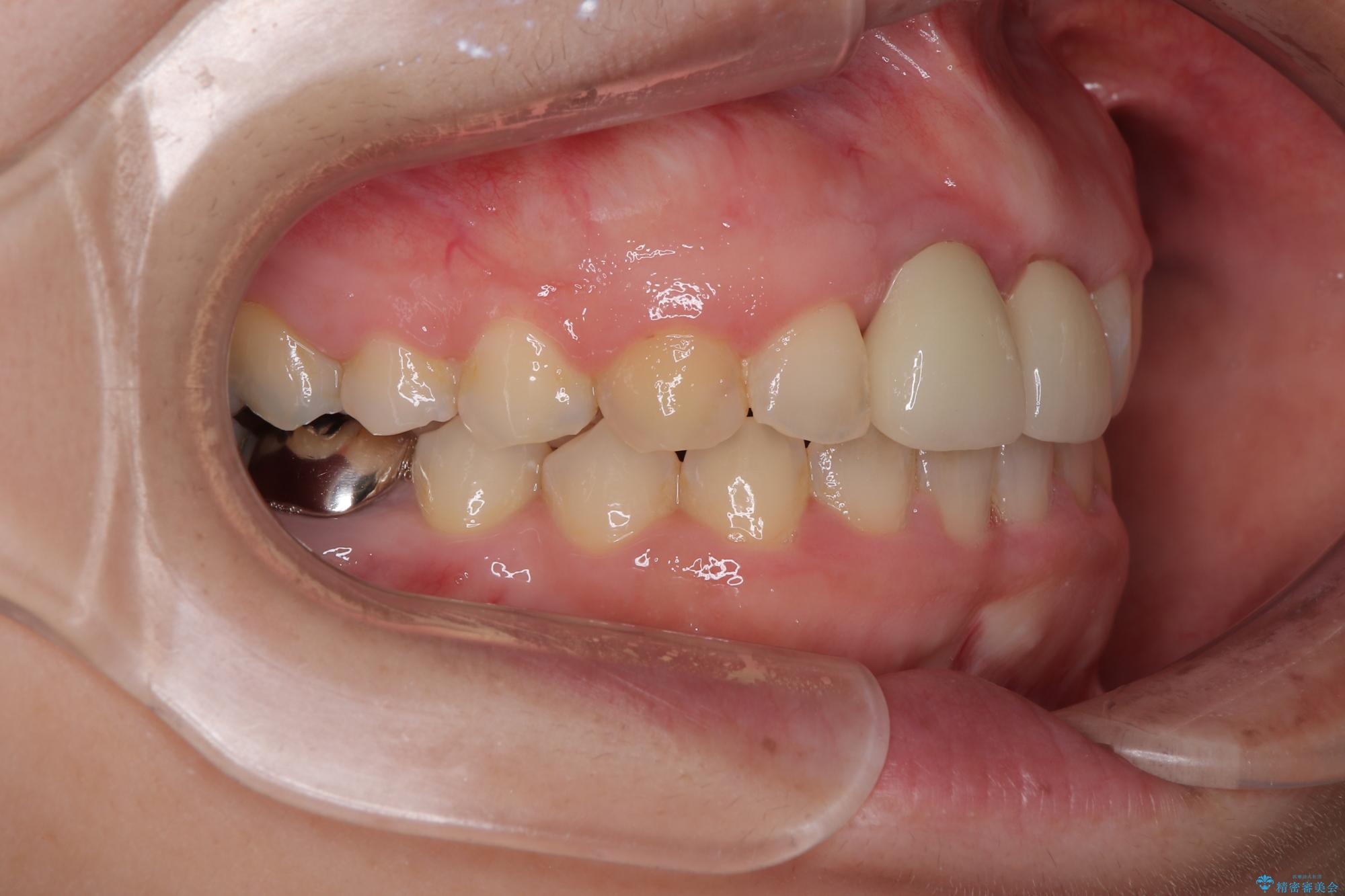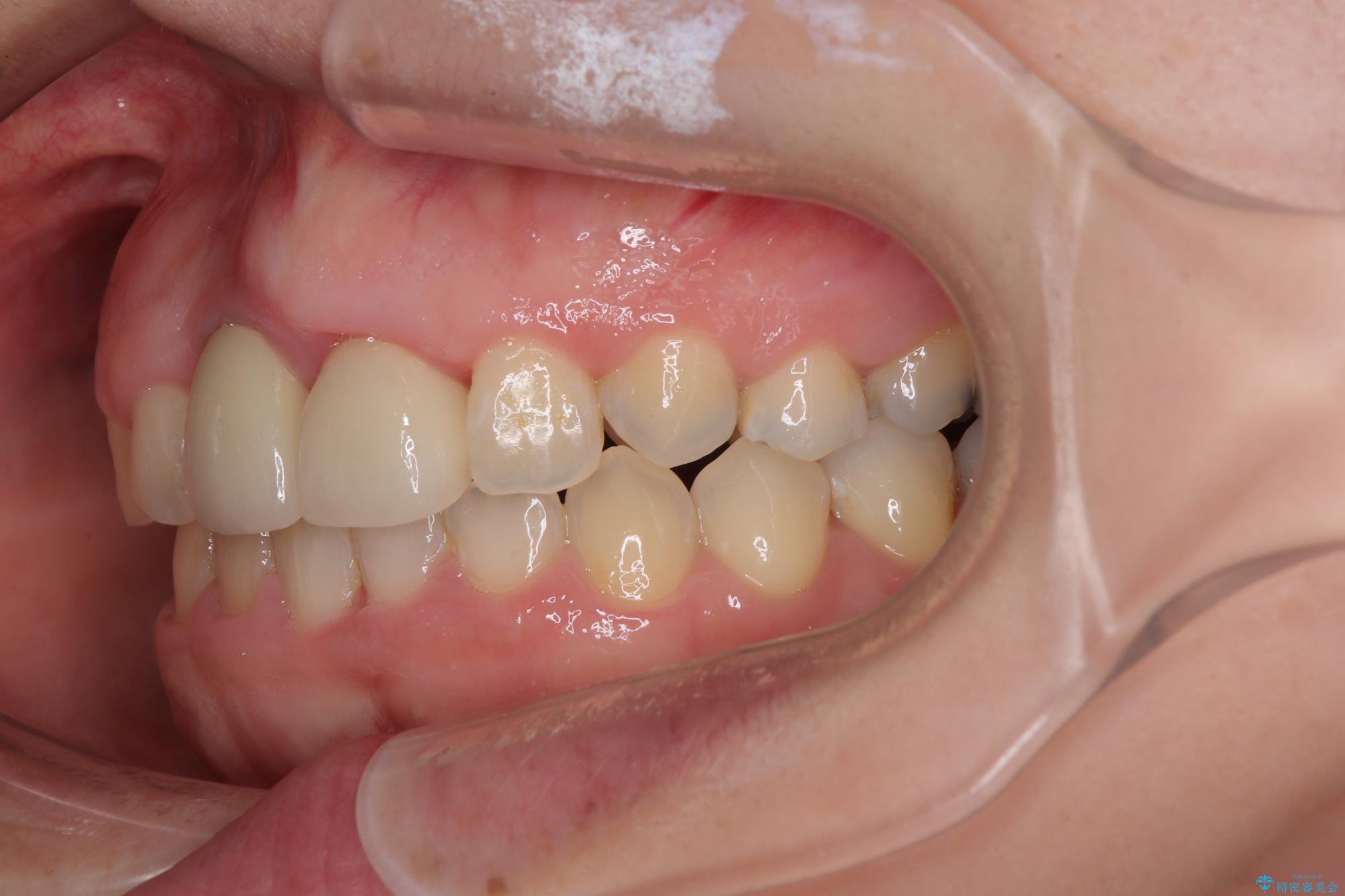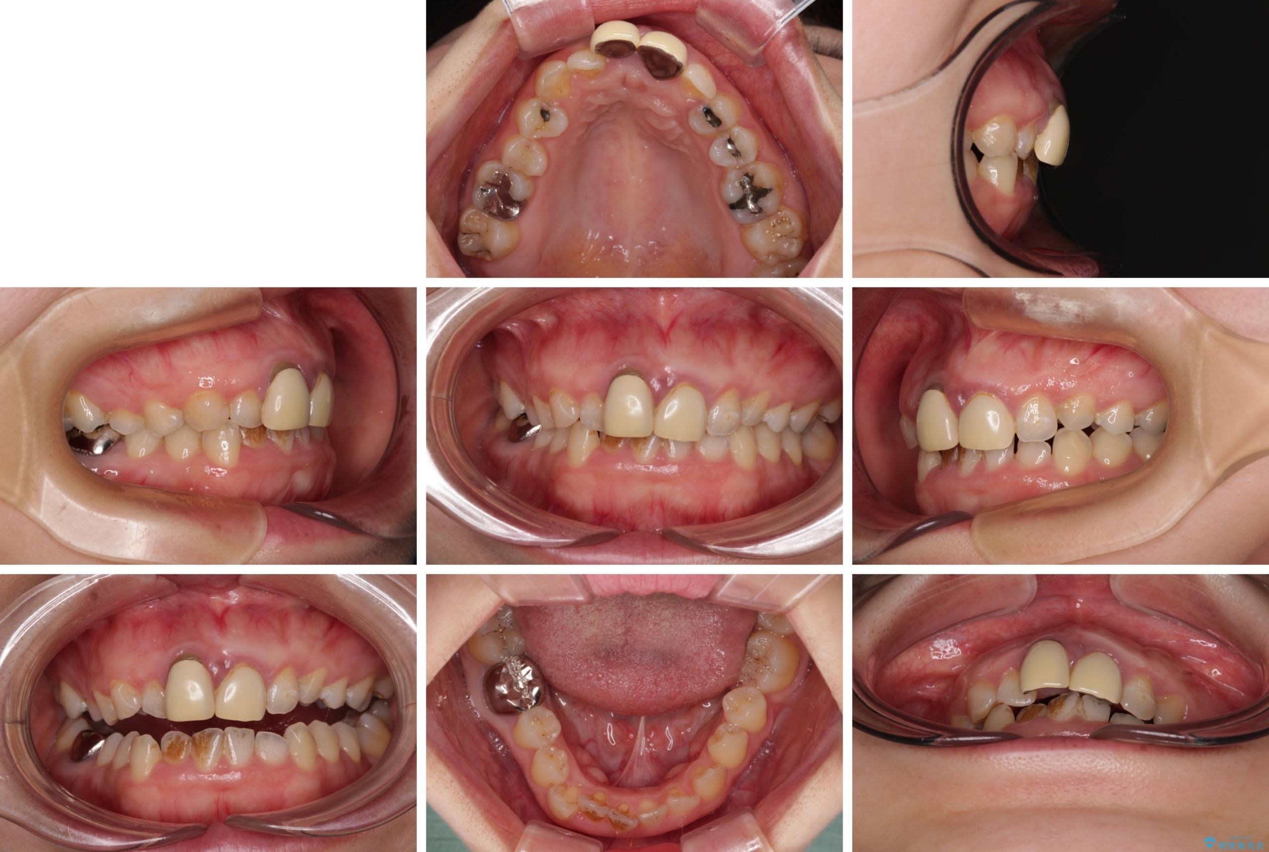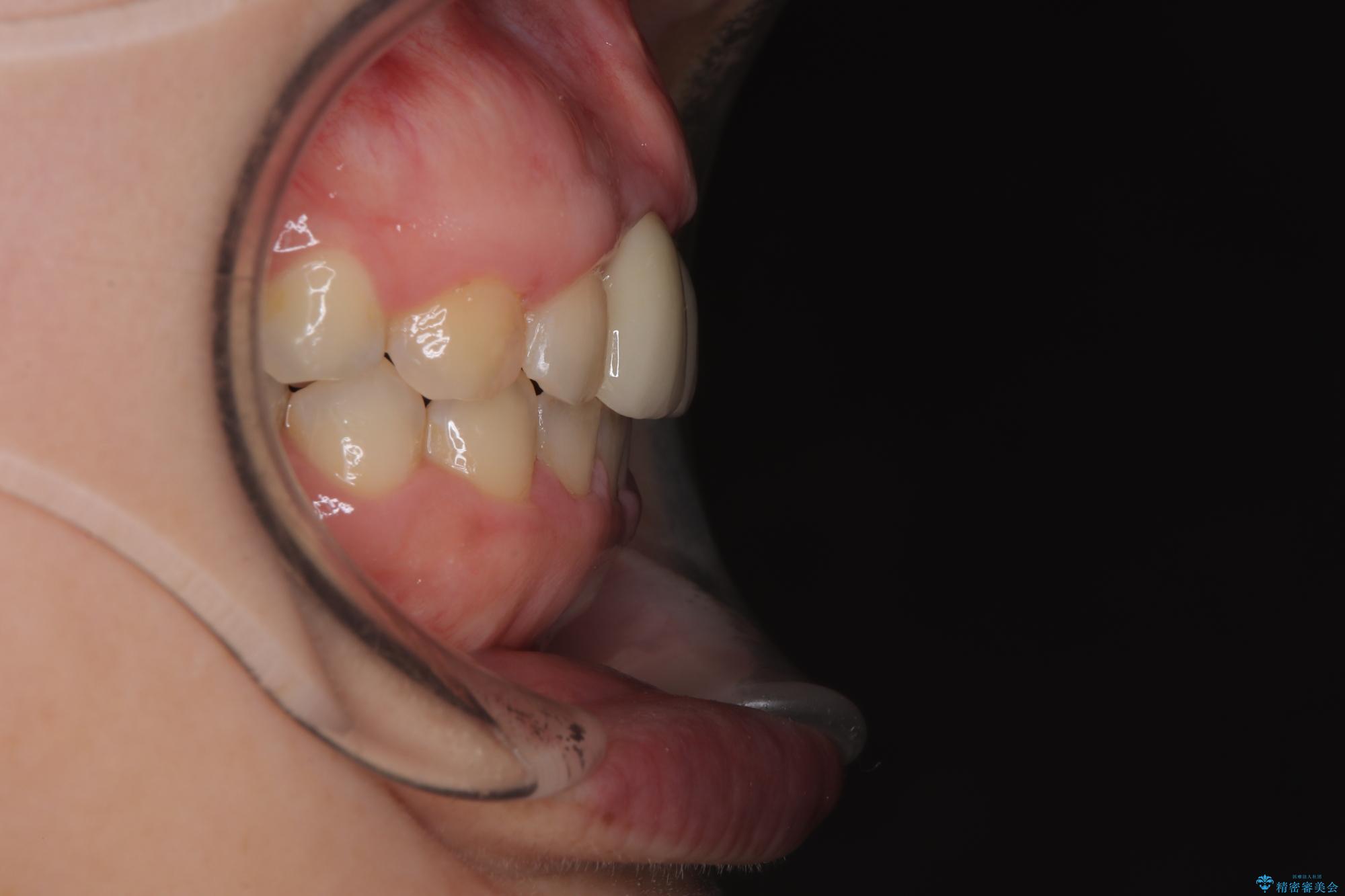 前歯のクラウンは、歯肉内深くに削り込まれており、歯肉の炎症が継続していたため、矯正治療後に歯周外科処置を行い、歯肉の腫れを改善させました。