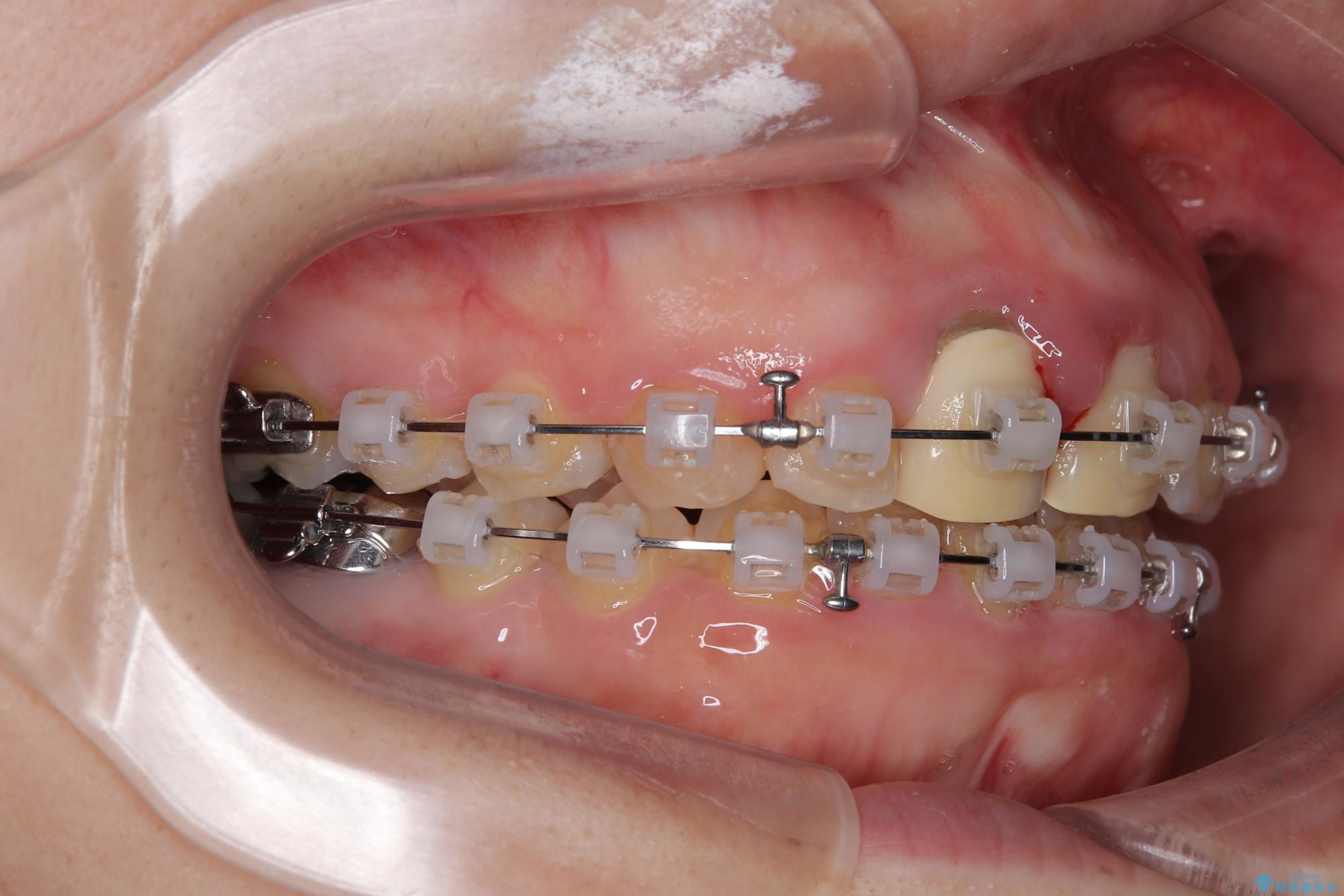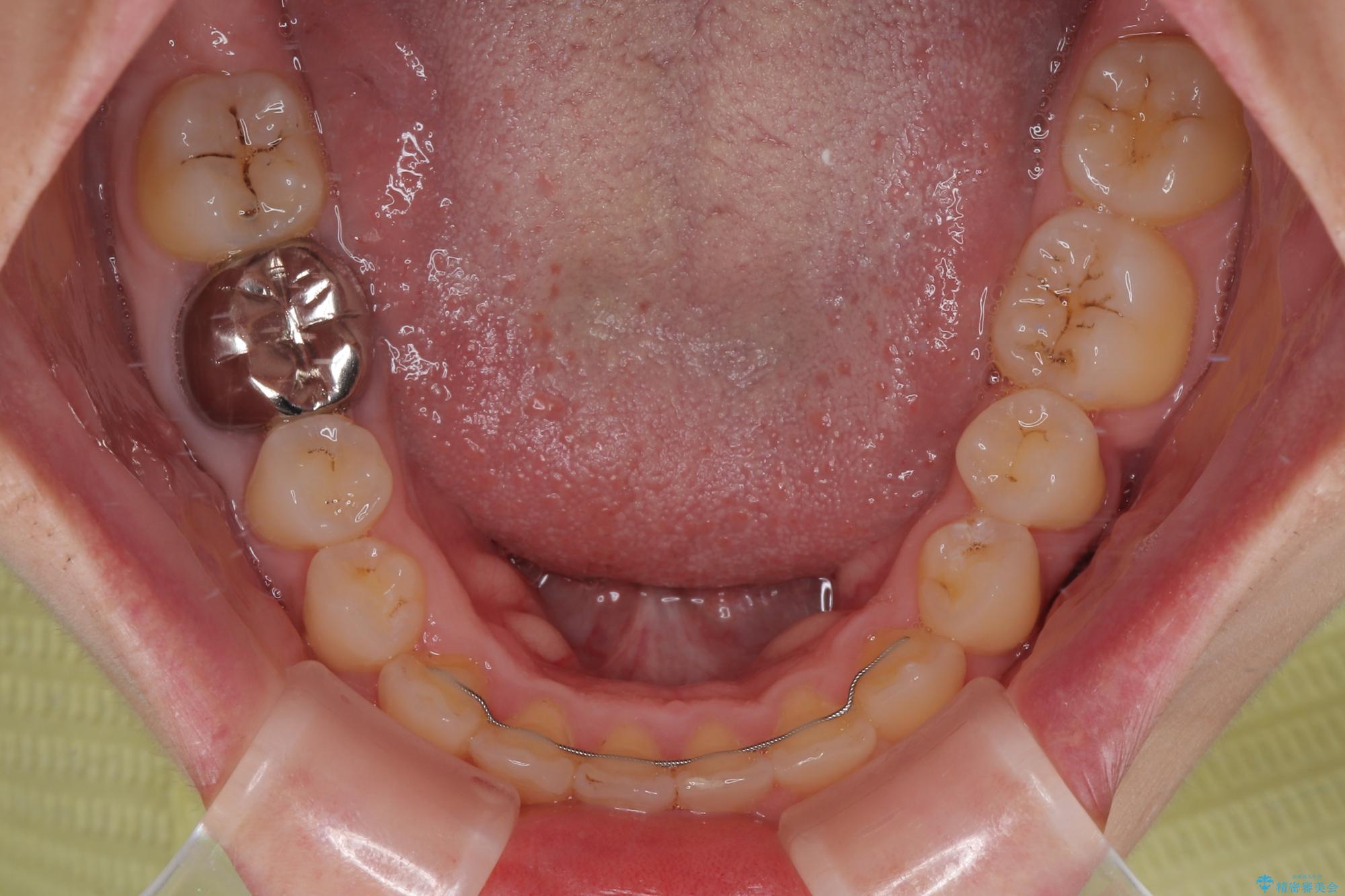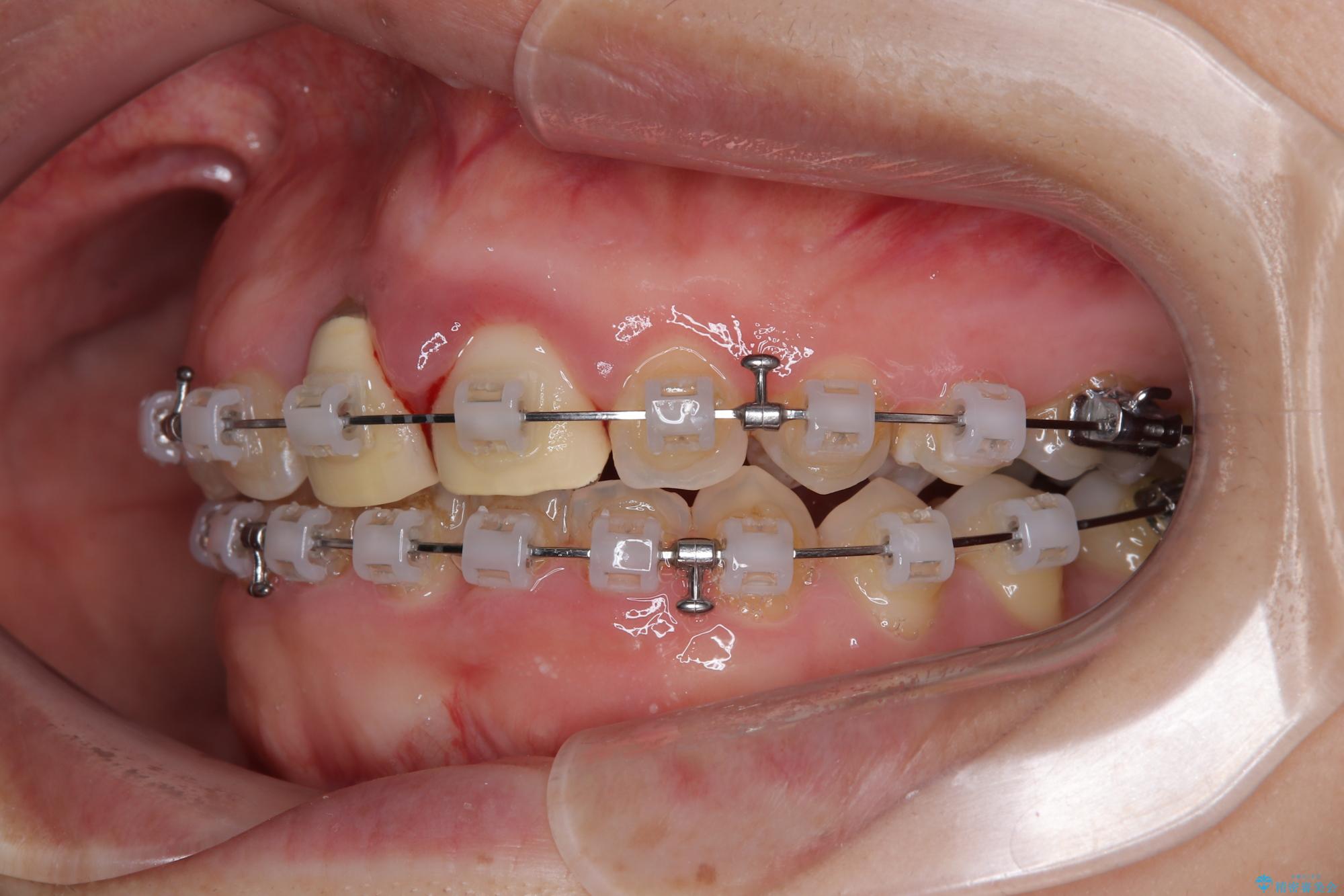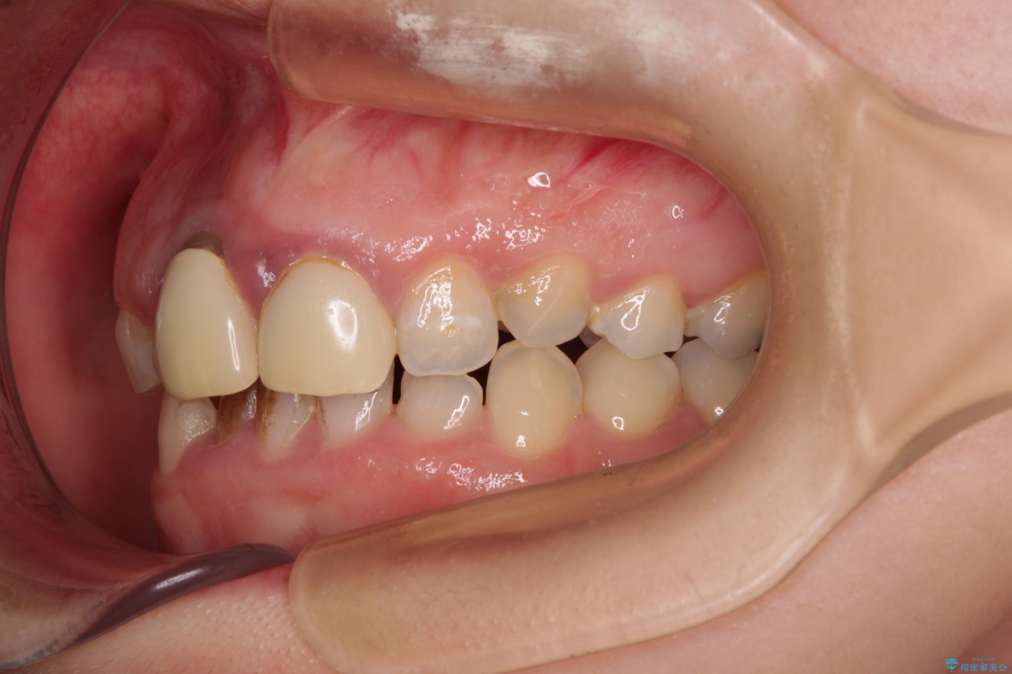前歯のクラウンは、歯肉内深くに削り込まれており、歯肉の炎症が継続していたため、矯正治療後に歯周外科処置を行い、歯肉の腫れを改善させました。