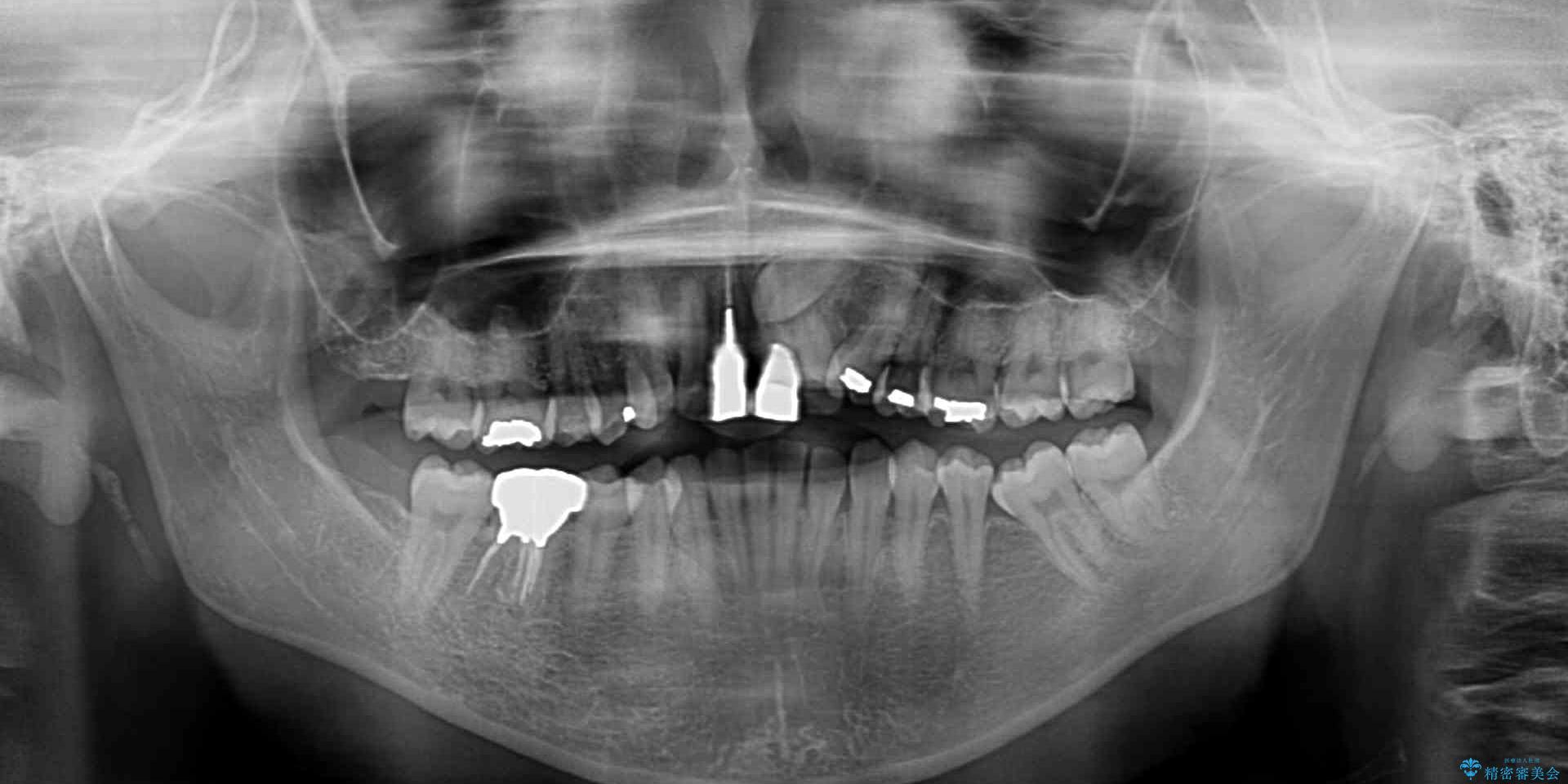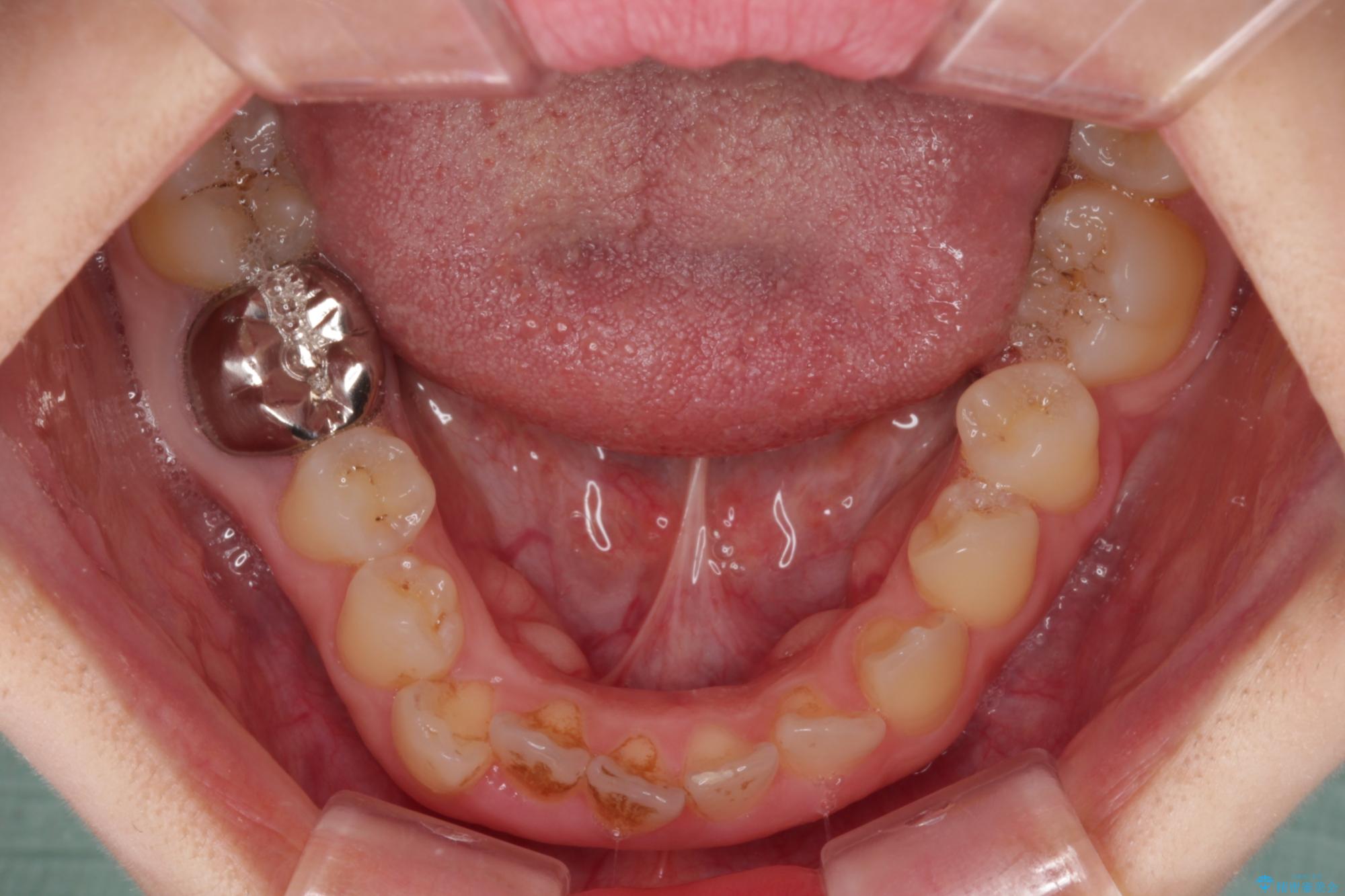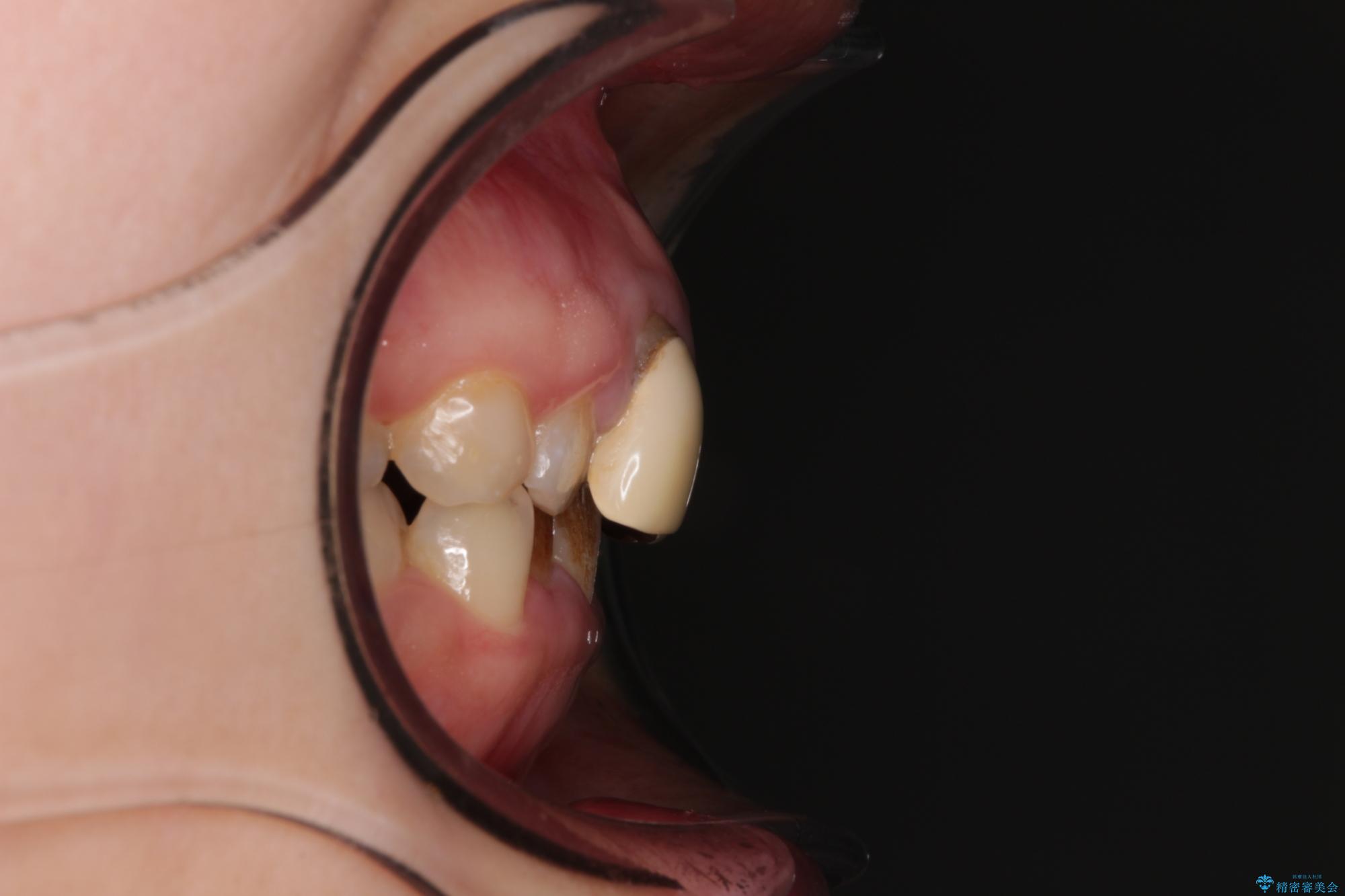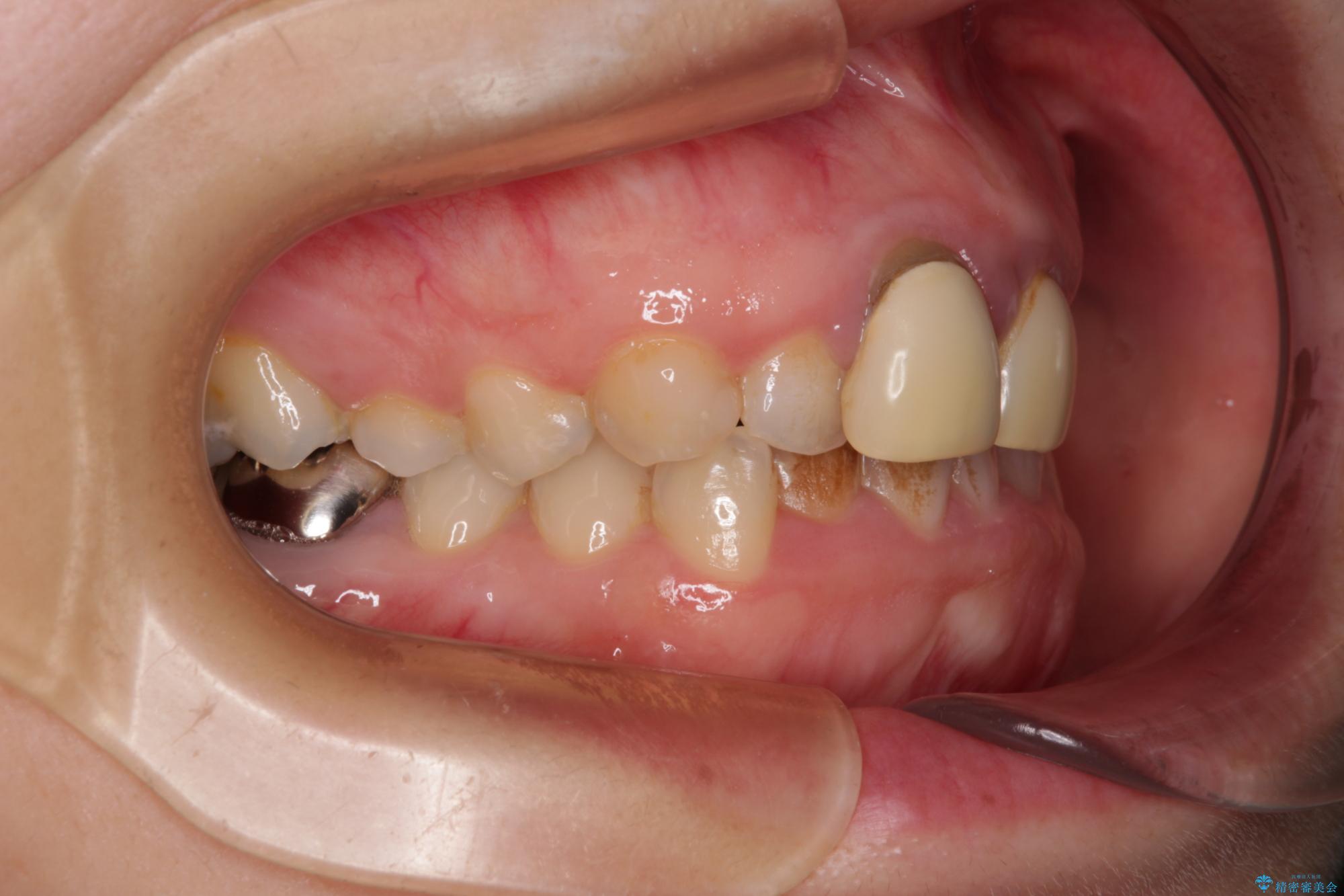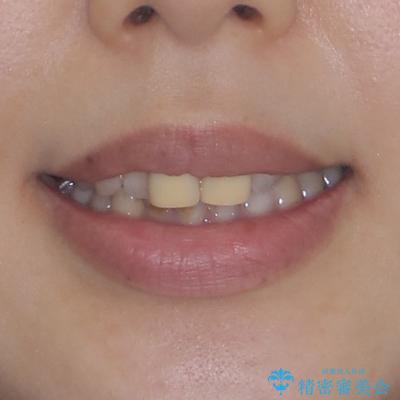 前歯のクラウンは、歯肉内深くに削り込まれており、歯肉の炎症が継続していたため、矯正治療後に歯周外科処置を行い、歯肉の腫れを改善させました。