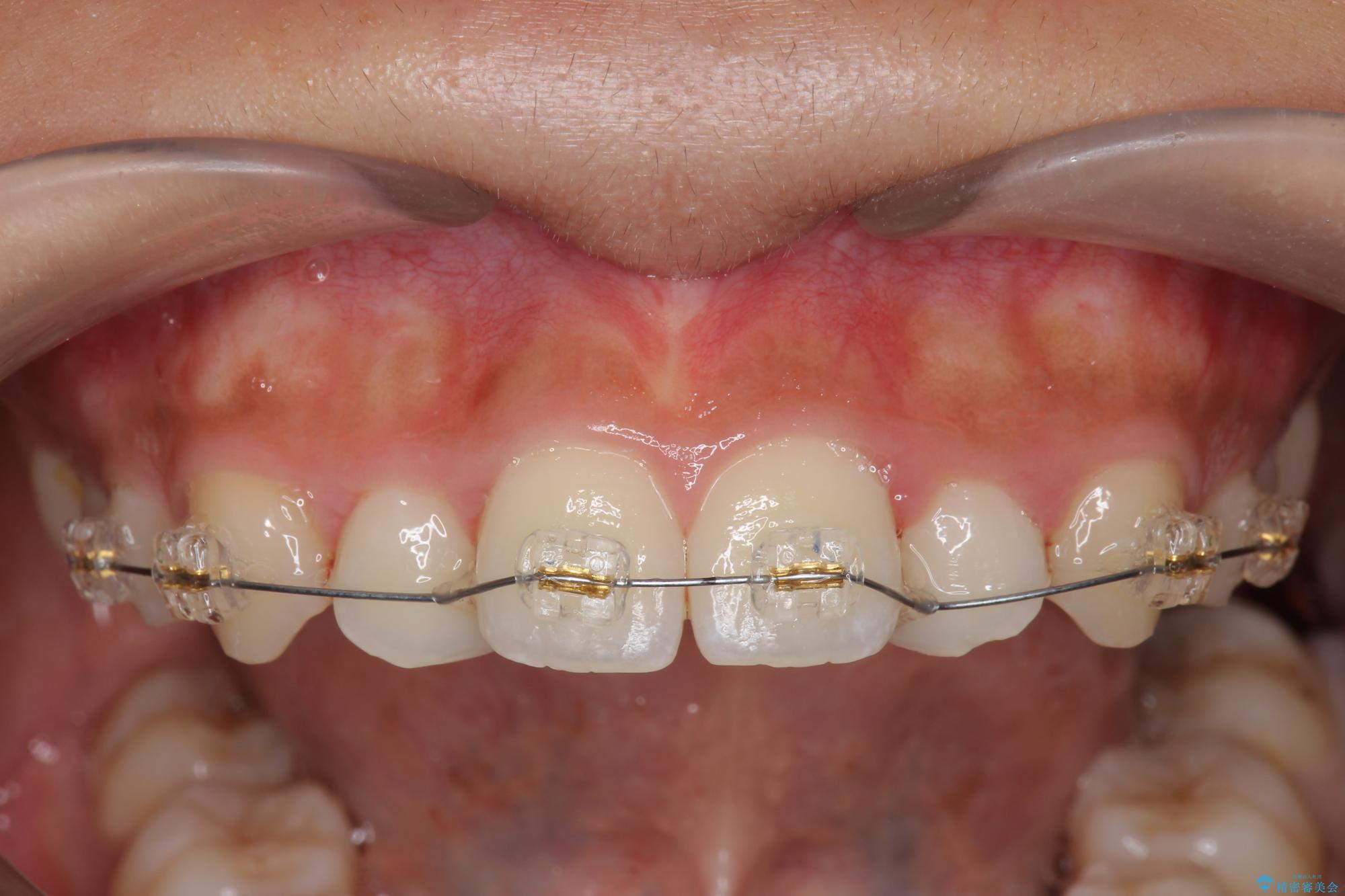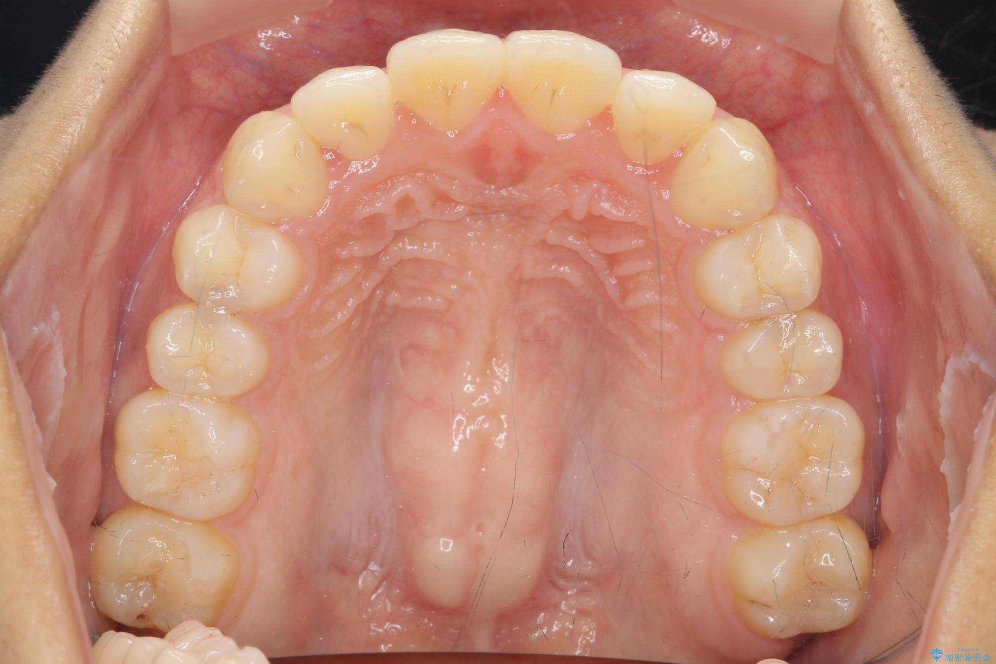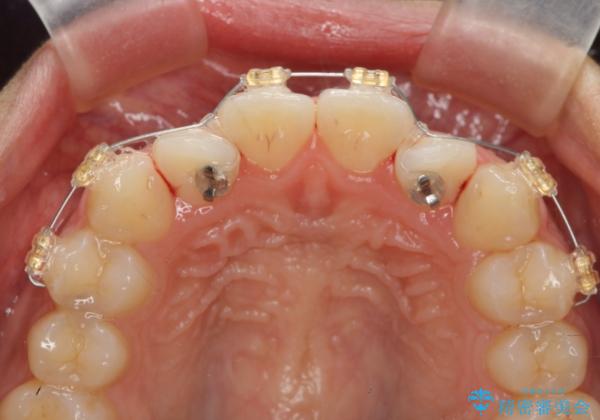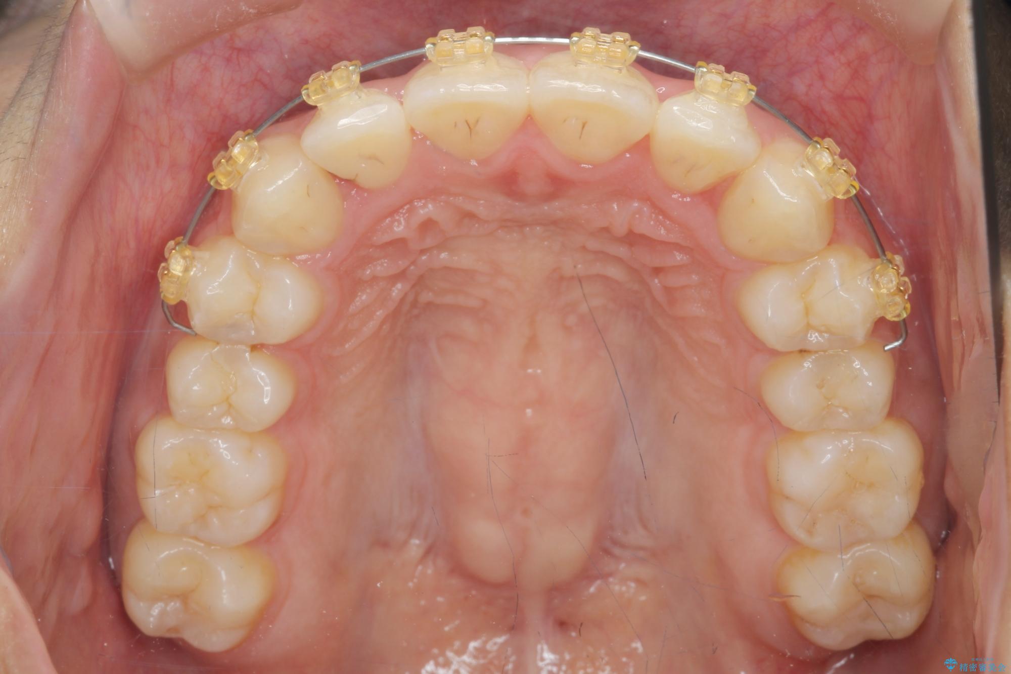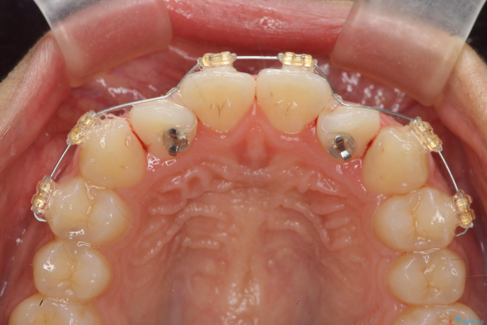 上顎前歯のみの部分ワイヤー治療を約6ヶ月行い、ねじれの問題を解決したのち、マウスピース矯正で細かな歯列を整えていきます。