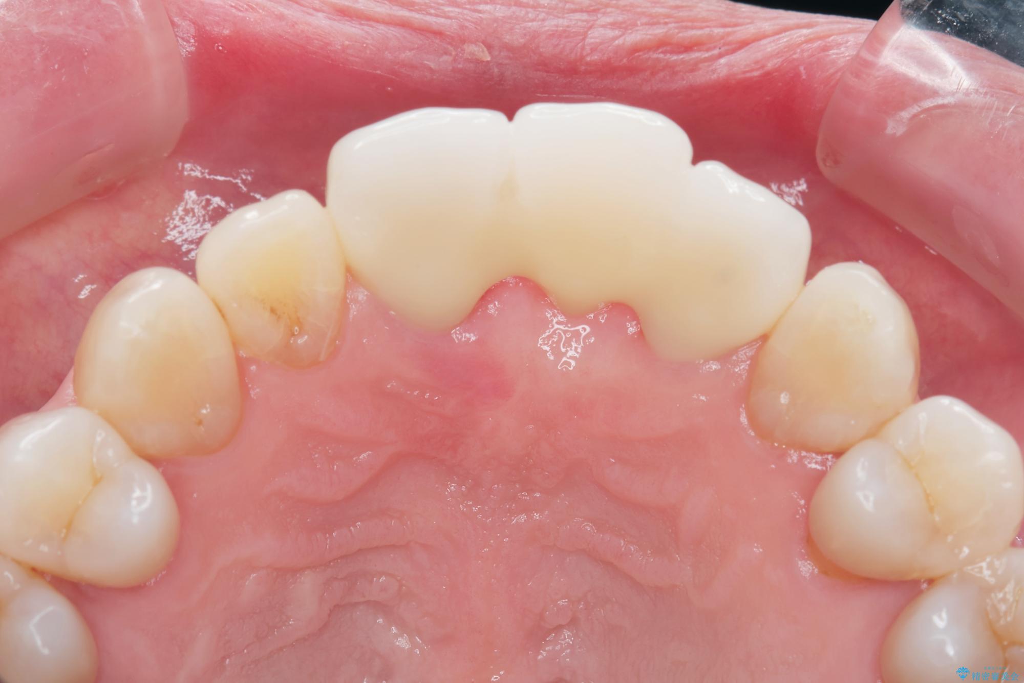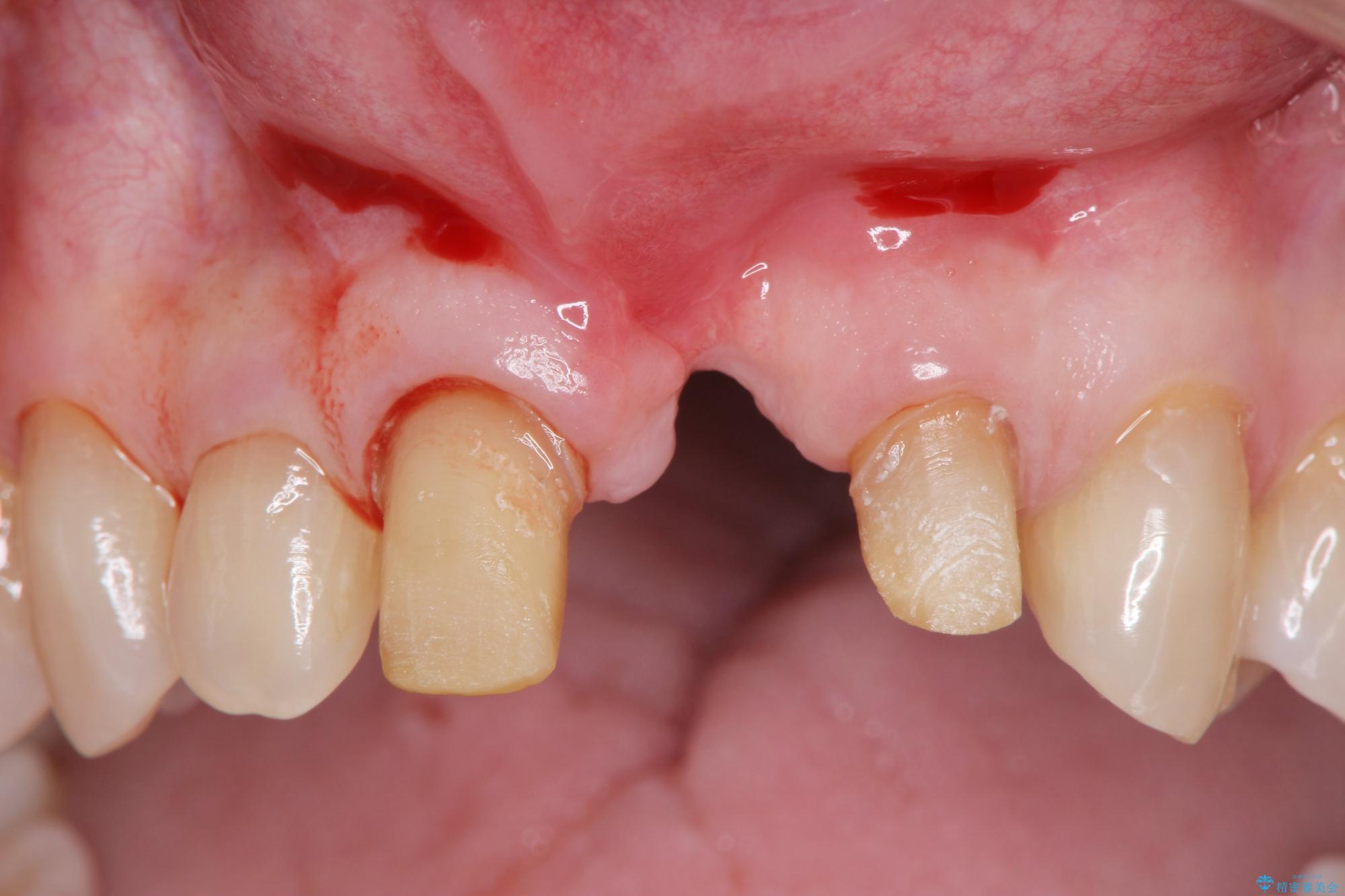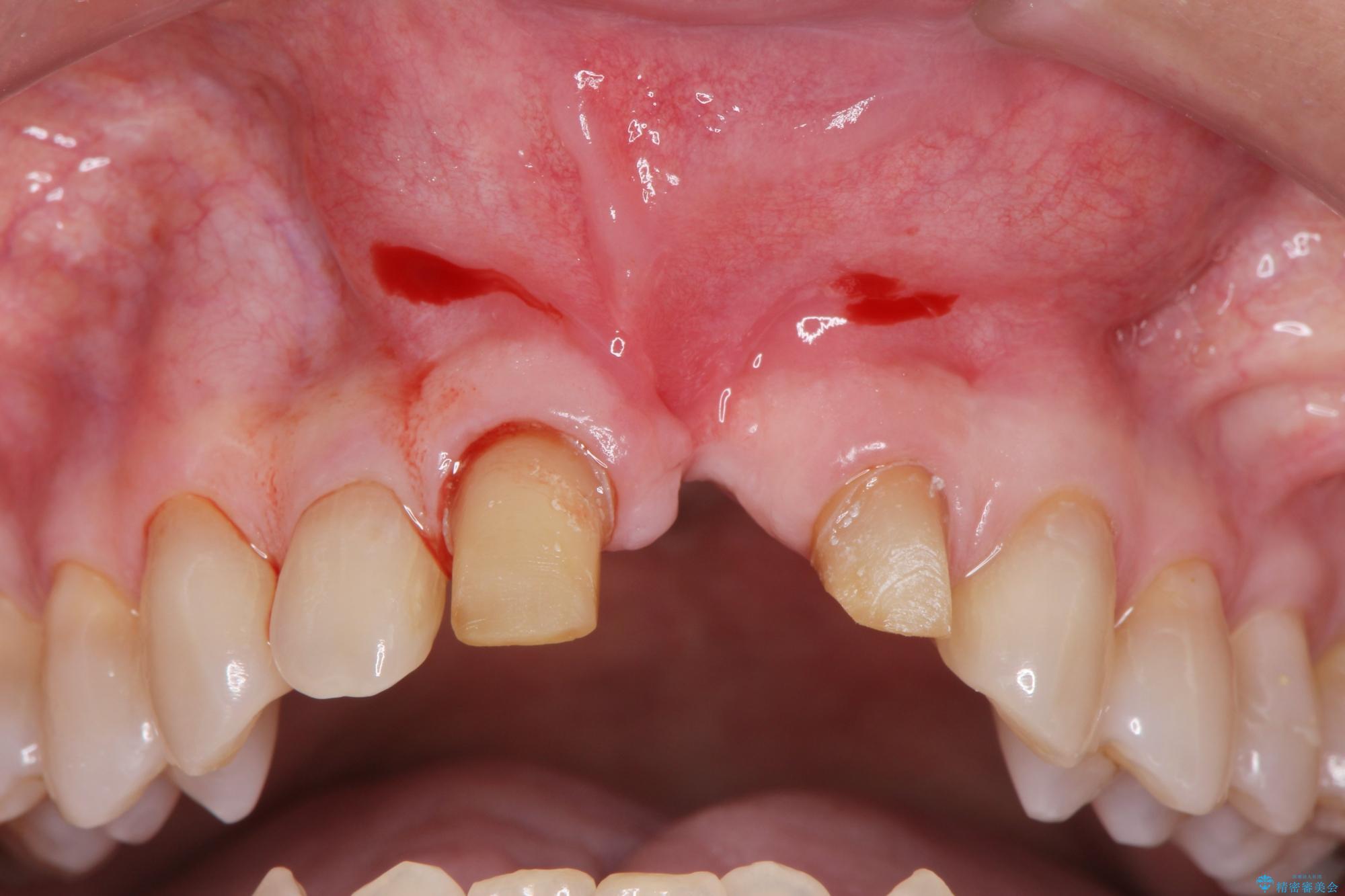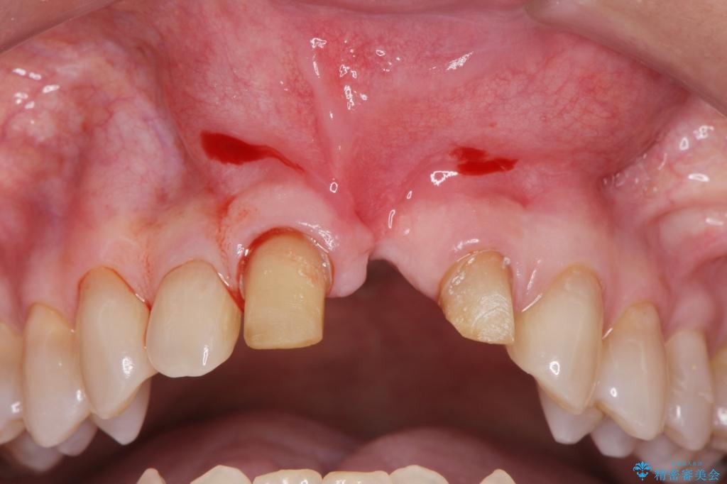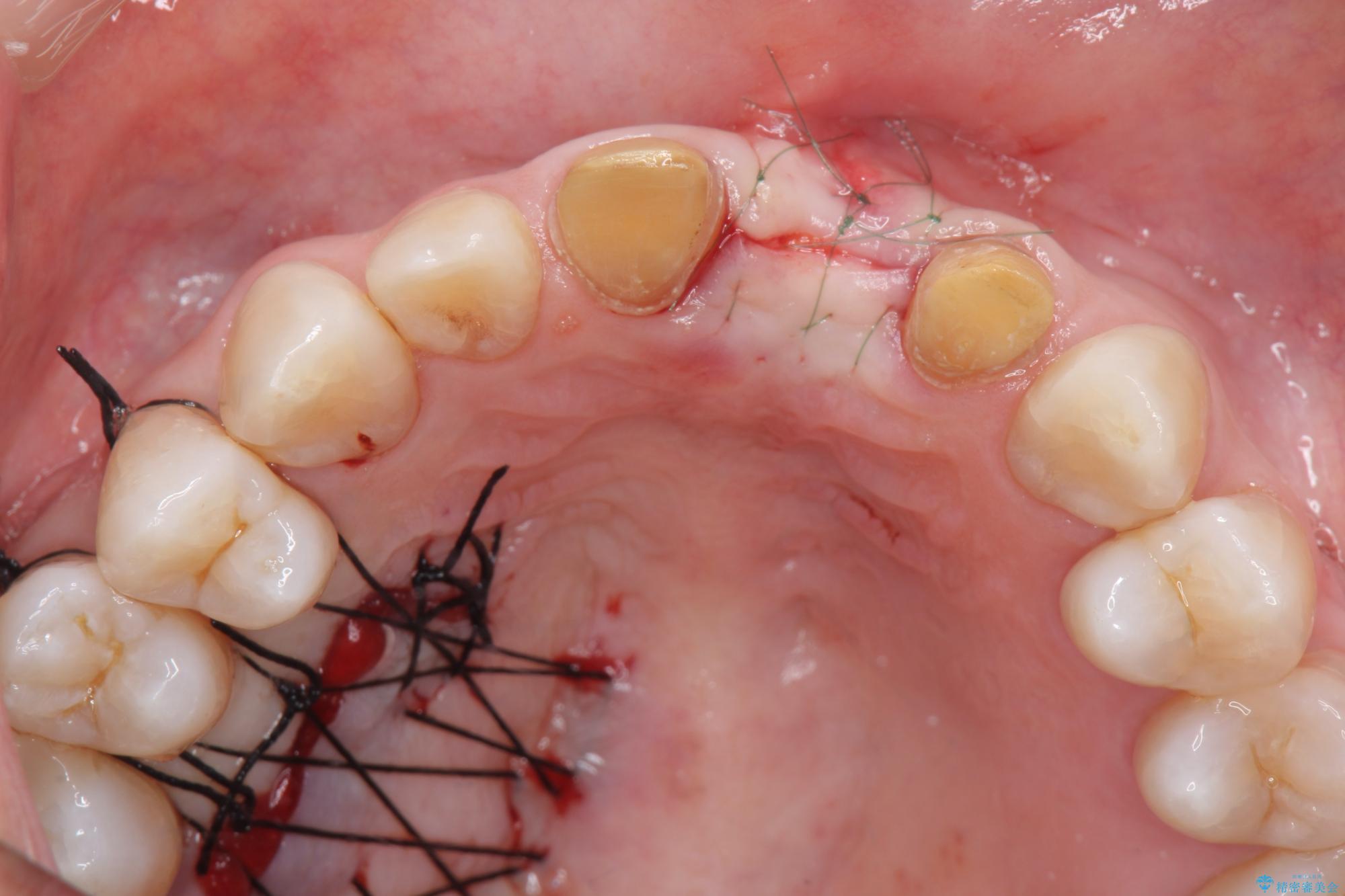 骨の吸収が著しく、抜歯後は大きな骨欠損が生じ、歯肉が凹むことで審美障害が起きることが想定されたため、歯槽骨増大や歯肉移植を伴うブリッジ治療を行うこととしました.