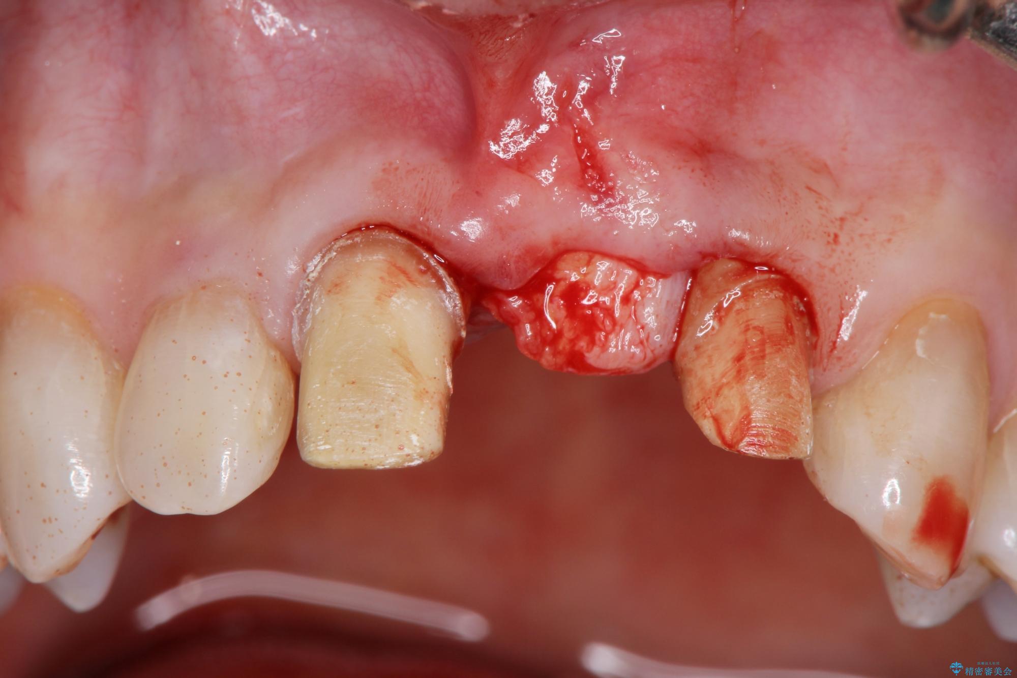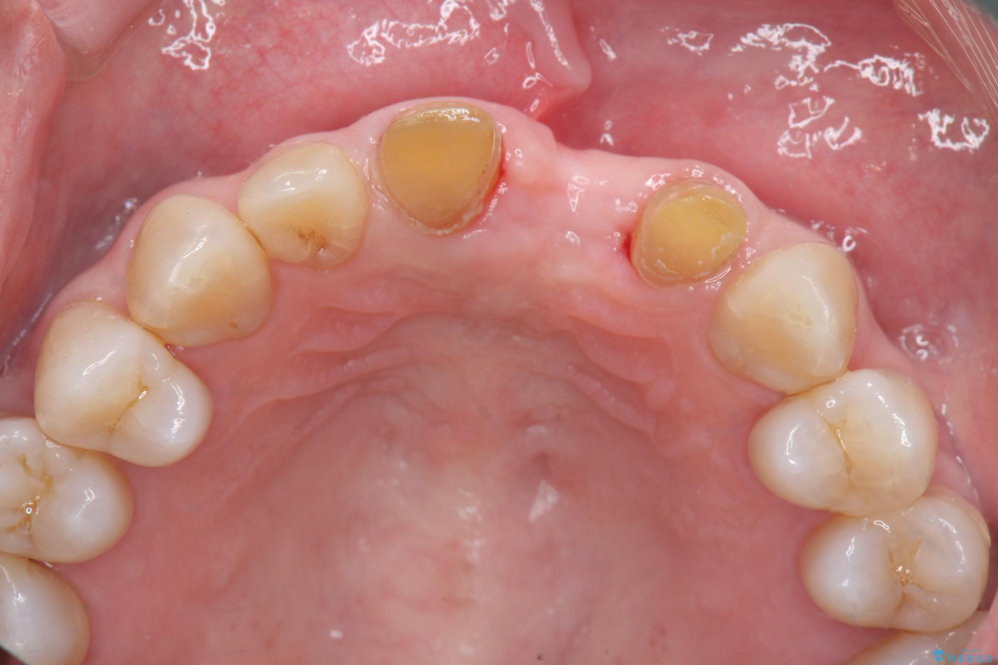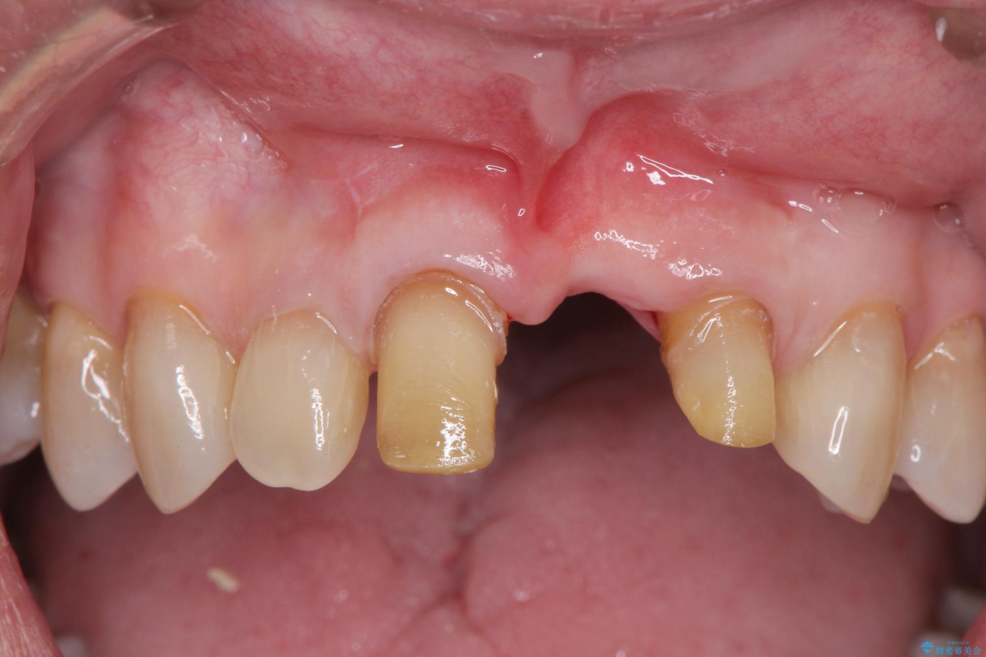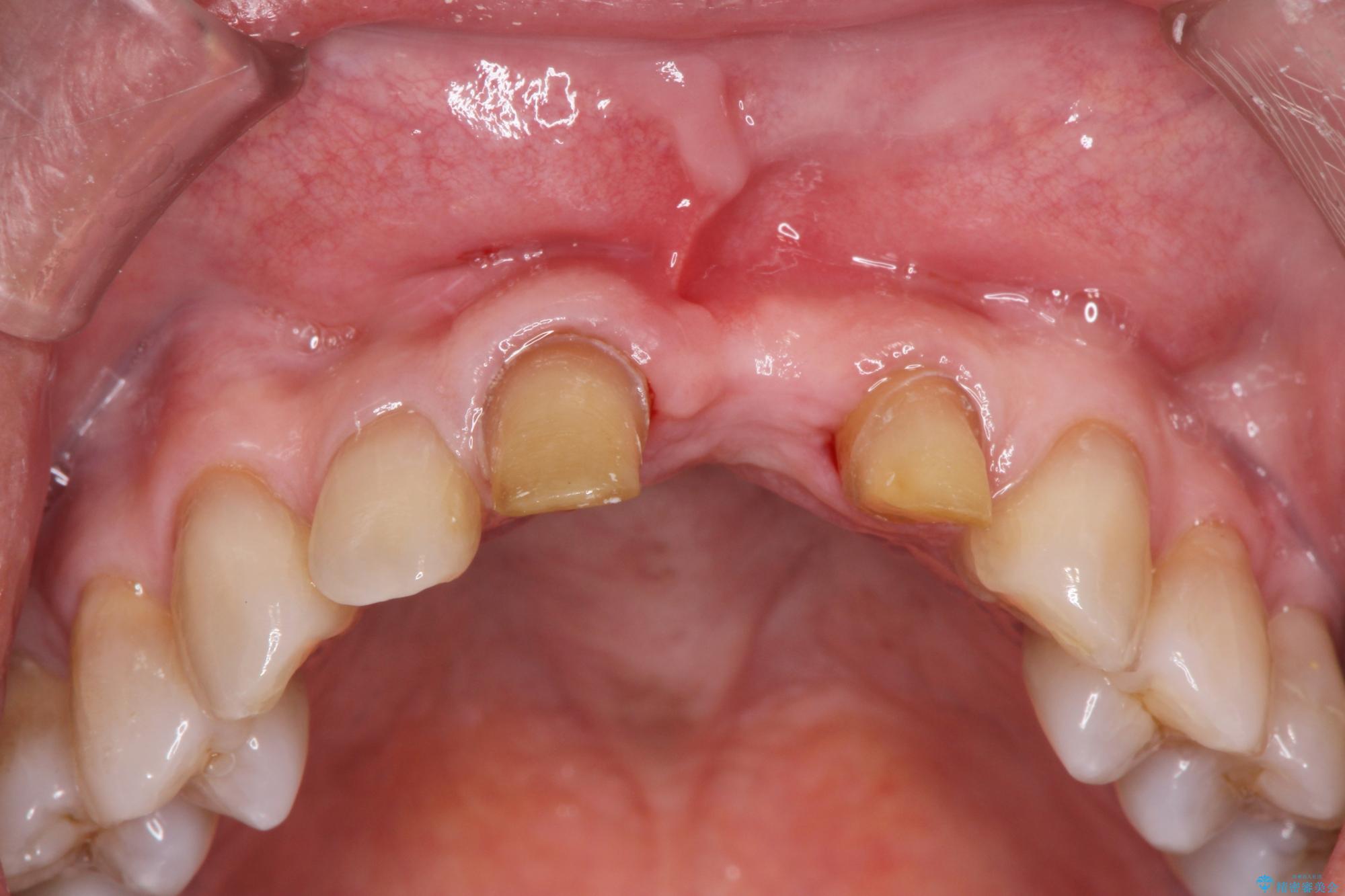 骨の吸収が著しく、抜歯後は大きな骨欠損が生じ、歯肉が凹むことで審美障害が起きることが想定されたため、歯槽骨増大や歯肉移植を伴うブリッジ治療を行うこととしました.