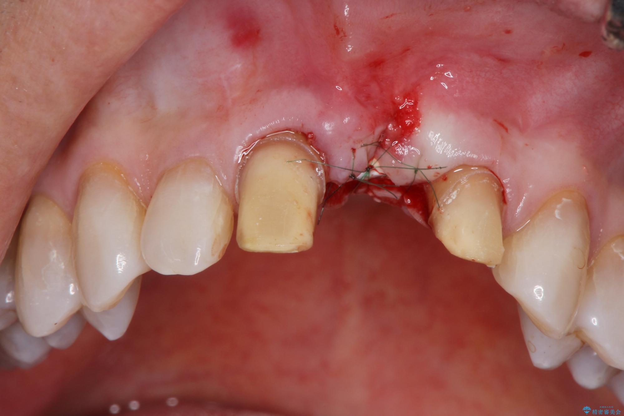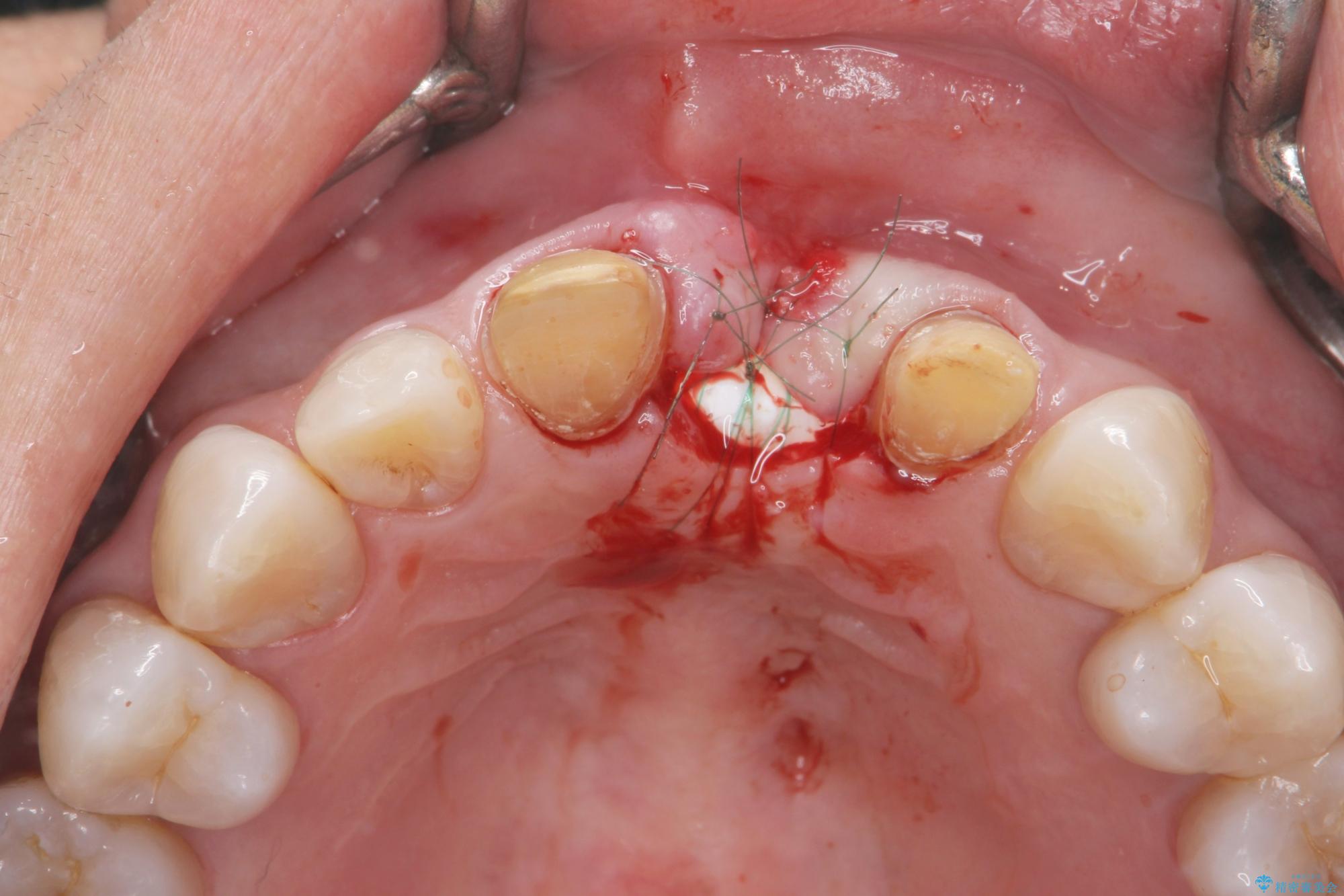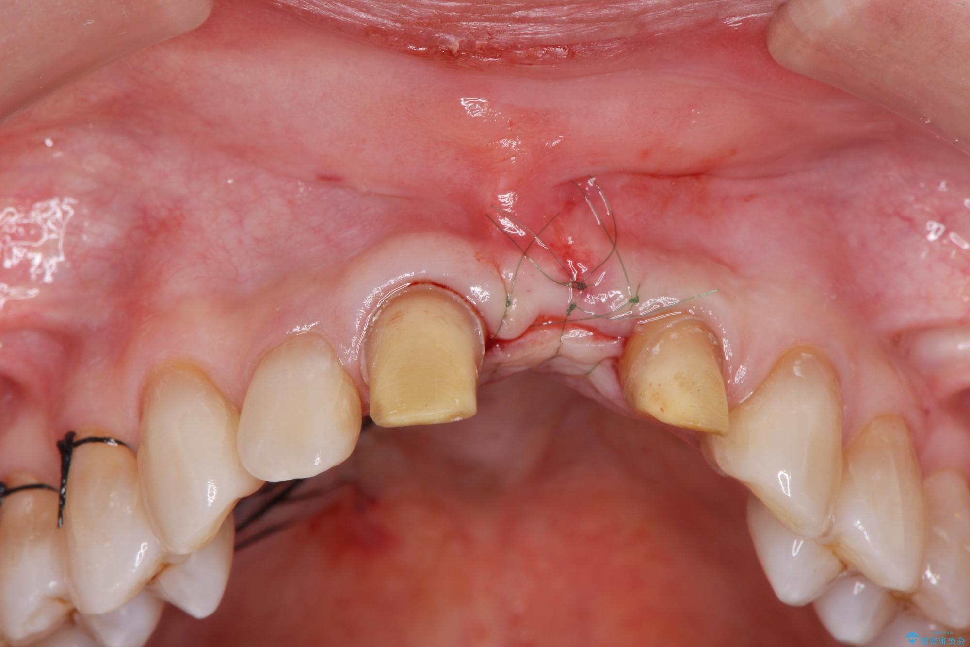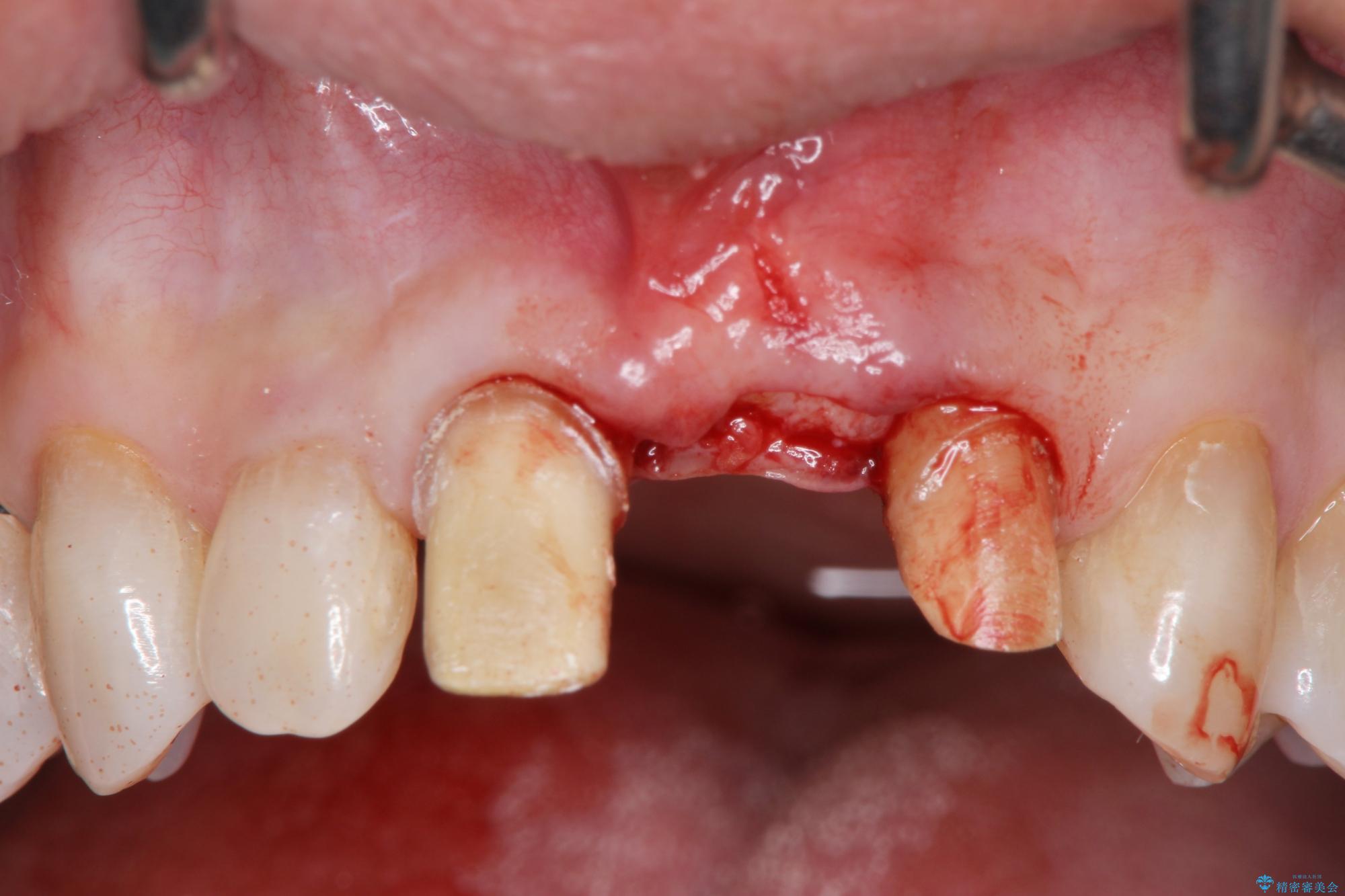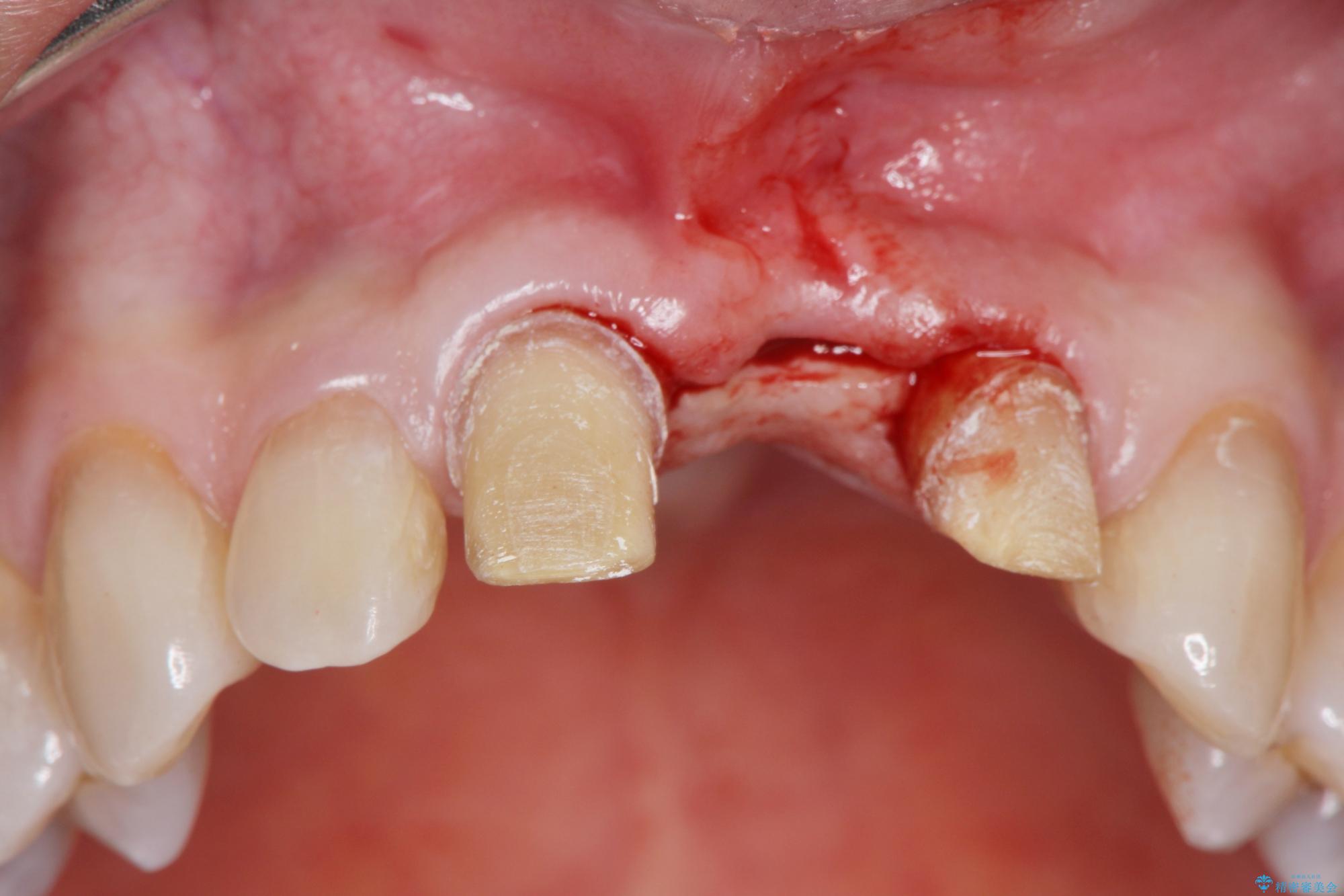 骨の吸収が著しく、抜歯後は大きな骨欠損が生じ、歯肉が凹むことで審美障害が起きることが想定されたため、歯槽骨増大や歯肉移植を伴うブリッジ治療を行うこととしました.