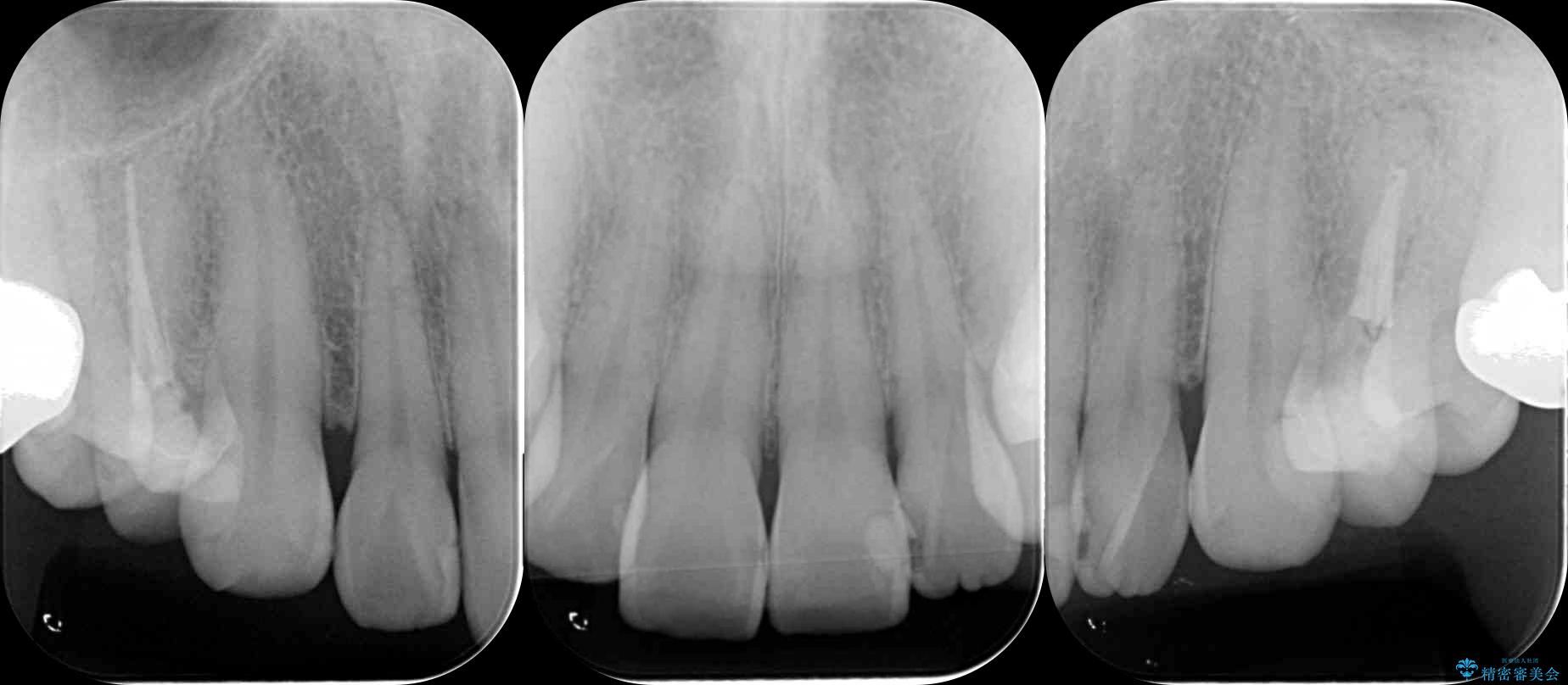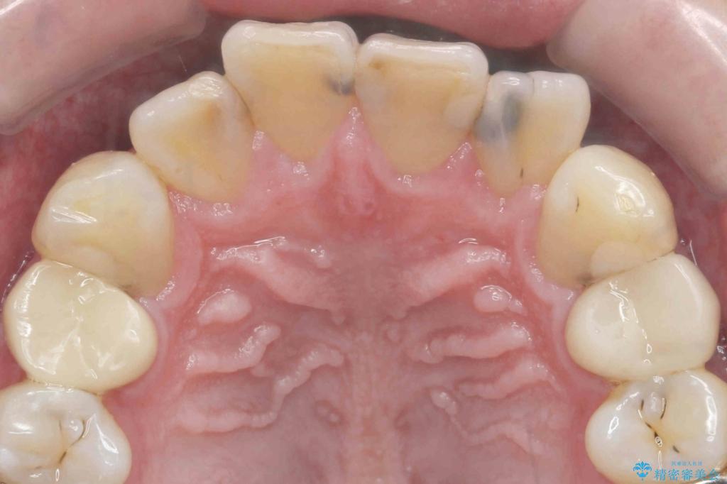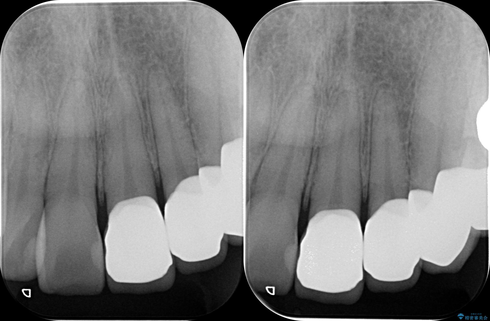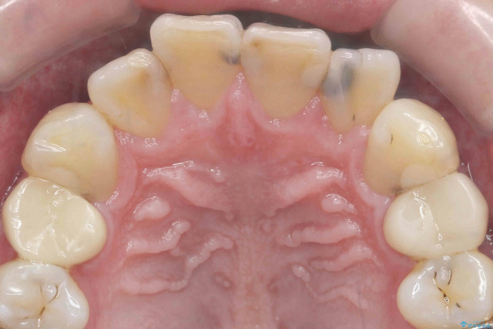 視診、X線写真より前歯に発生した大きな虫歯が認められました。