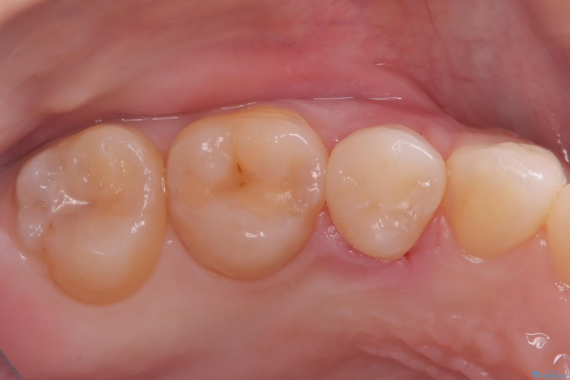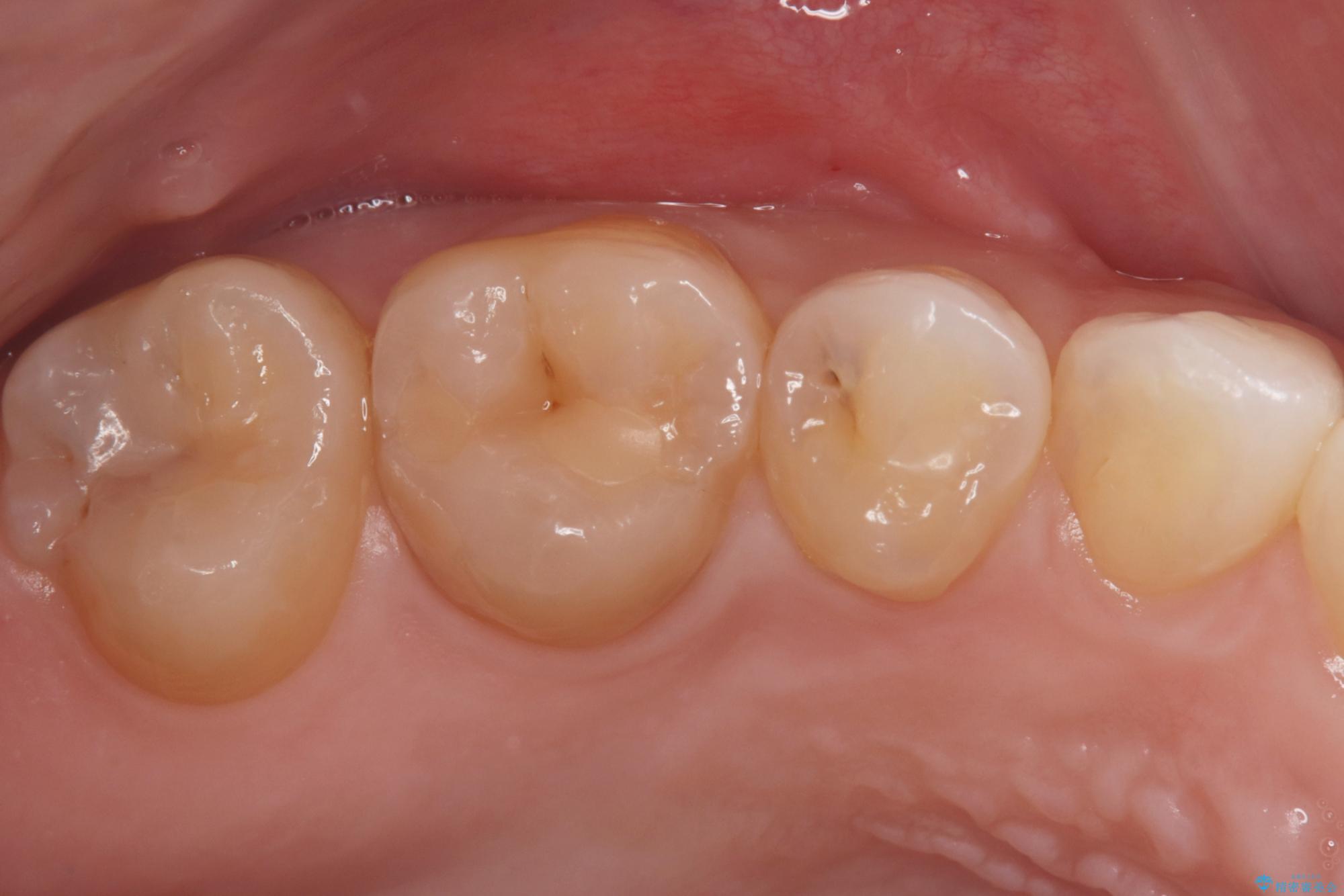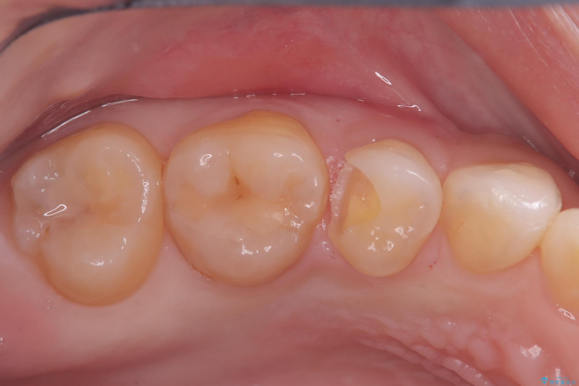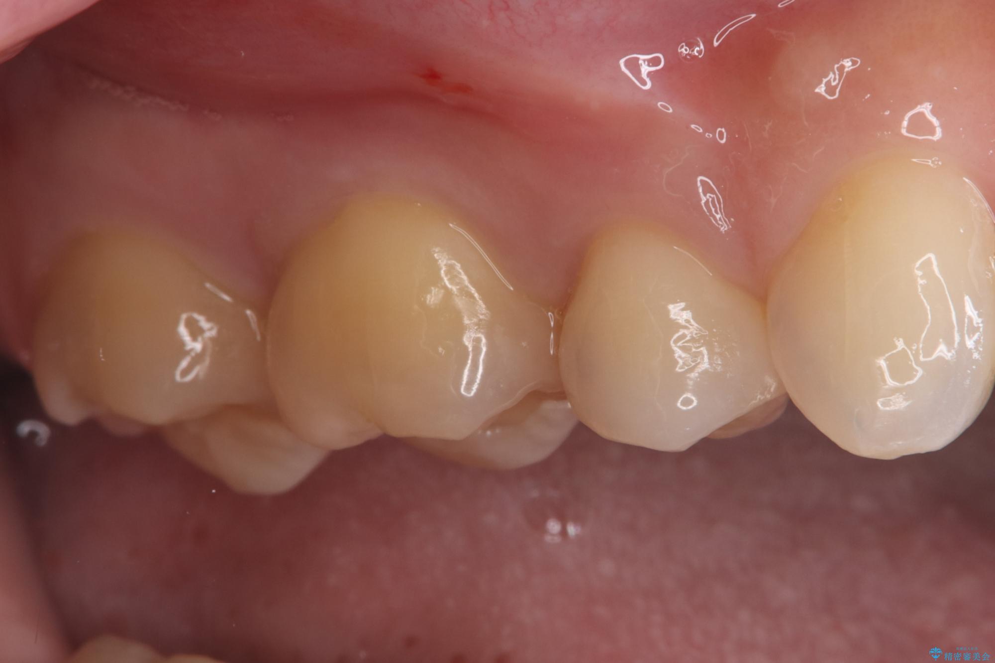後日、歯の色調に合わせてオーダーメイドで作製されたセラミックインレーを装着。セラミックは天然歯のような透明感があるため、修復した箇所がどこかわからないほど自然な仕上がりとなりました。