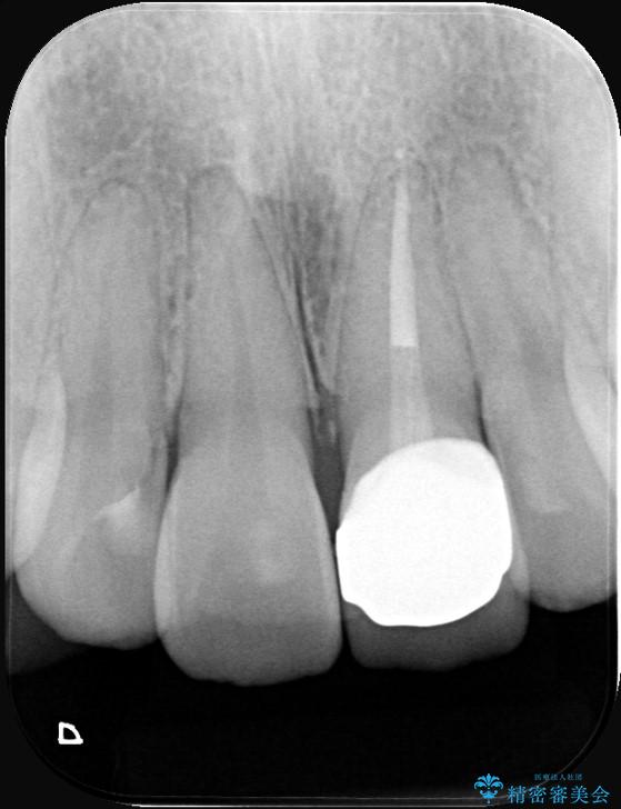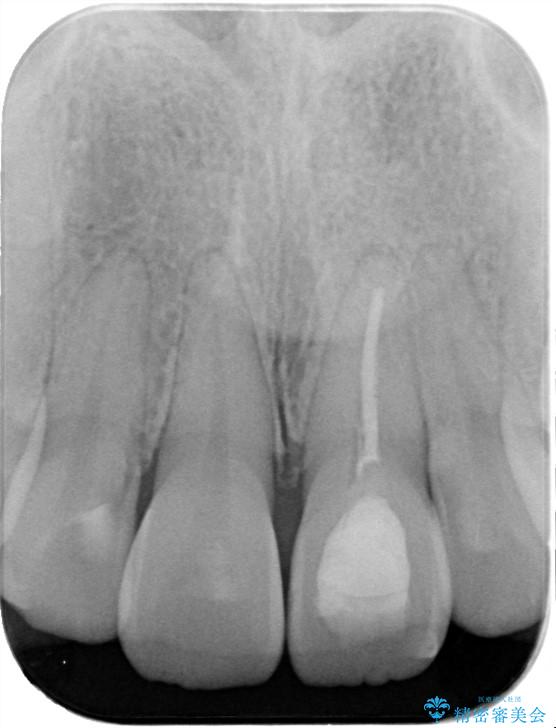 - 「以前、他院で神経を取った前歯がだんだん黒ずんできた」という見た目の改善を主訴にご来院されました。 診査の結果、神経を取り除いた後の歯(失活歯)特有の変色が起きており、さらに根の先端にわずかな影が見られたため、内部で感染が起きている可能性がありました。