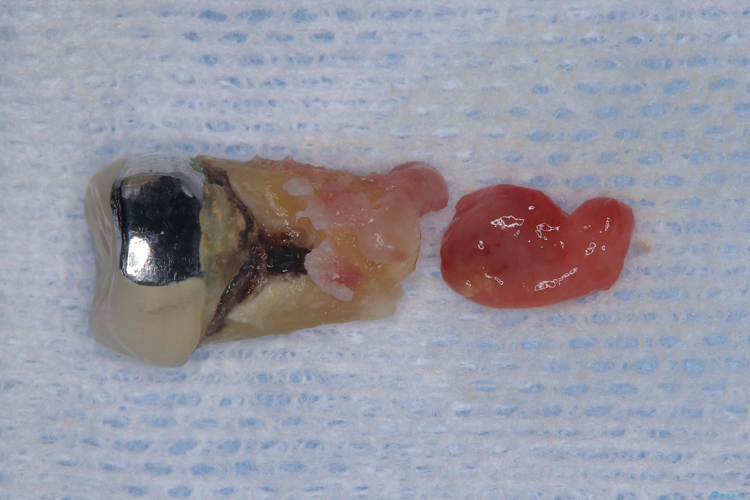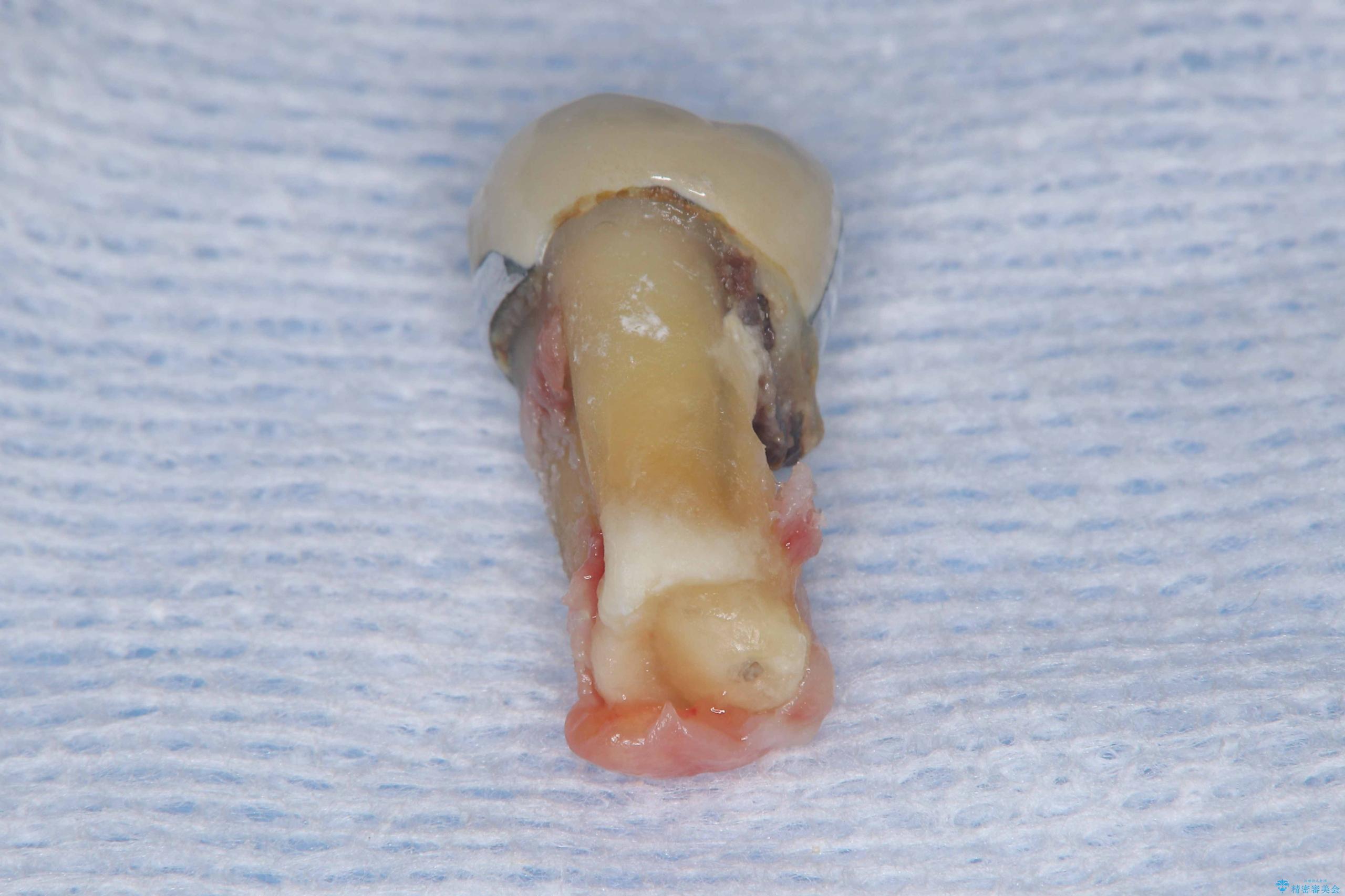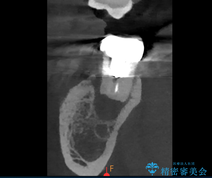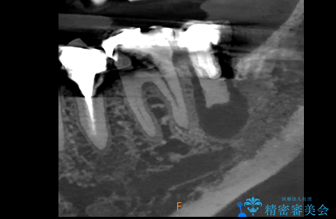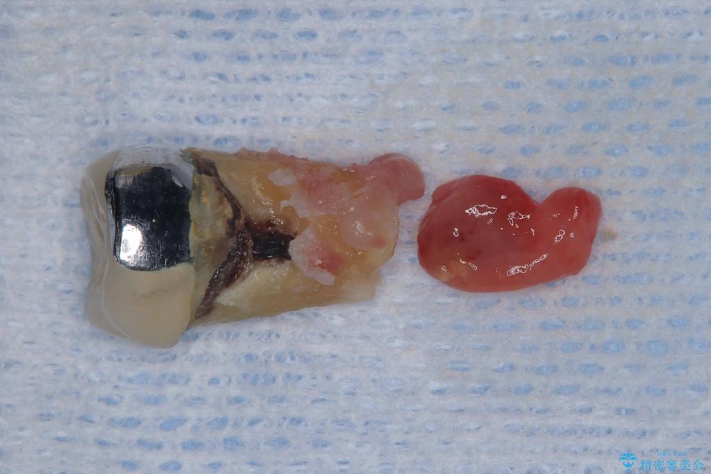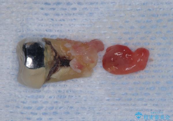 - 過去にヘミセクションが行われていたと思われる左下7番は、大きな歯根嚢胞および根尖病変が認められ、さらに骨縁下カリエスを伴っており、歯肉には瘻孔が形成されている状態でした。