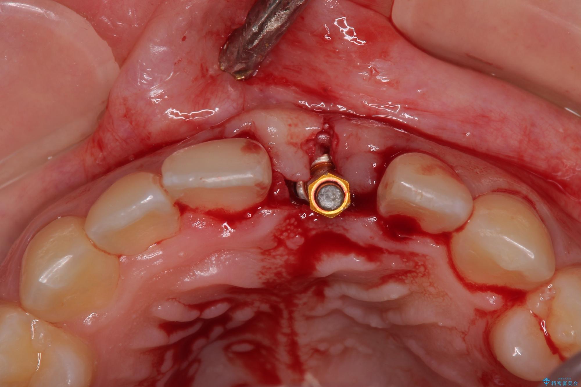 抜歯、インプラント埋入、仮歯の装着が同時に可能な1DAYインプラントを行いたいところでしたが、吸収による歯肉の炎症が著しいため、抜歯後に炎症が治まるまで待機し、極力早期にインプラント埋入を行うこととしました。