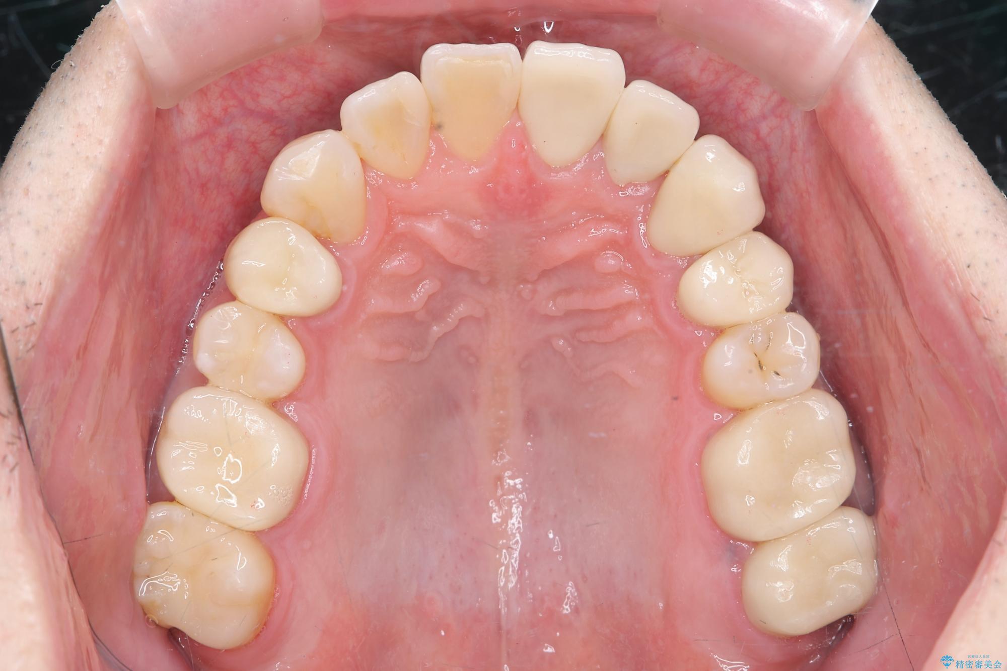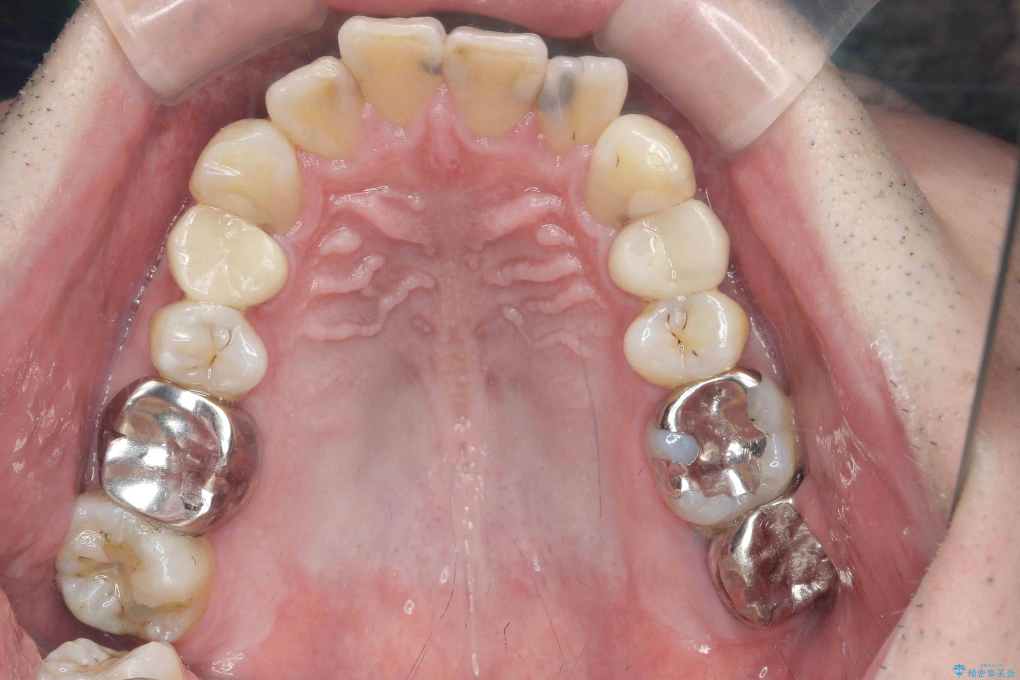 放置すると大きくなりそうな虫歯をまず治療、矯正治療を行ったのち、全ての銀歯を除去しセラミック治療を行う治療計画としました。