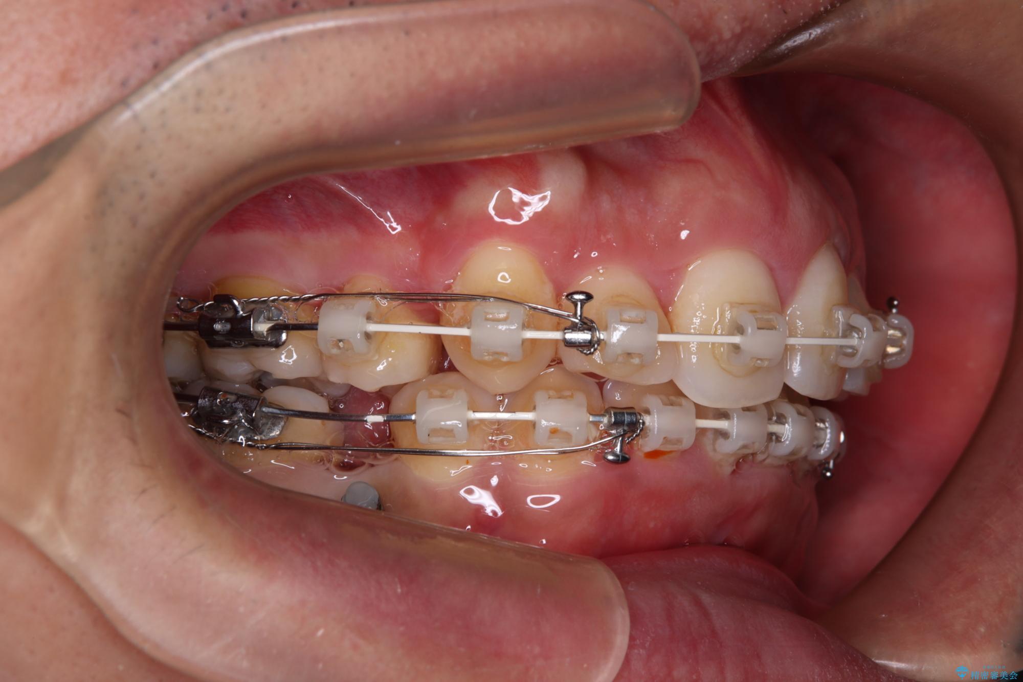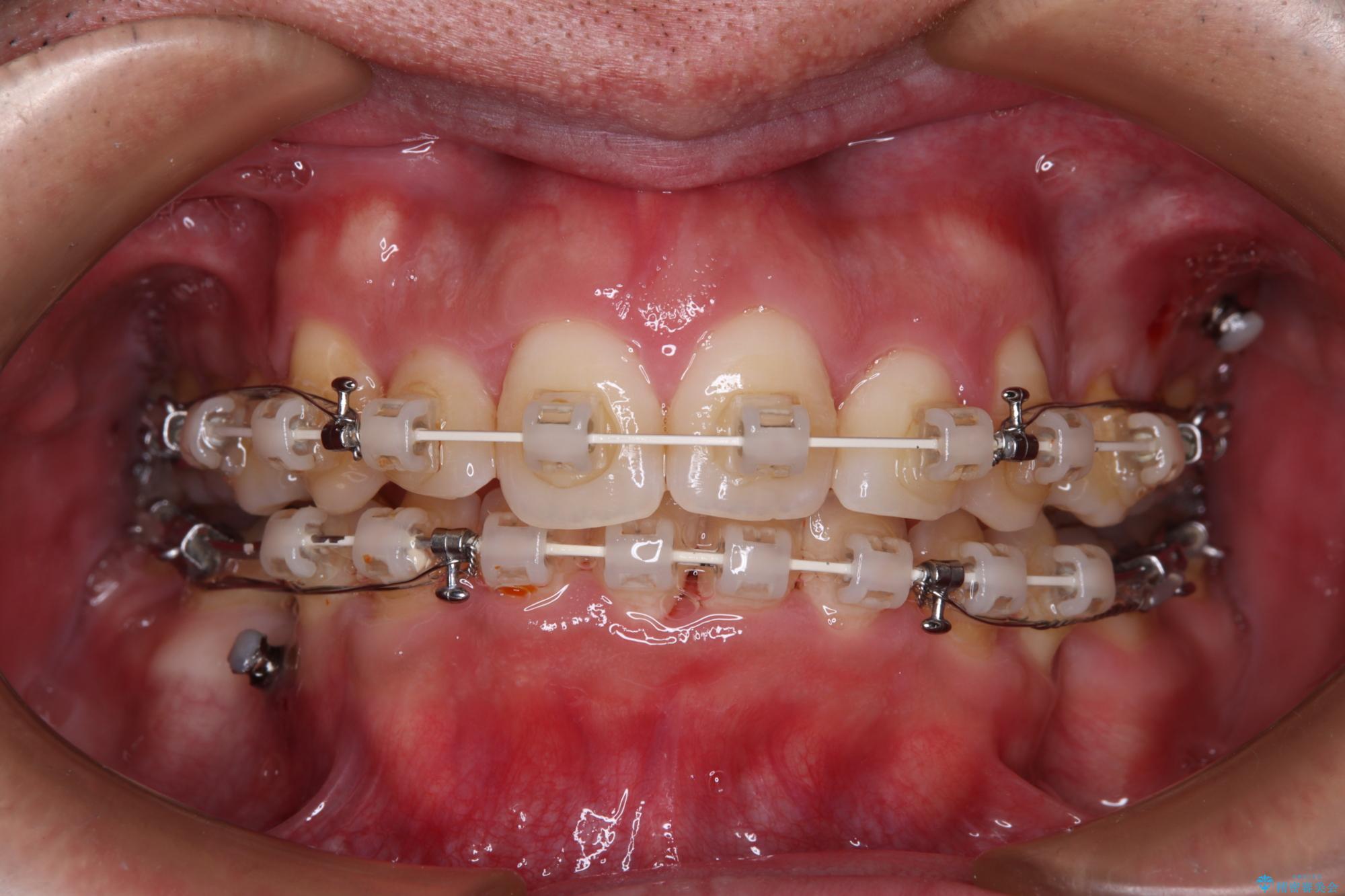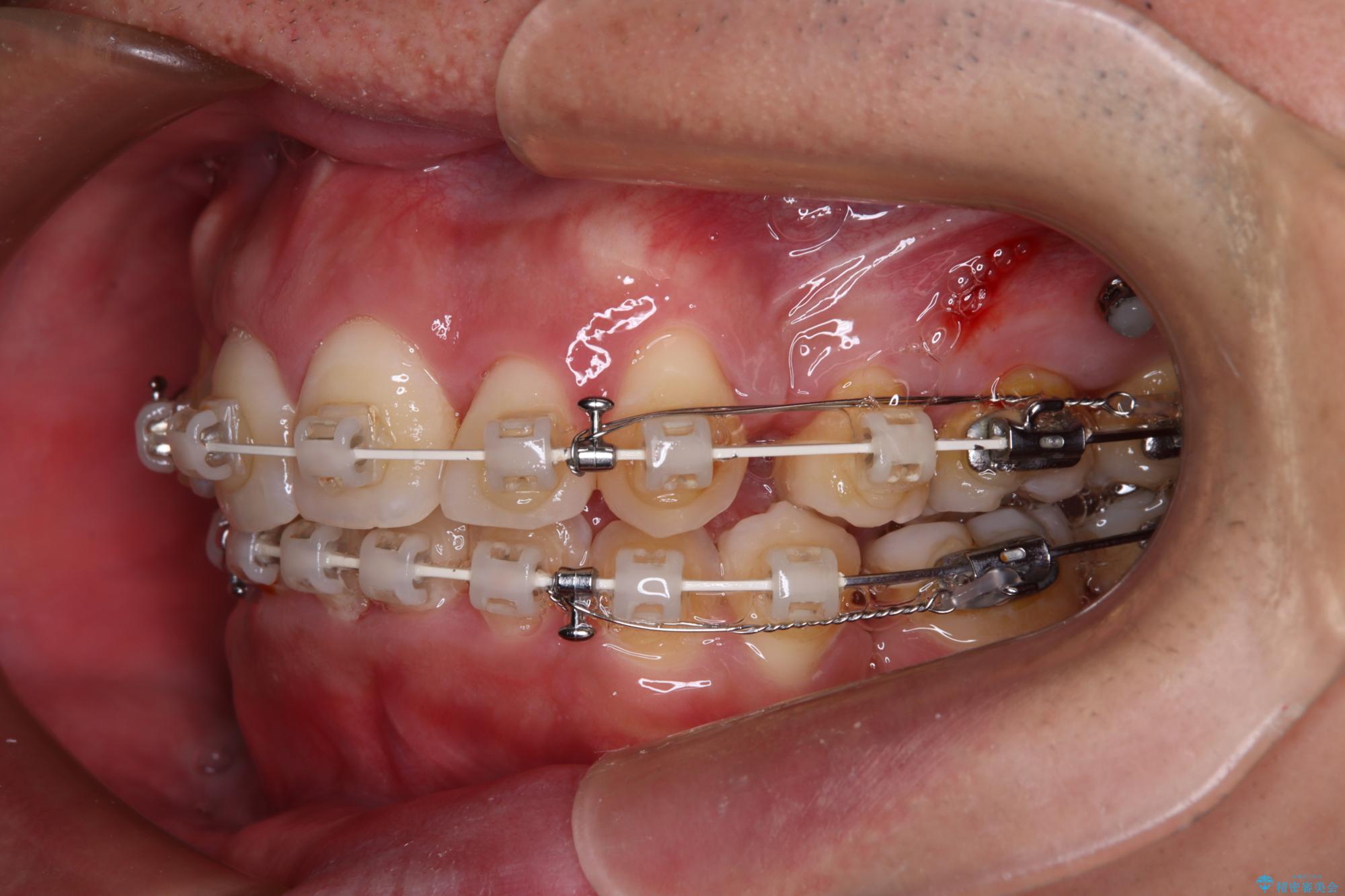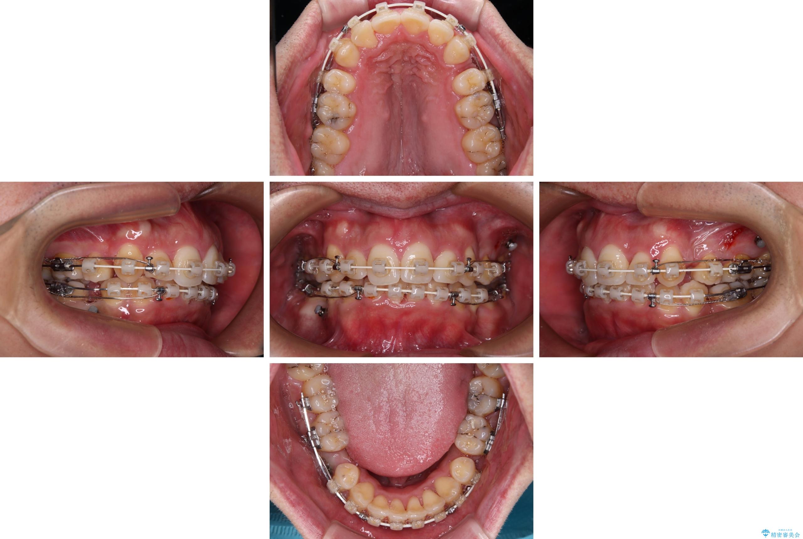 上顎歯列幅を側方に拡大するとともに、歯列全体を後方に移動させるためのアンカースクリューと補助装置を使用し、上顎左右第一小臼歯2本、下顎左右第二小臼歯2本、計4本を抜歯し、ワイヤー装置にて矯正治療を行うこととしました。