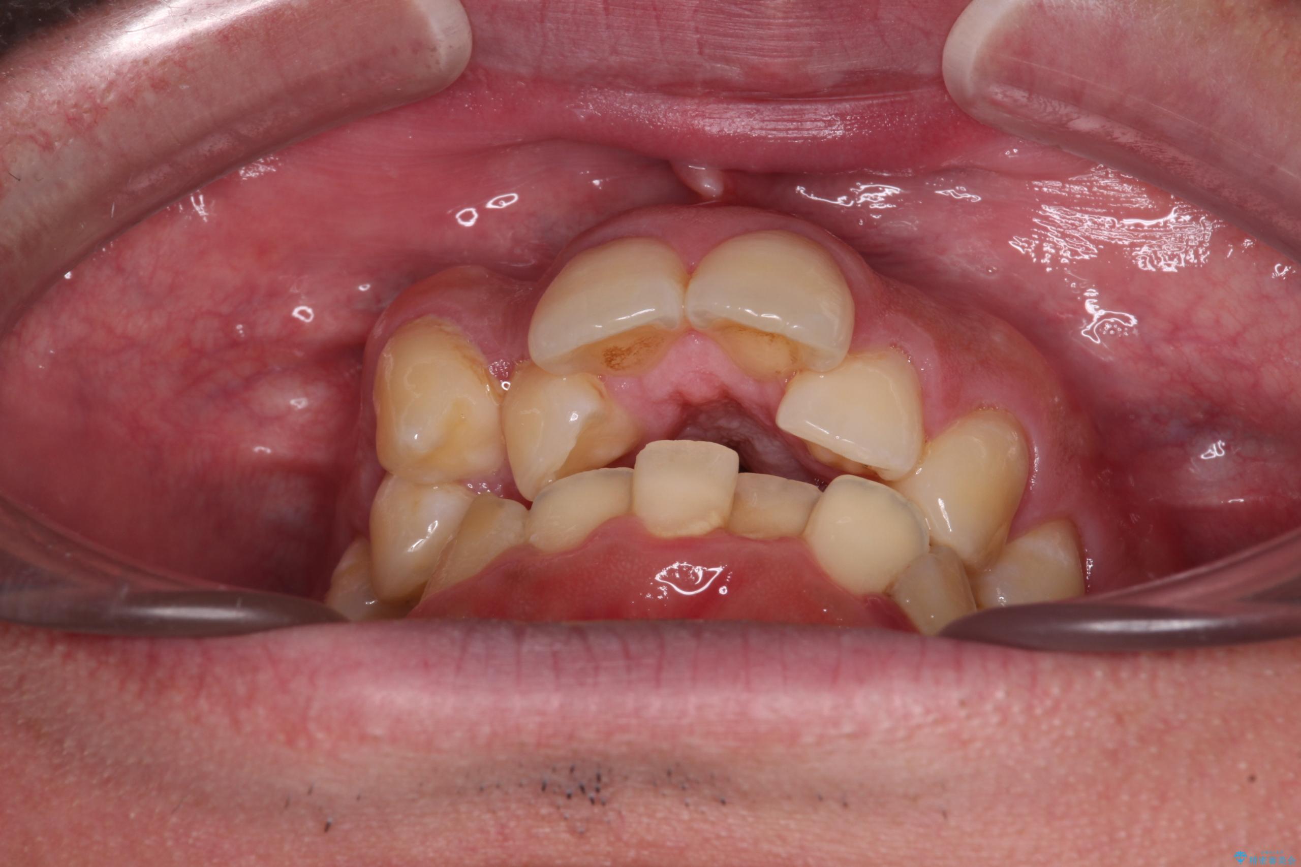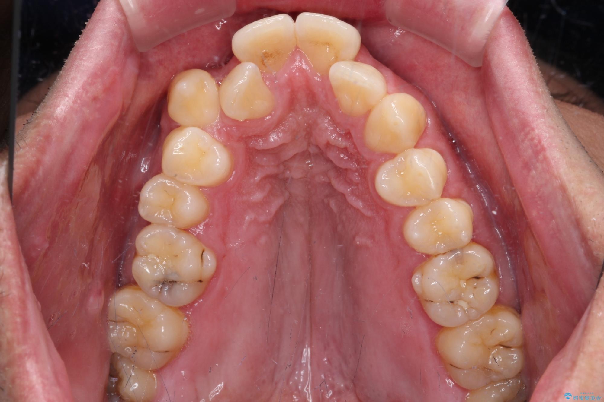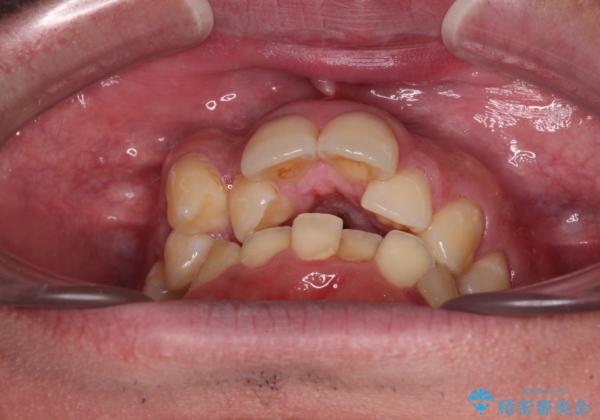 舌の突出癖などにより上顎前歯が前方に突出し、さらに歯列幅が狭小になっている状態でした。