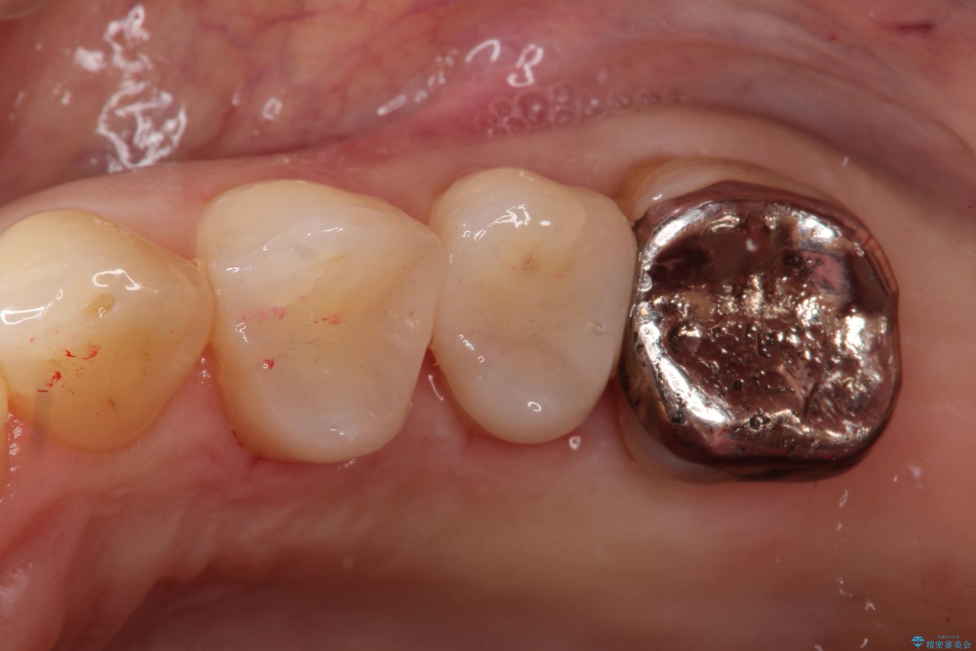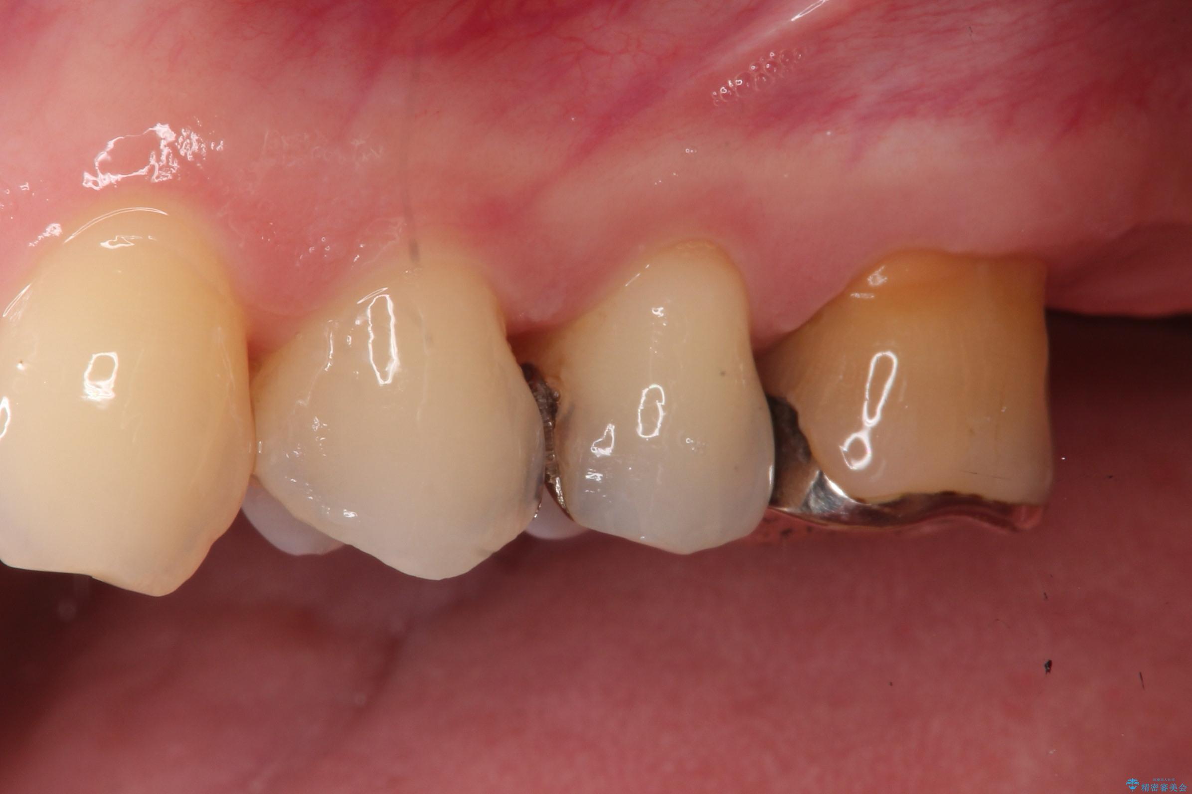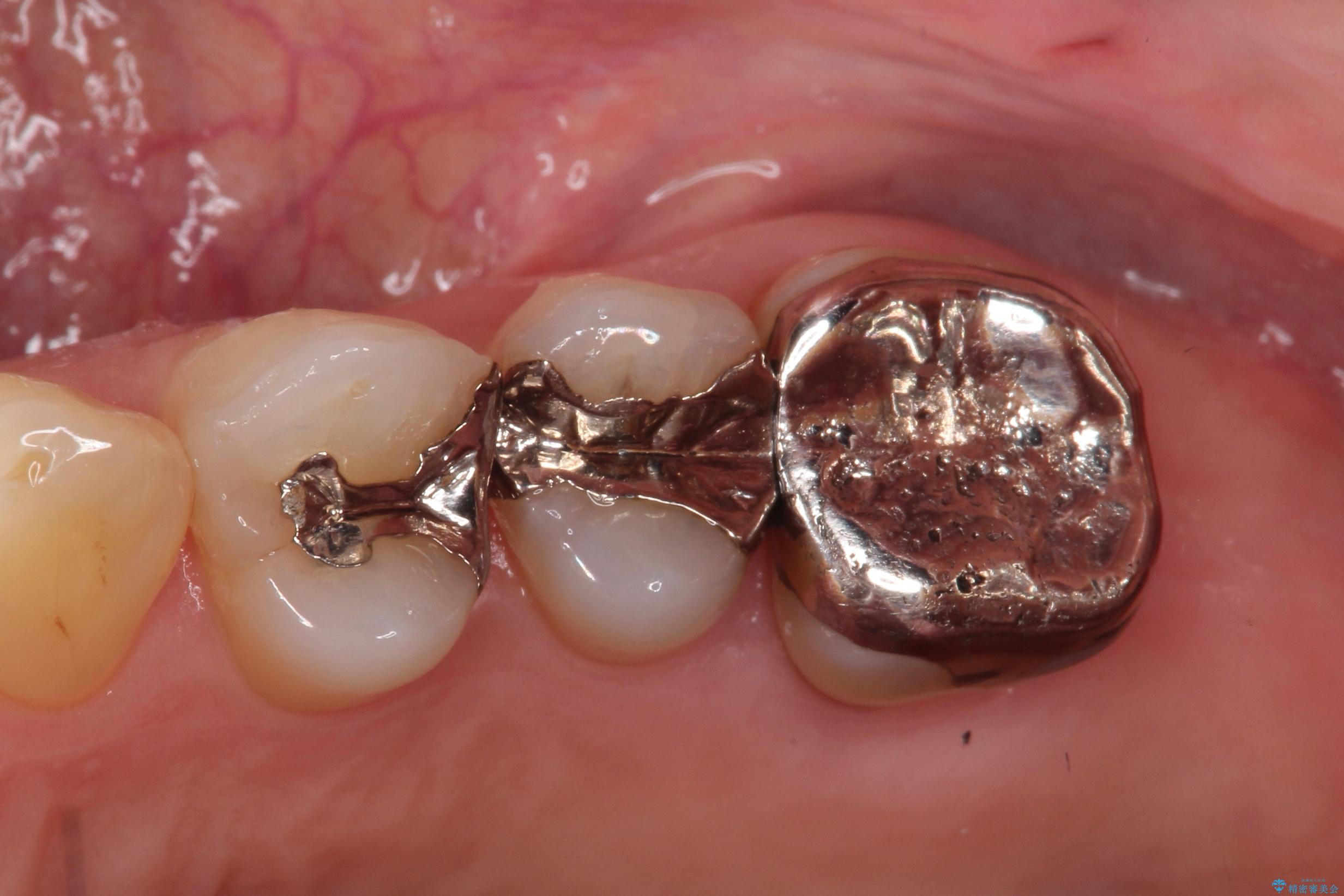 診査の結果、長年使用されていたメタルインレーは経年劣化により適合が悪くなっており、金属の溶け出しによる歯肉の変色や、内部での虫歯再発のリスクも懸念される状態でした。そこで、金属を一切使用しないメタルフリー治療として、耐久性と審美性に優れたセラミックインレーへのやりかえをご提案しました。