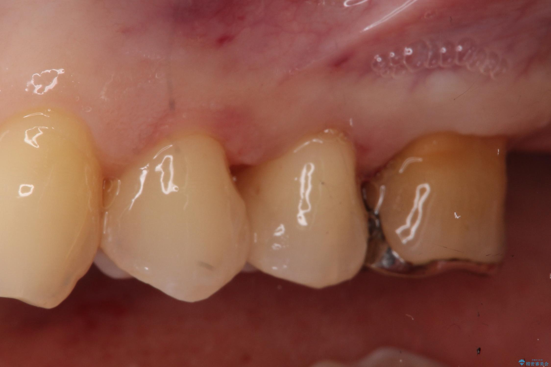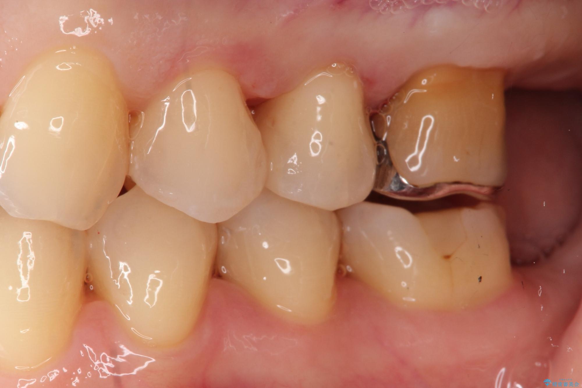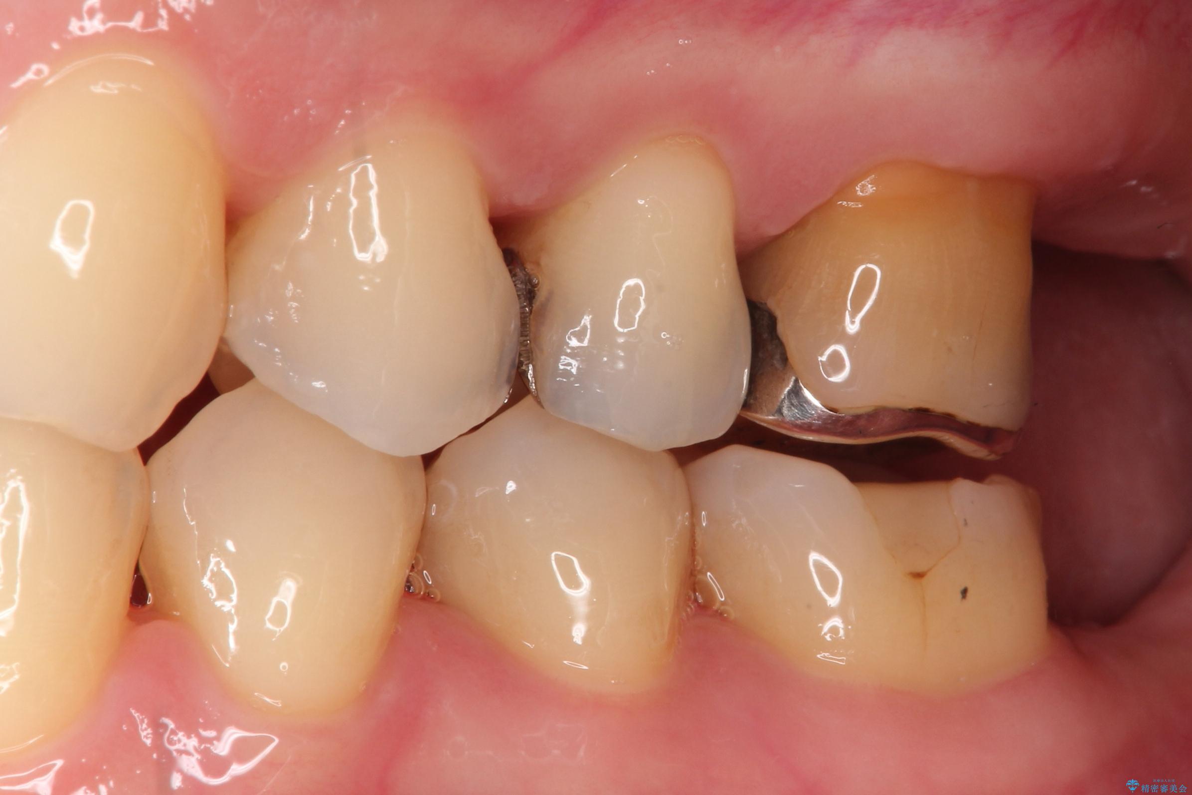 診査の結果、長年使用されていたメタルインレーは経年劣化により適合が悪くなっており、金属の溶け出しによる歯肉の変色や、内部での虫歯再発のリスクも懸念される状態でした。そこで、金属を一切使用しないメタルフリー治療として、耐久性と審美性に優れたセラミックインレーへのやりかえをご提案しました。