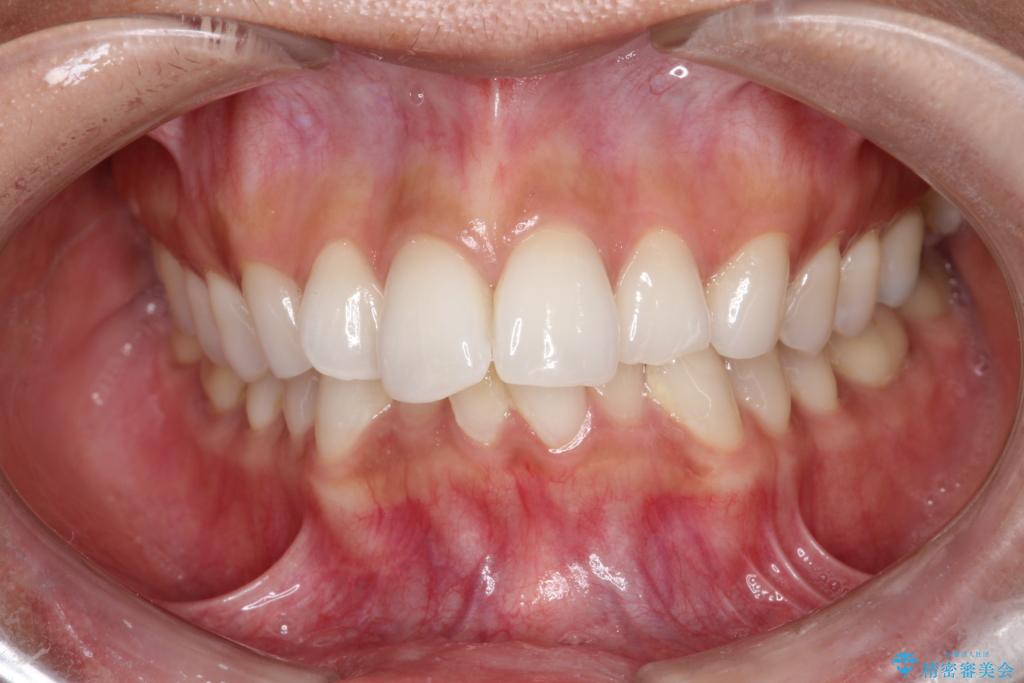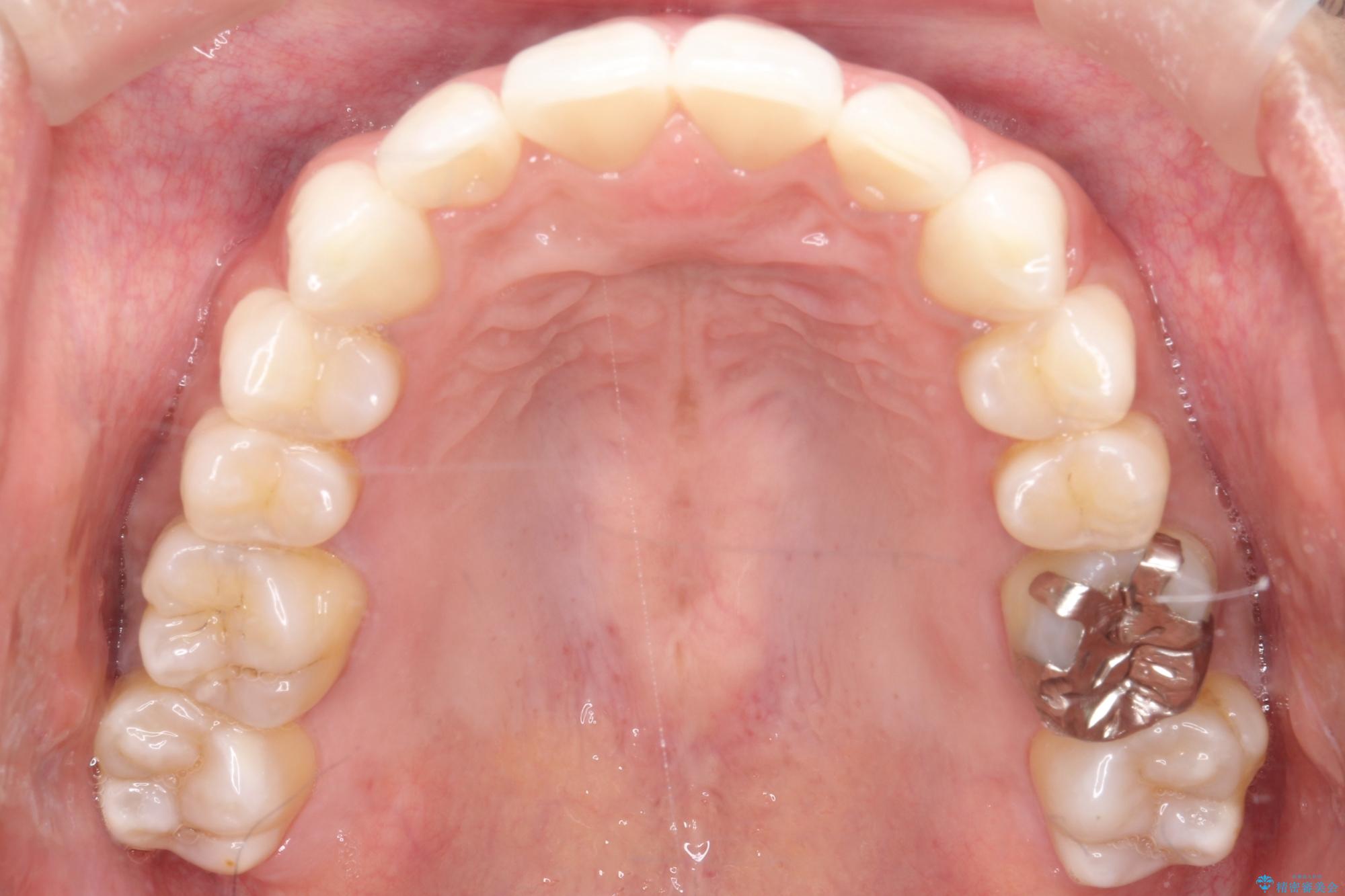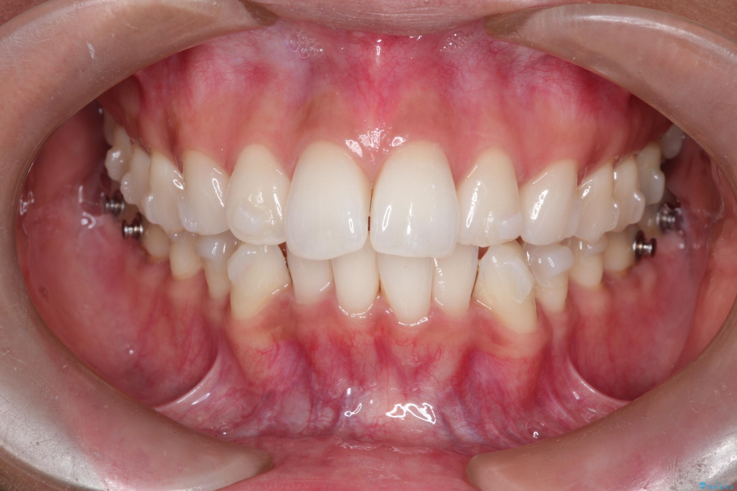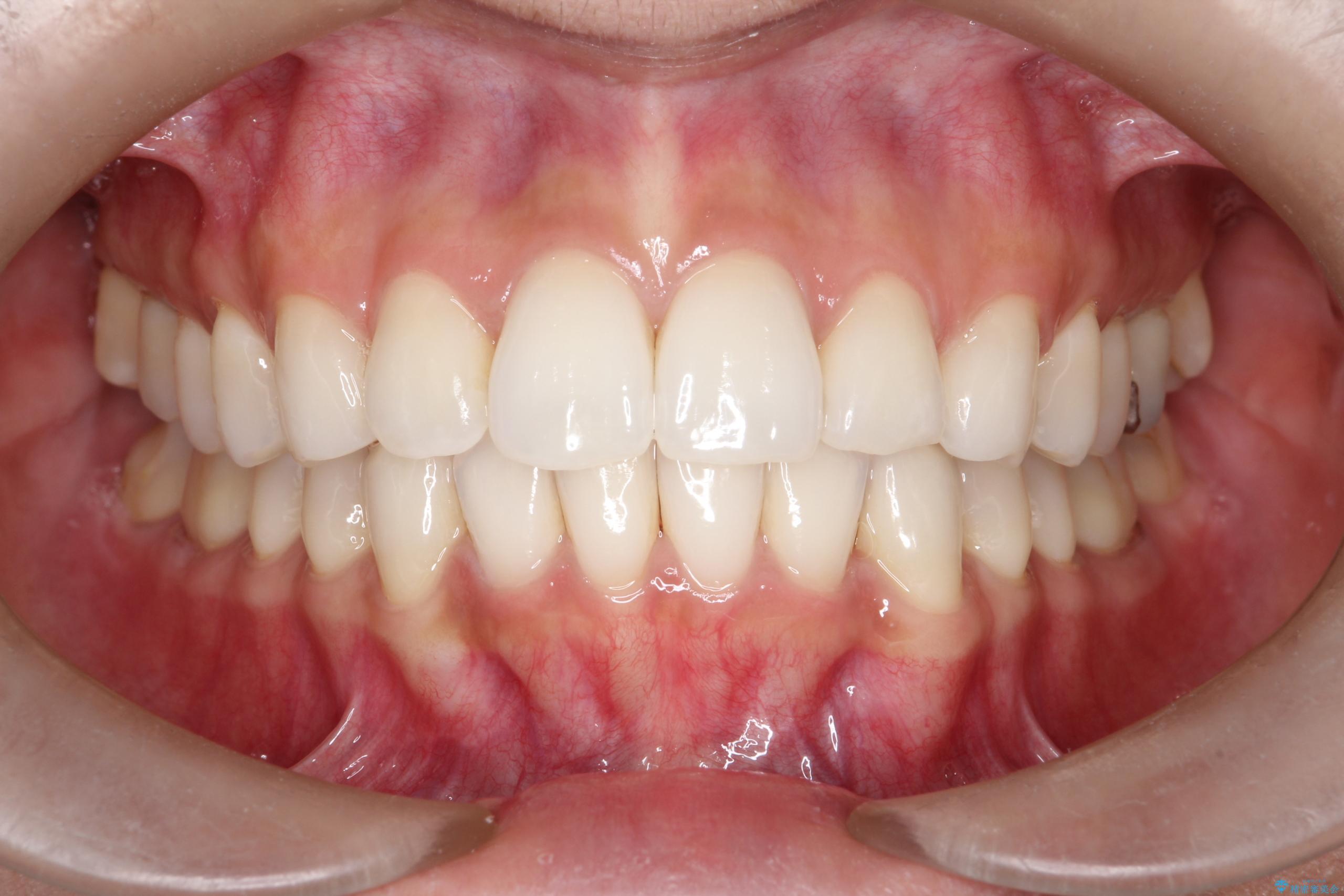1年半の治療期間を経て、重なり合っていた前歯はスムーズに整列し、理想的なアーチ状の歯並びへと改善されました。抜歯を行わずに治療を完了したことで、噛み合わせのバランスを維持しながら、審美性を大きく向上させることができました。現在は保定期間に入り、美しい状態を維持されています。