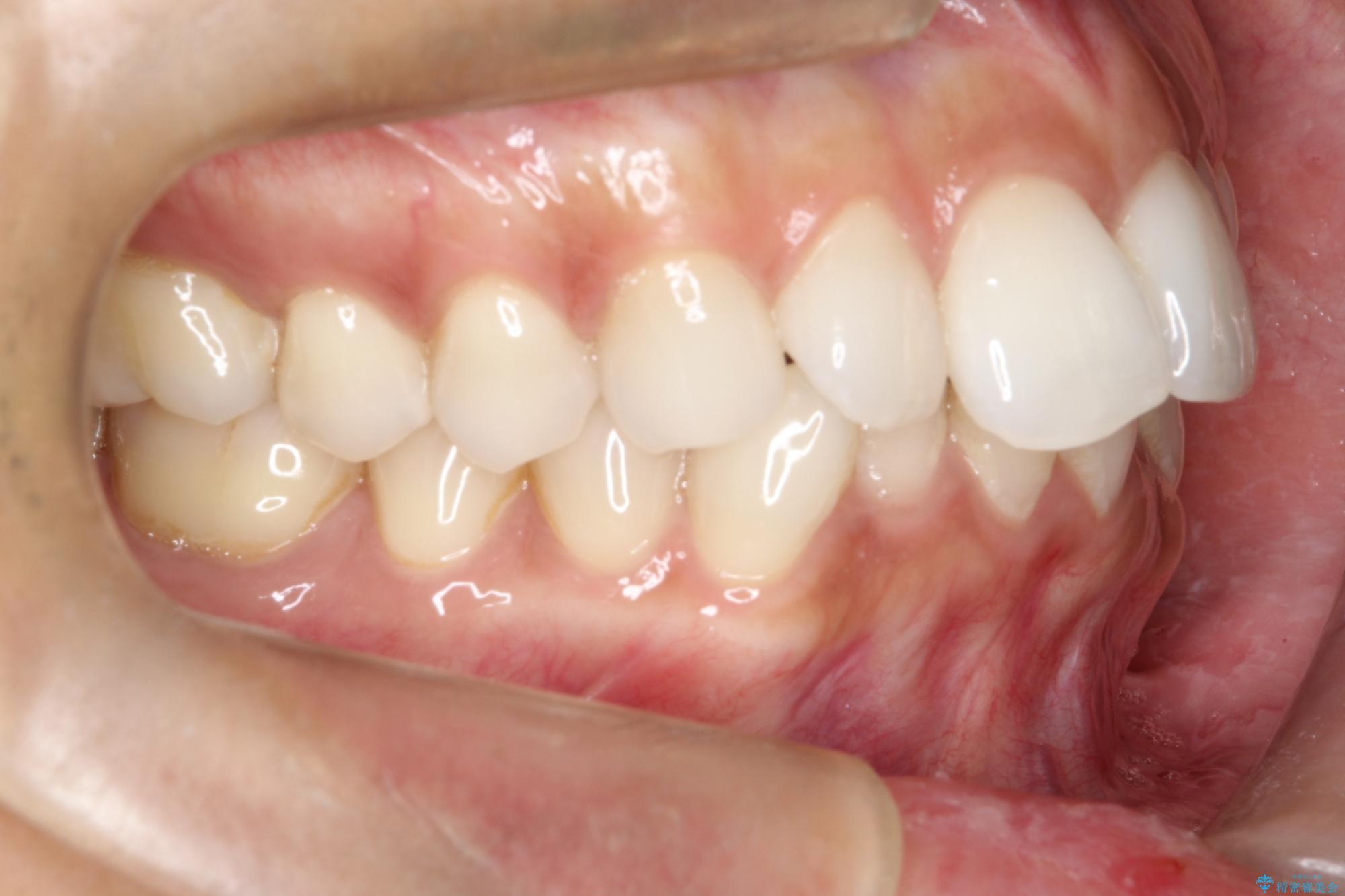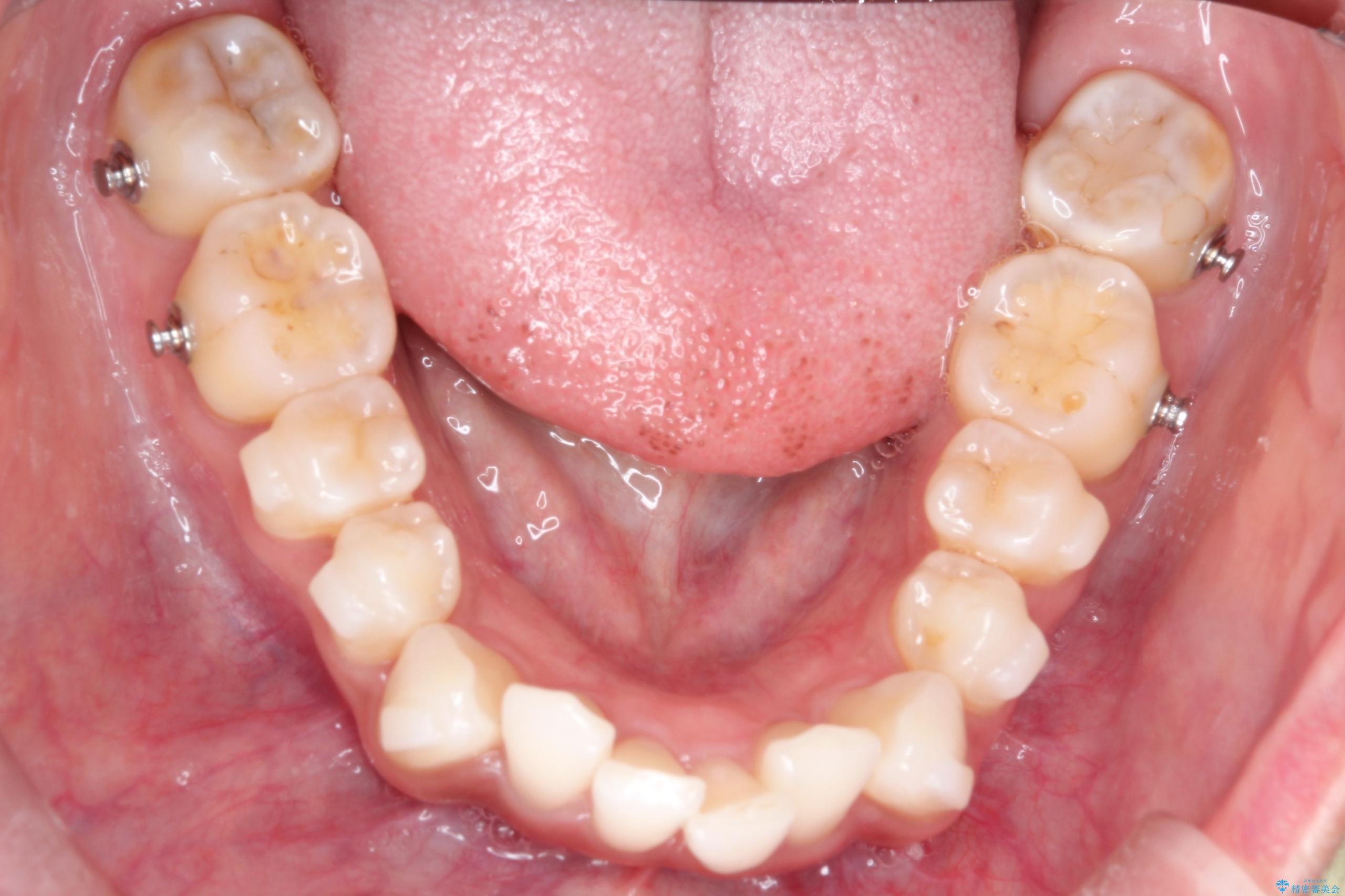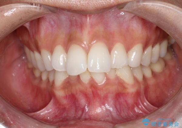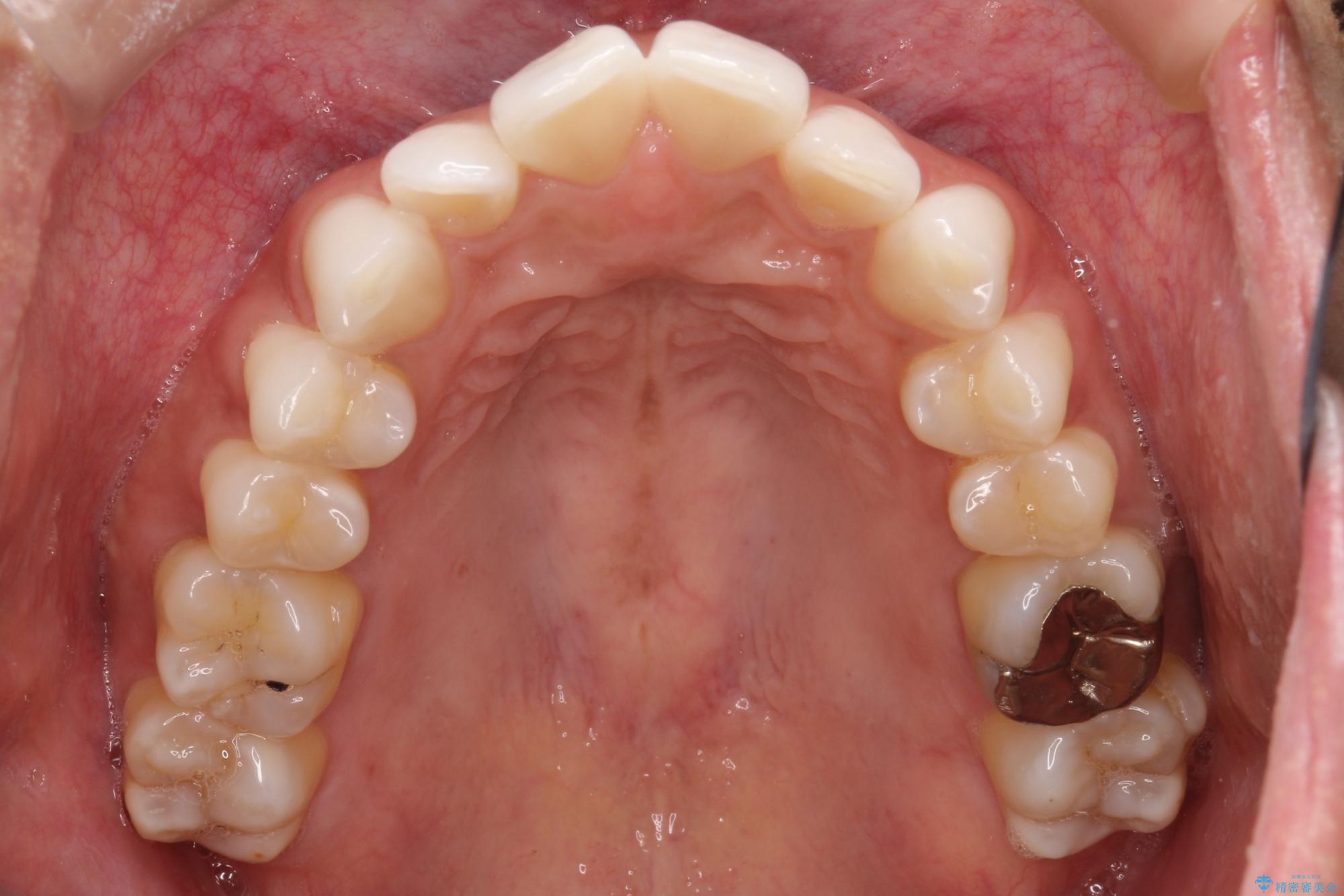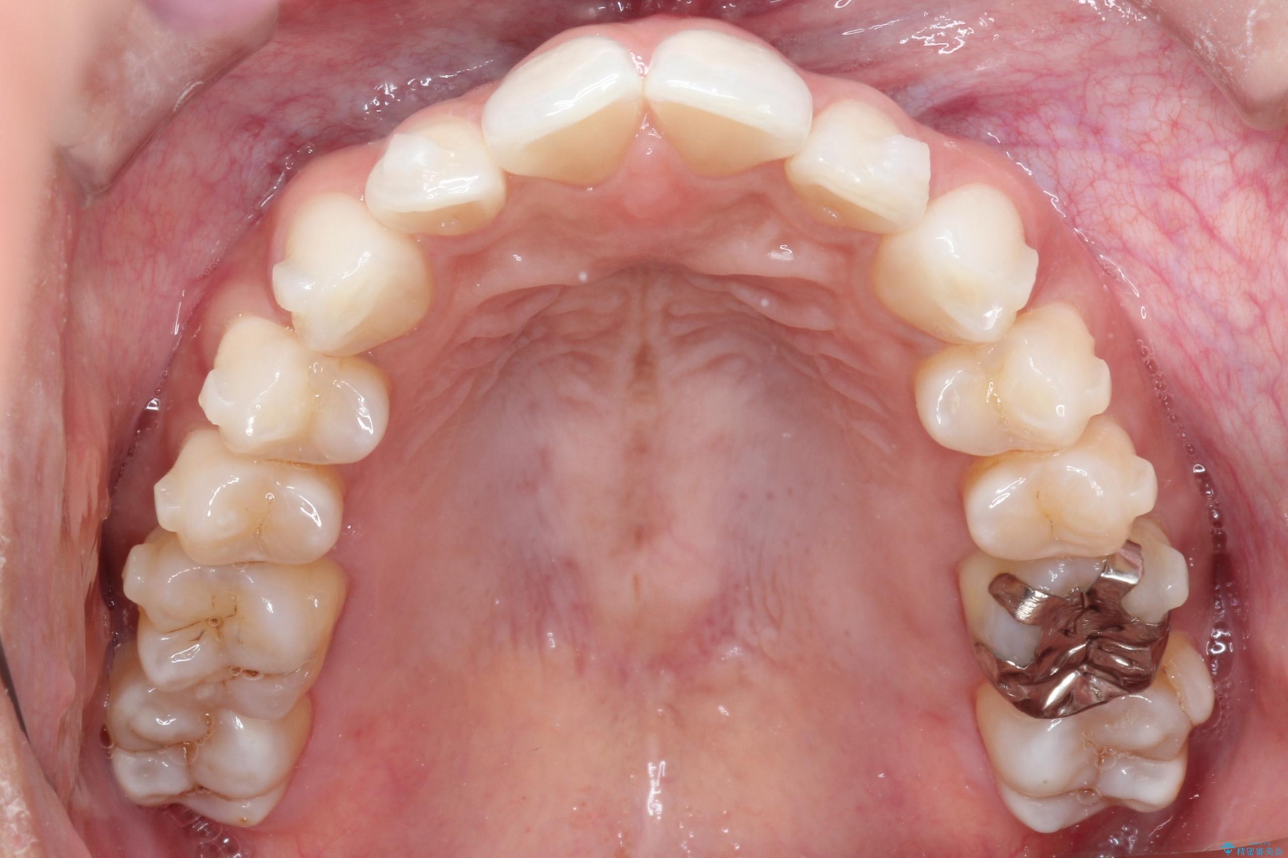 1年半の治療期間を経て、重なり合っていた前歯はスムーズに整列し、理想的なアーチ状の歯並びへと改善されました。抜歯を行わずに治療を完了したことで、噛み合わせのバランスを維持しながら、審美性を大きく向上させることができました。現在は保定期間に入り、美しい状態を維持されています。