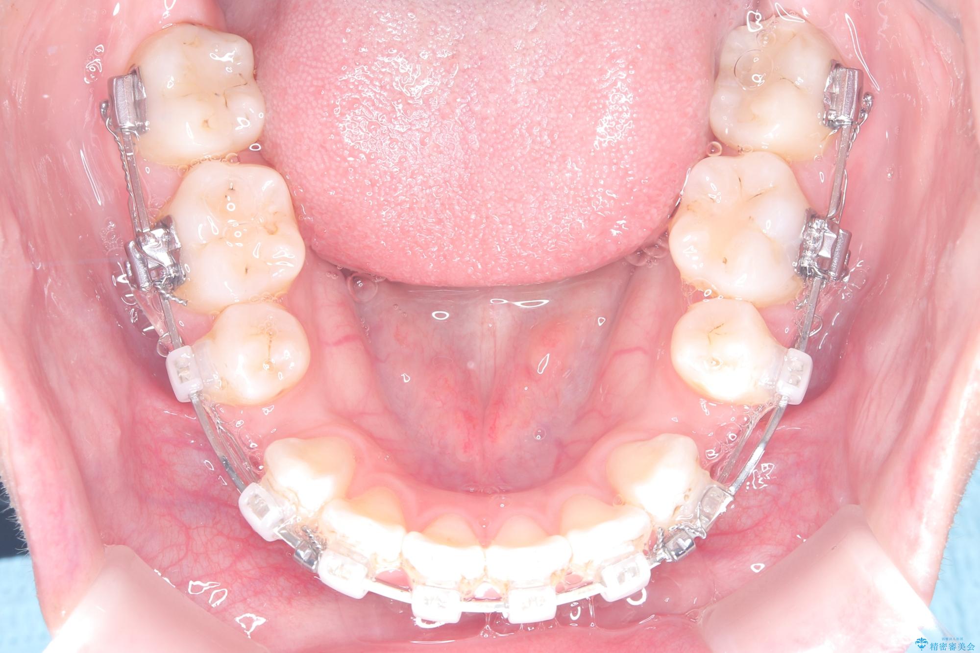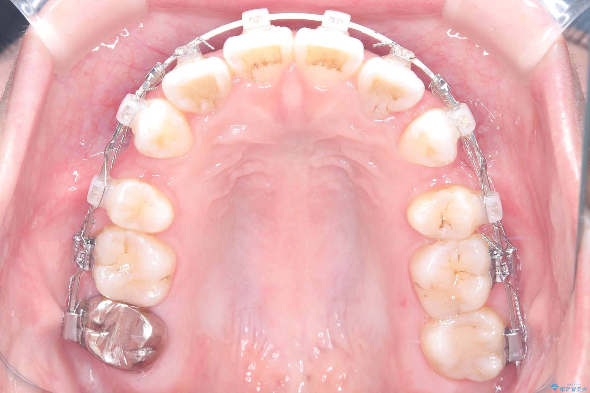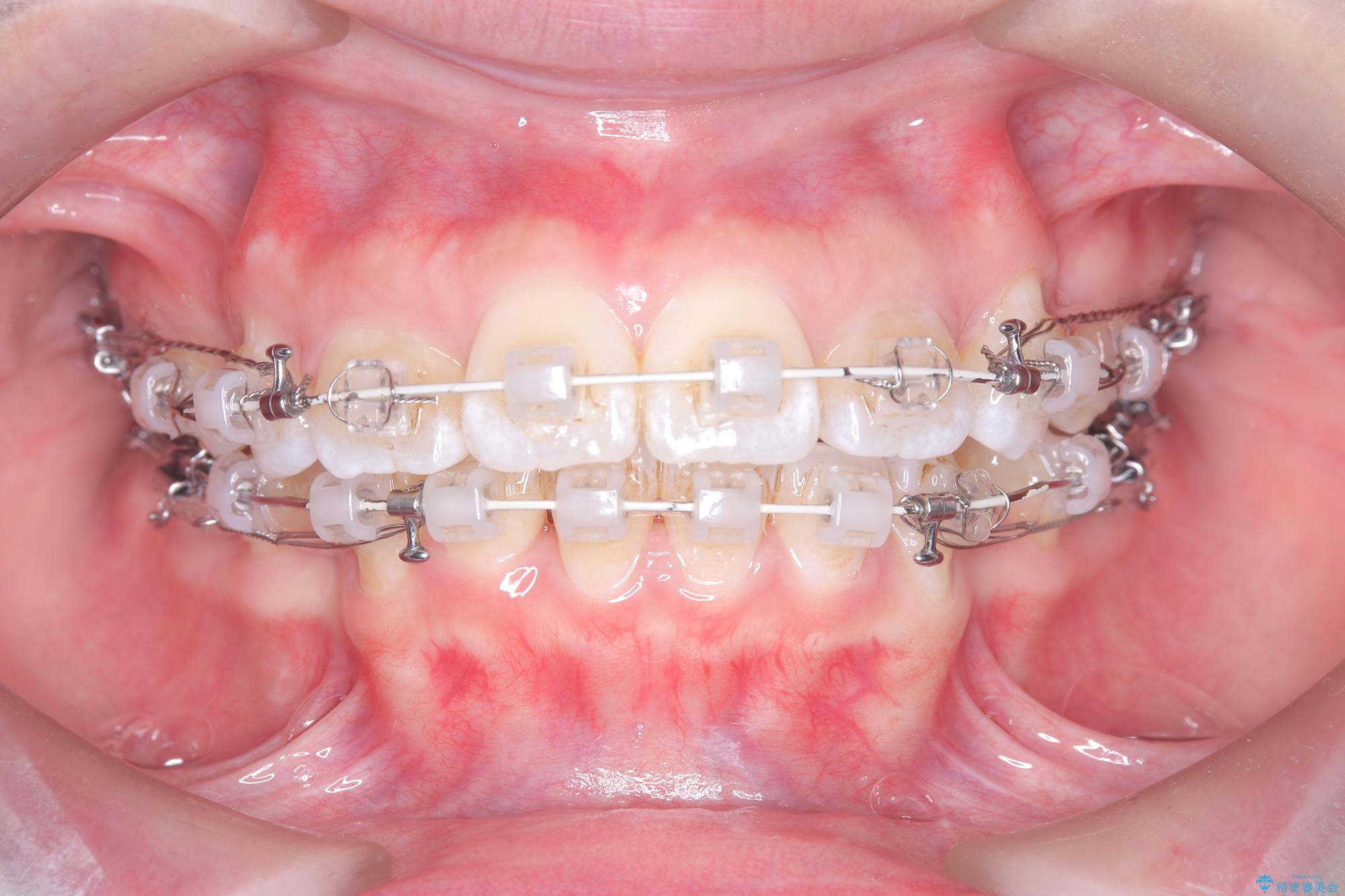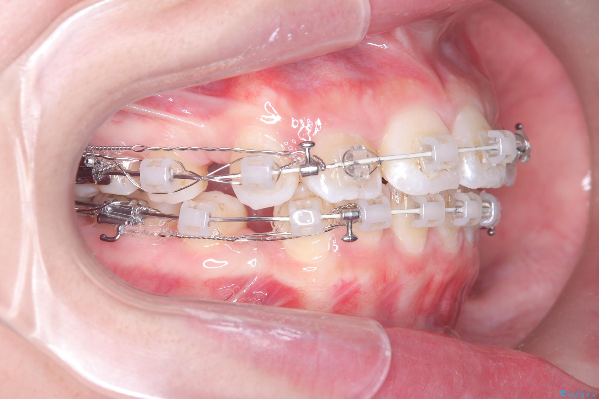 治療は、審美ワイヤーを用いて抜歯スペースを徐々に閉じながら、前歯の角度と位置を精密にコントロールして進められました。ワイヤー矯正は歯を三次元的にしっかりと動かすことができるため、前歯を単に倒すのではなく、根元から理想的な位置へと誘導しました。