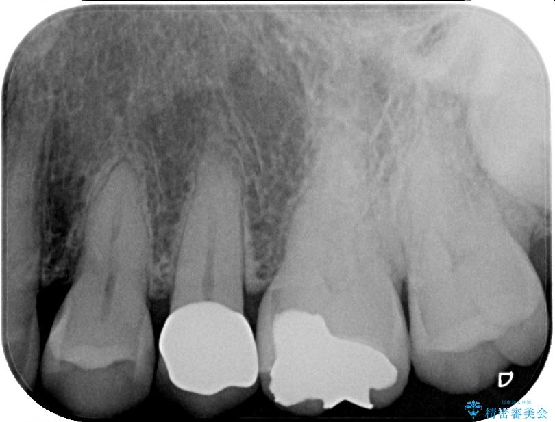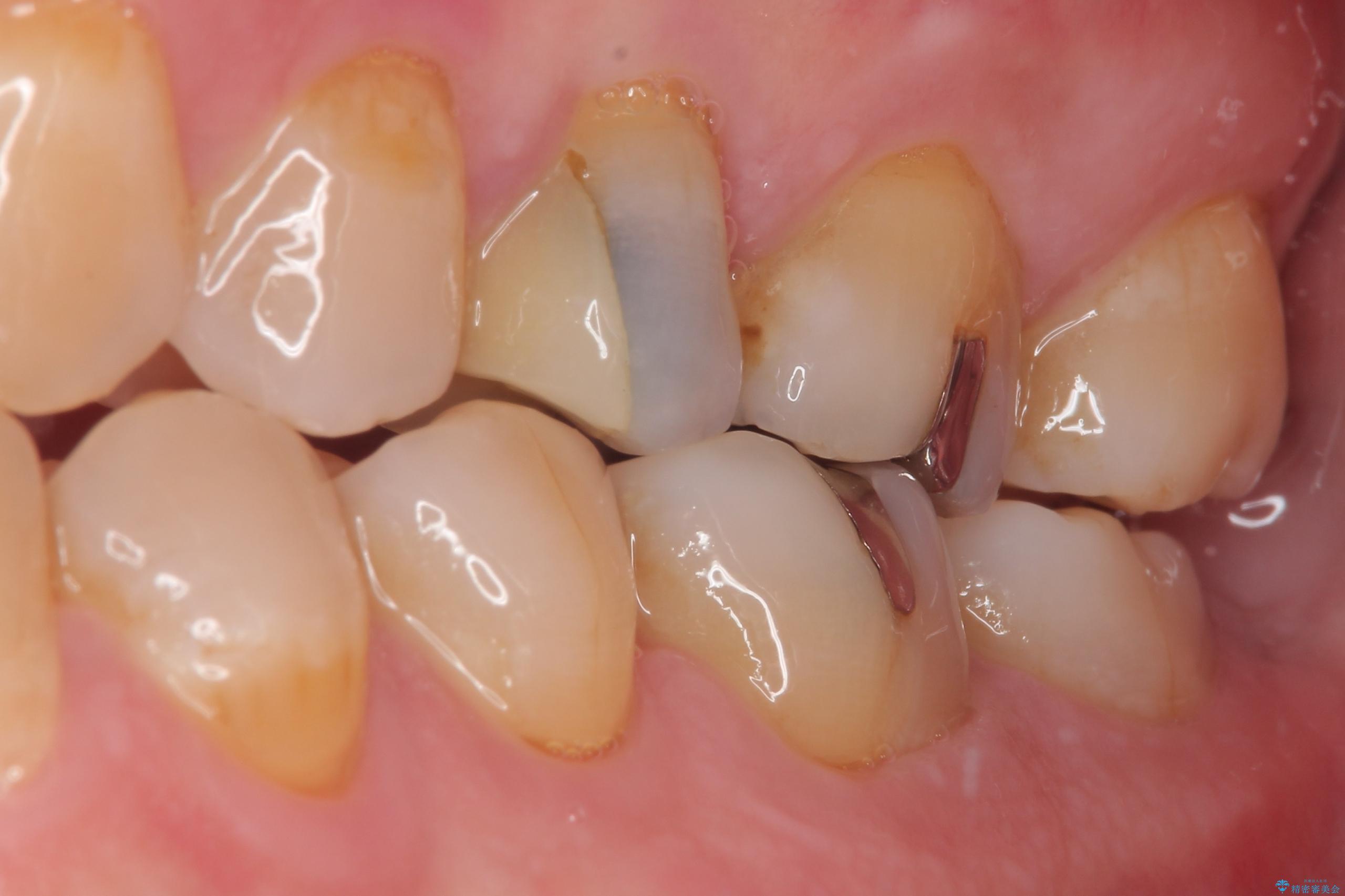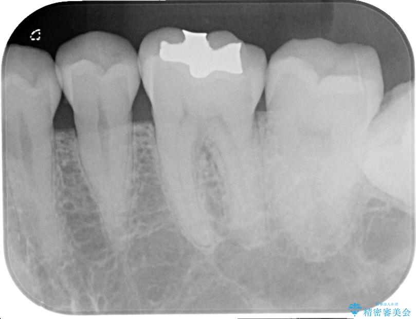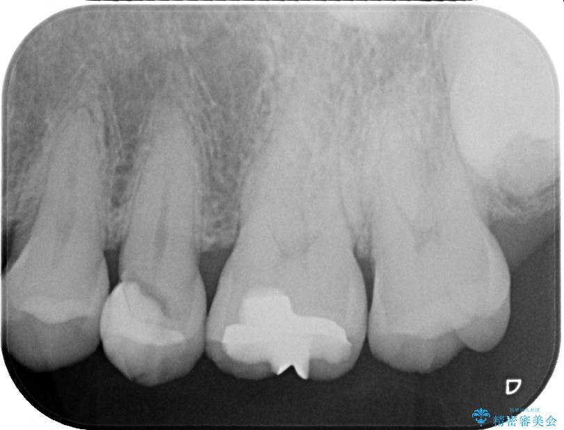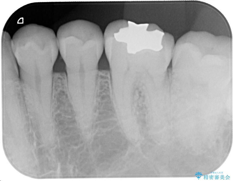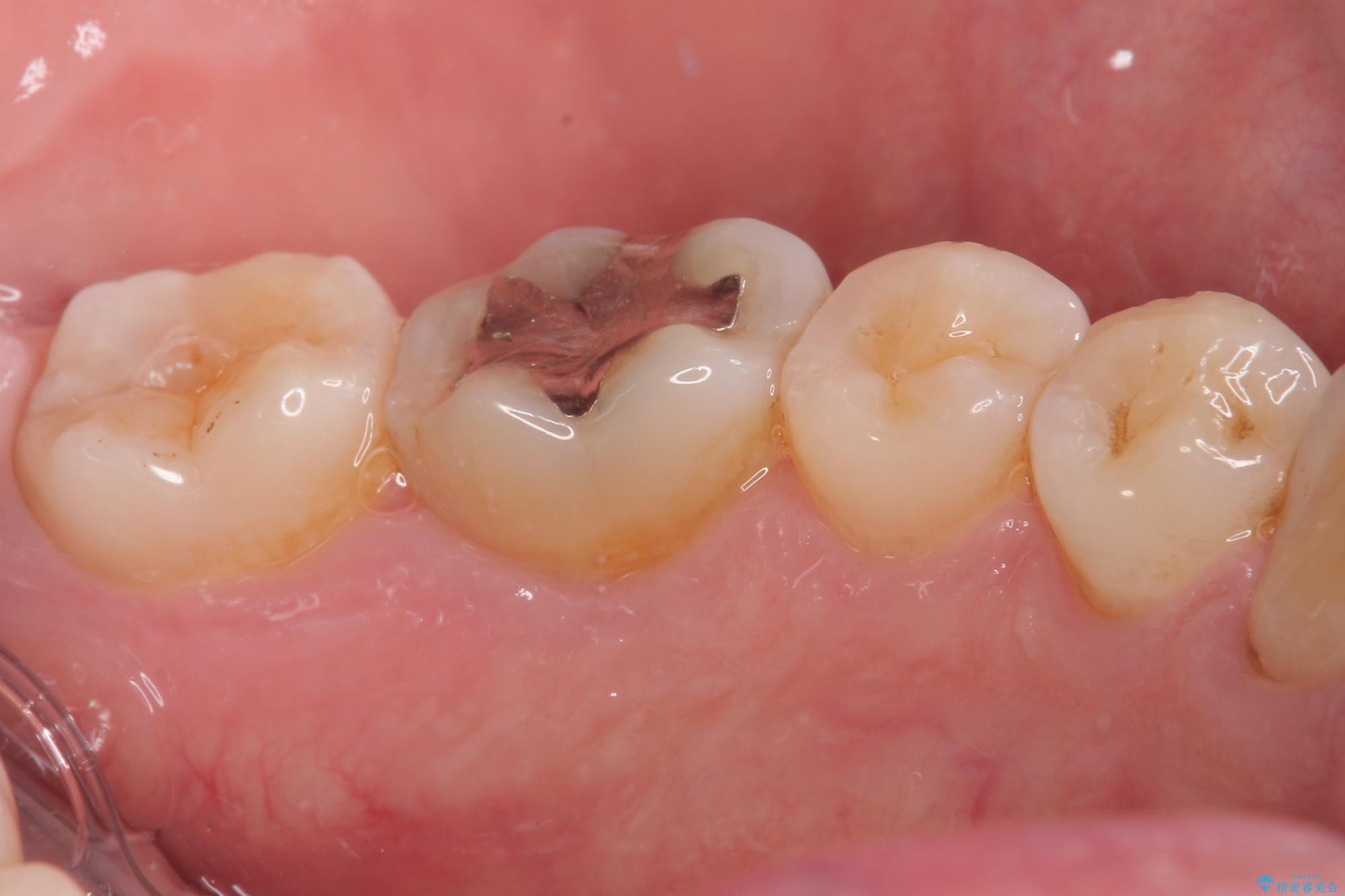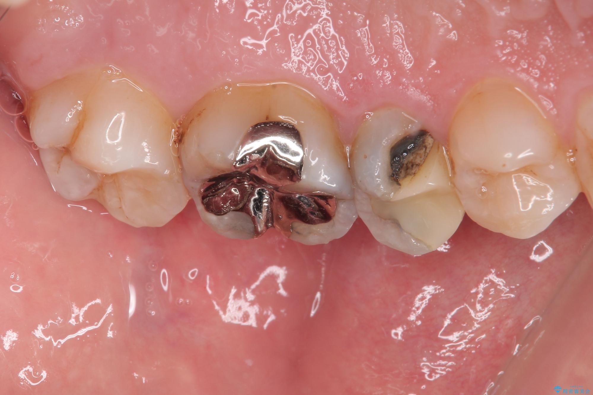精密検査を行ったところ、上顎左側第二小臼歯のインレー(詰め物)が欠け、その内部に虫歯が進行している状態でした。幸いにも虫歯は神経まで達しておらず、神経を残した治療が可能と判断しました。