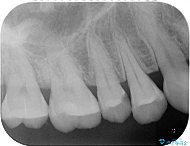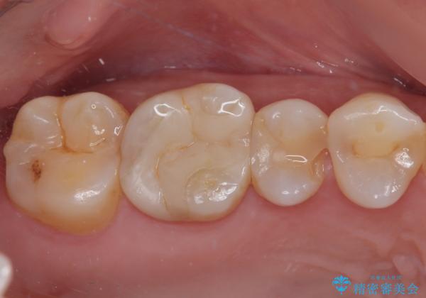 診察の結果、上顎右側第二小臼歯に装着されていた詰め物の一部が欠けている状態でした。一見すると小さな欠けに見えますが、詰め物が破損した部分はプラーク(歯垢)が非常に溜まりやすく、虫歯の再発リスクが高い状態になります。