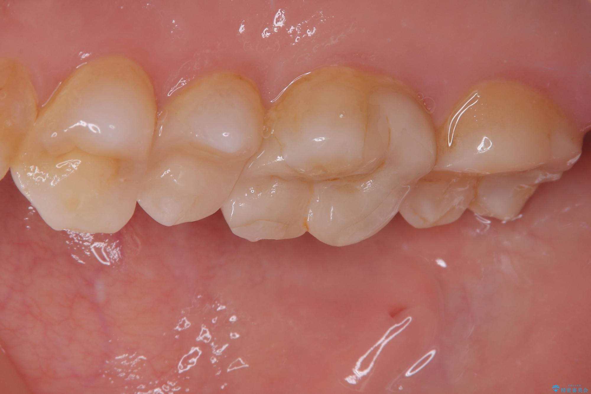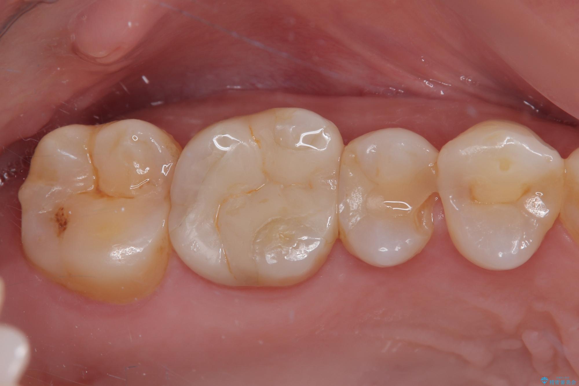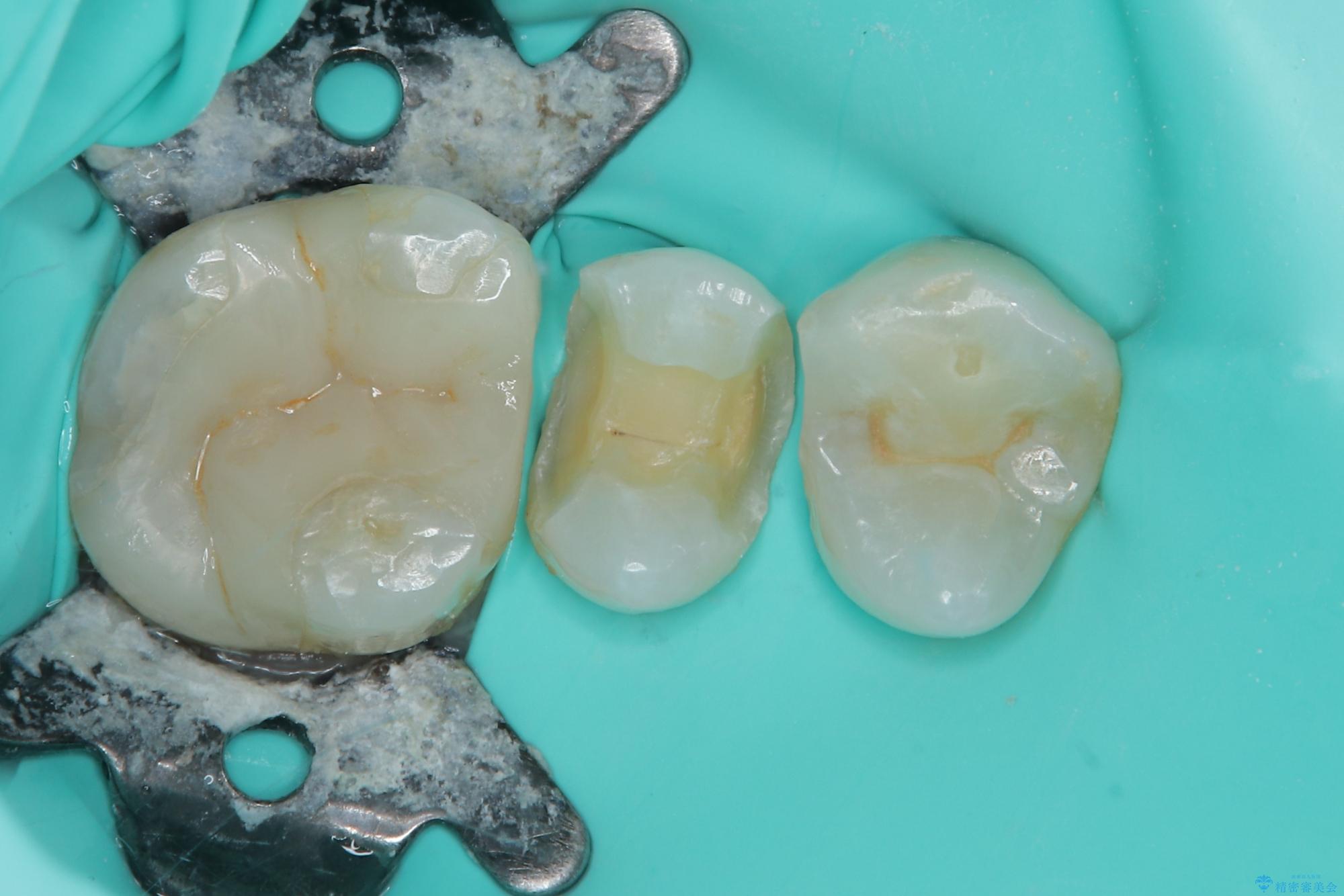 まず、欠けていた詰め物と、その下に存在していた虫歯をすべて丁寧に除去しました。その後、適合性・耐久性・審美性に優れたセラミックインレーを用いて修復処置を行いました。