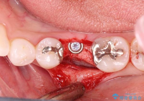 - 保存不可能な歯の抜歯後、待時にてインプラントを埋入、2回法にて咬合回復を計画した。