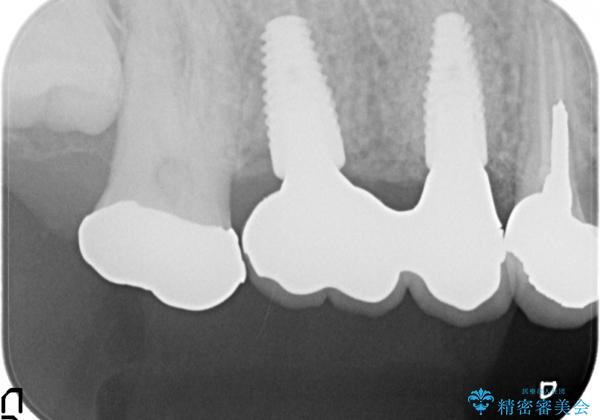 右上の567ブリッジを外したところ、右上5は歯根破折により保存不可能だったため、右上56部にインプラントを埋入し欠損補綴を行いました。