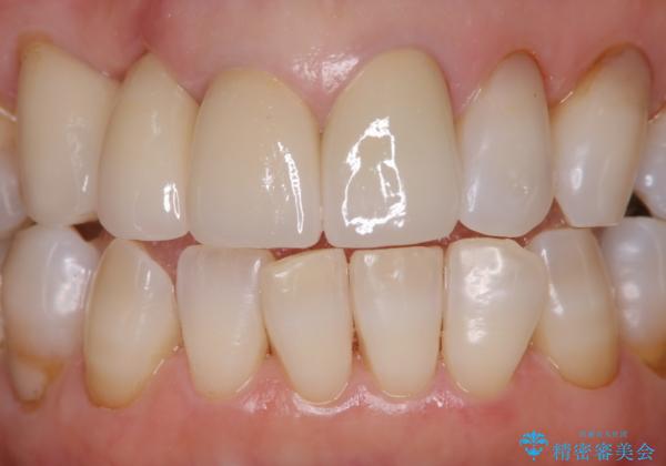 歯の表面にべったりと分厚い歯石があり、その上に着色もついていました。今回は歯石や着色の量が多かったためクリーニングは60分コースで行いました。