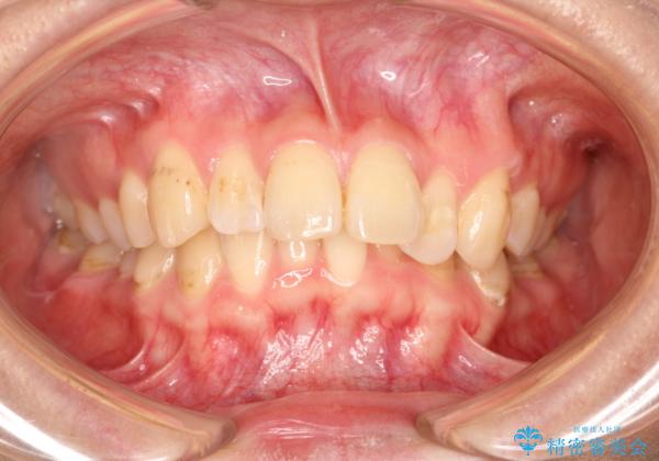 - 初診時には上顎前歯の突出、前歯部の深いかみ合わせ、叢生が見られる状態でした。