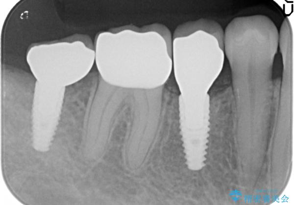 右下7は欠損しており、右下5は保存不可能だったため、インプラントによる欠損補綴を行いました。