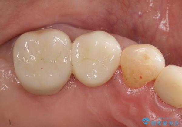 最後方臼歯は根尖部まで歯周病が進行しており、抜歯を行なったのち、残存歯は歯周外科を行なったのちオールセラミッククラウンにて修復治療を行なっています。