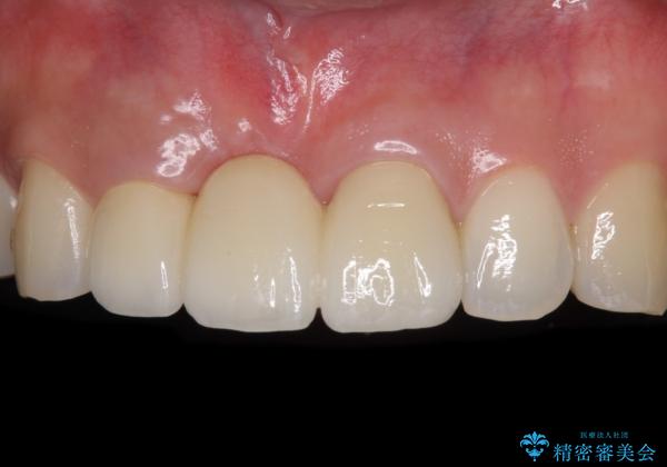 歯肉移植により歯肉ラインや歯の形態を整えることができ、ブリッジによる補綴としたことで舞えば全体の色調を整えることができました。