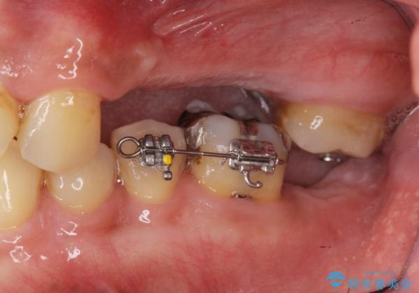 ・対合歯の欠損による歯の挺出→マイクロインプラントを用いた小矯正を行うことで咬合平面を是正