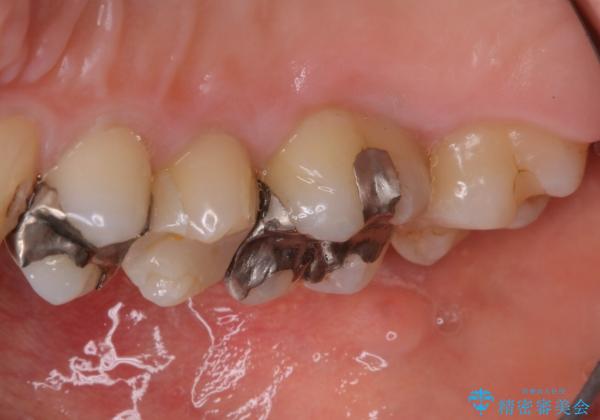 歯の表面に、茶色く色が残っている所がありますが、これは詰め物の変色の所と、虫歯になっている所です。以前に、CR(コンポジットレジン)による虫歯治療がされています。