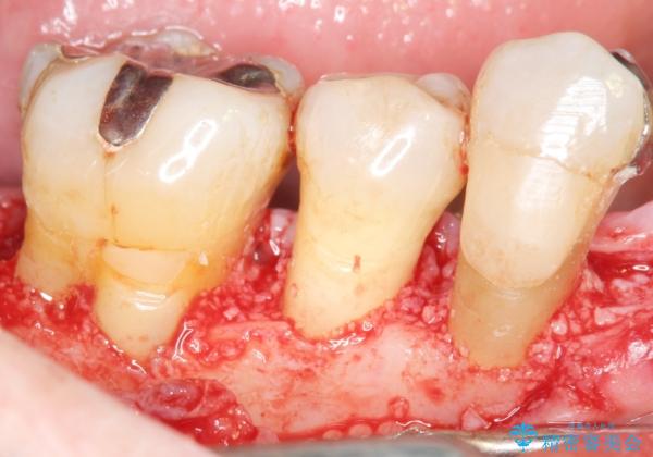 再生療法から1年後、リエントリー手術により骨の再生を確認し、骨外科処置(骨を平らにして歯周ポケットの根本的な改善を図る処置)を行いました。